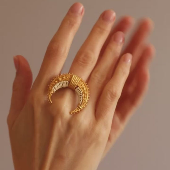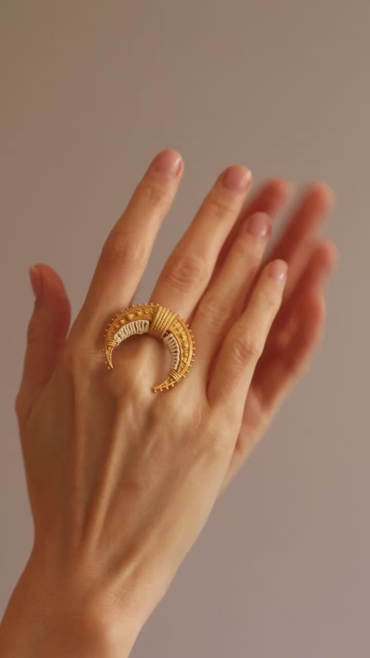 Embossed moon (domed on the outside, and empty inside for perfect lightness) and embroidered with off-white raffia