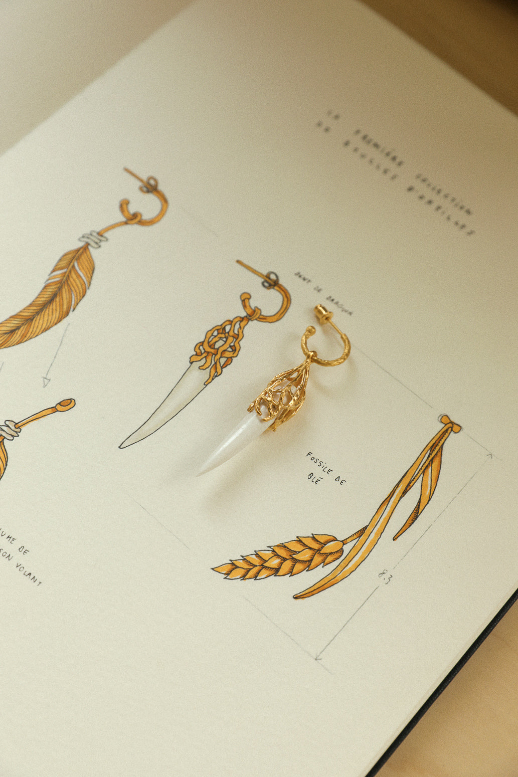 Two small hammered hoop earrings, from which hang pretty roots holding the tooth of an endangered dragon, who was afraid of losing them* (a white agate cut into a round shape).