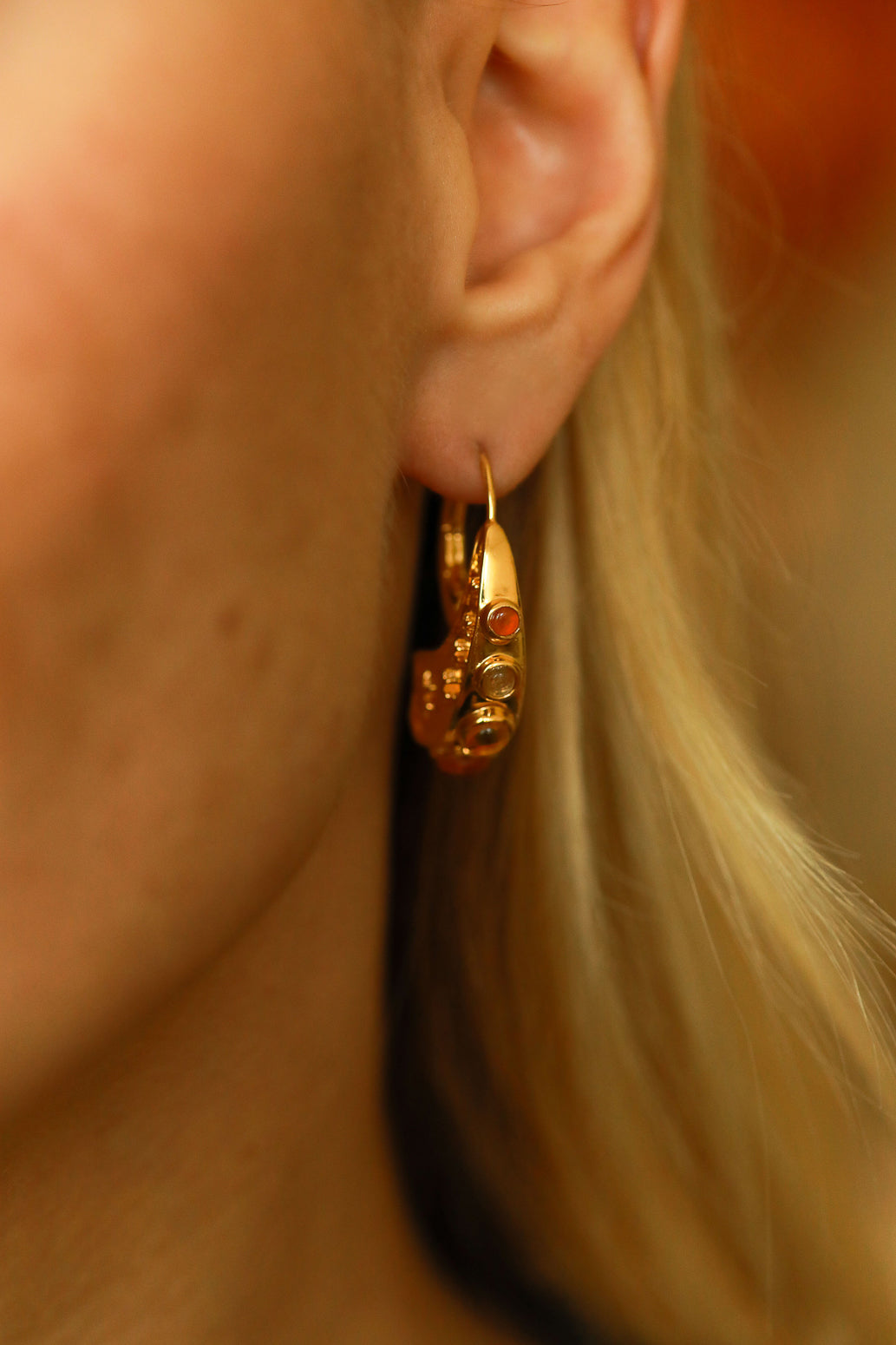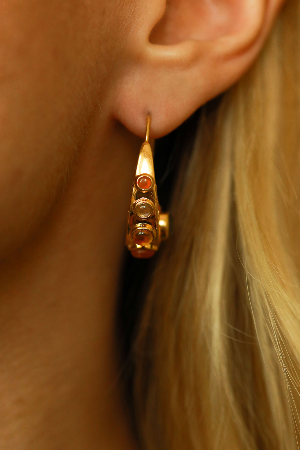Encrusted with semi-precious stones: labradorite (blue-grey), citrine (transparent yellow) and carnelian (orange), clip clasp