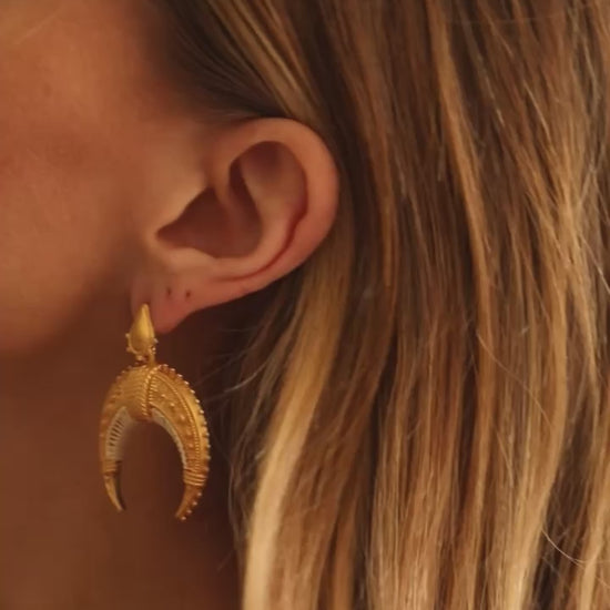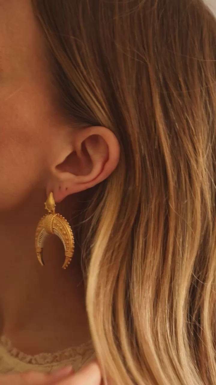 Our MOUN earrings are embossed (the back of our earrings is hollow to ensure their lightness), engraved with small drops symbolizing water, its element. Planet of emotions, I designed it attached with ropes, as if to hold it, or our part of dream, unconscious, imagination.