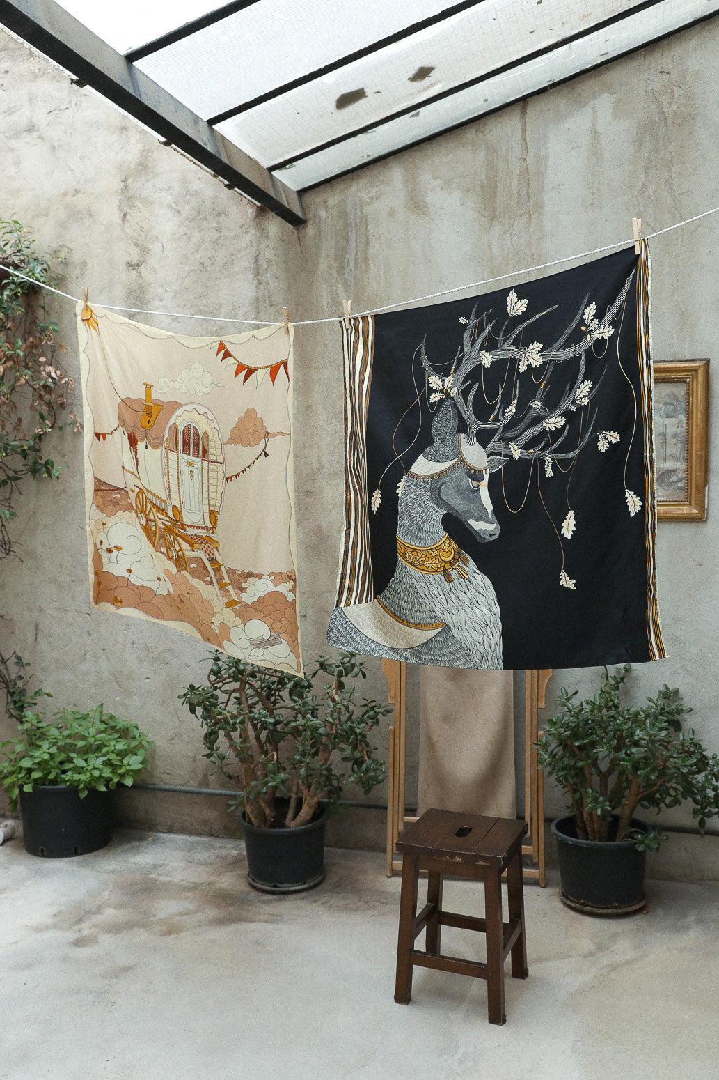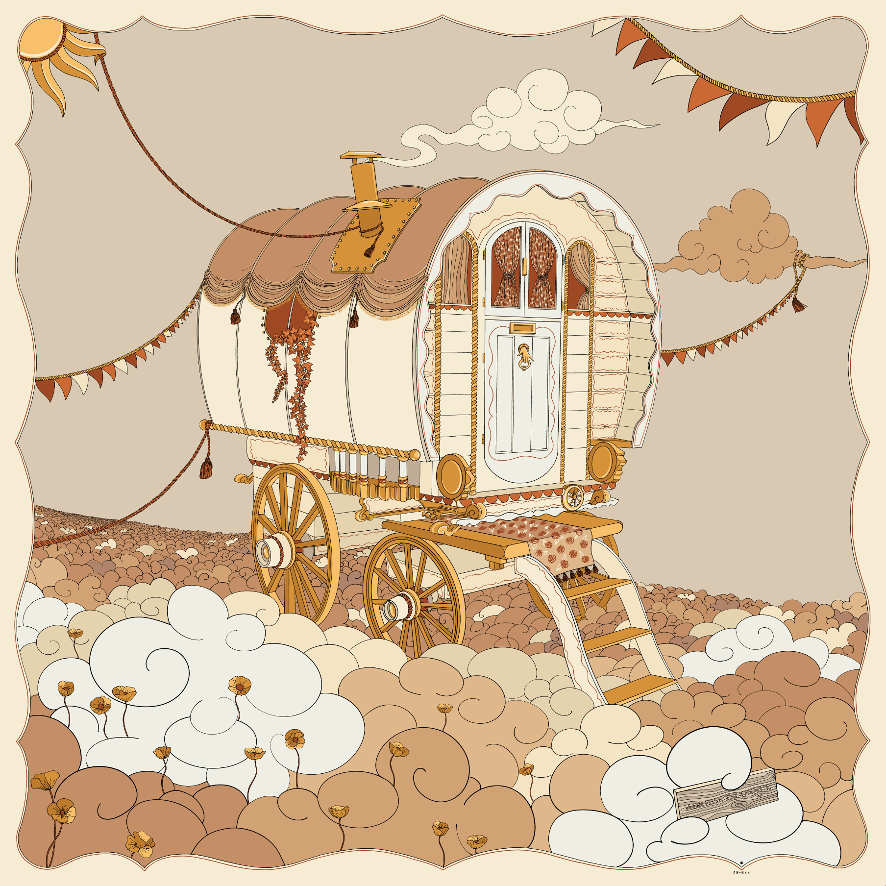 Out of Time. Off the beaten track. The old-fashioned sound of hand-painted wooden wheels, laboriously rolling somewhere above ground. A caravan that might have come from the wrong era, but strong in its lack of destination. It rolls, towards life. Freedom. The absence of constraints. Like us when, from time to time, we dream of another life. Don't look for it, you won't find it. Because in my dreams there is no address. Dimensions: 110cm x 110cm Finishes: flat hem Designed, printed and made in France