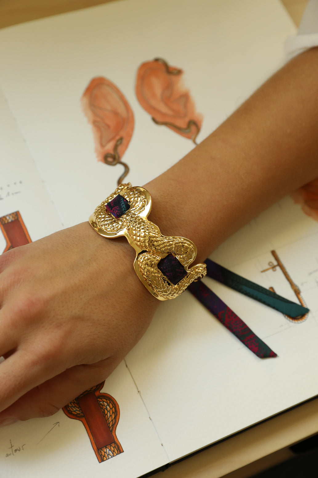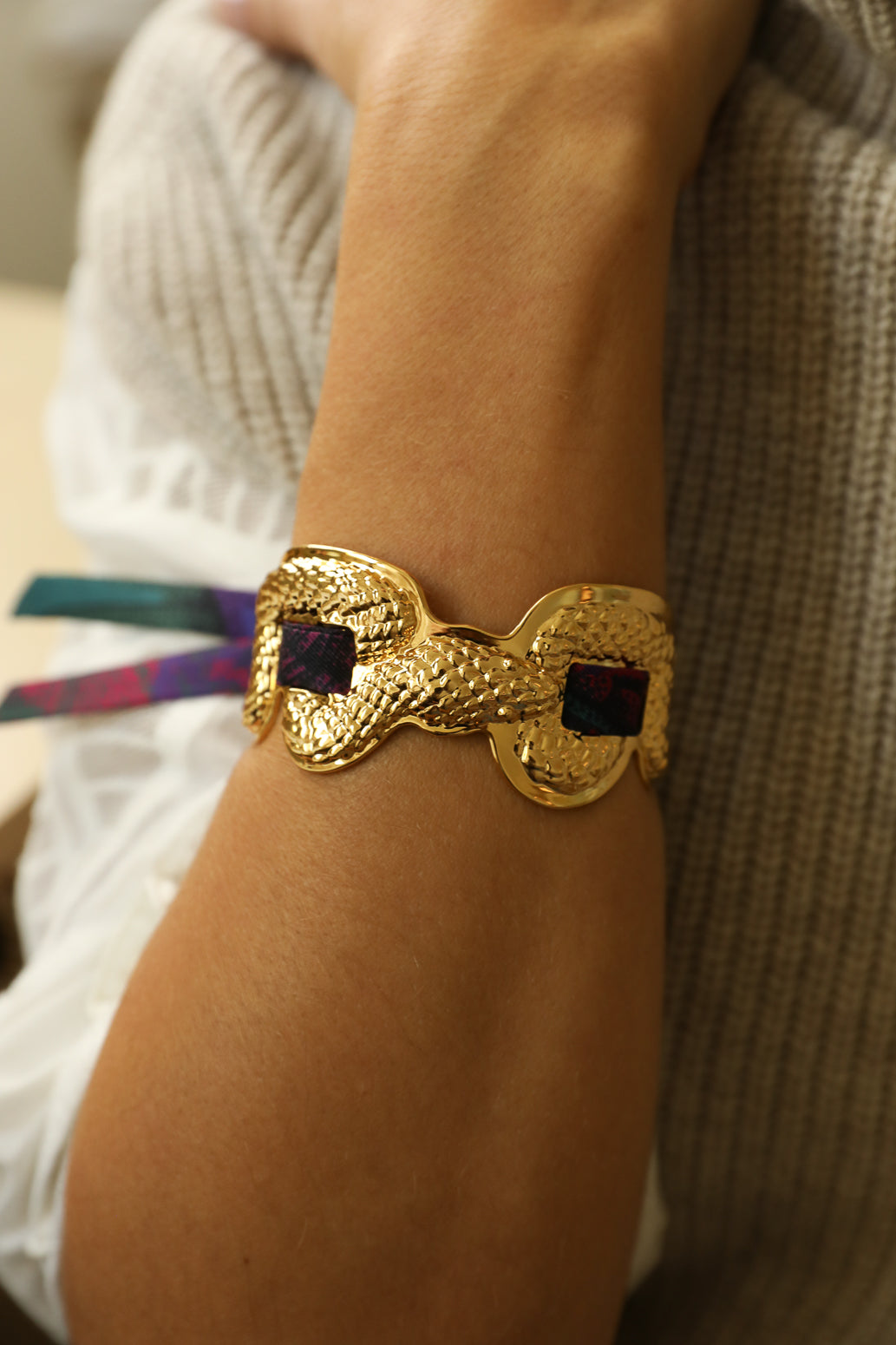 A toutes les amoureuses des symboles rock comme le Serpent, mais aussi les fans de bijoux sculpturaux qui ne passent pas inaperçus : notre manchette est faite pour vous. Oui, la soie est plus anecdotique une fois tissée dans cette manchette, mais elle lui apporte cette petite touche de couleur pour encore plus de caractère !