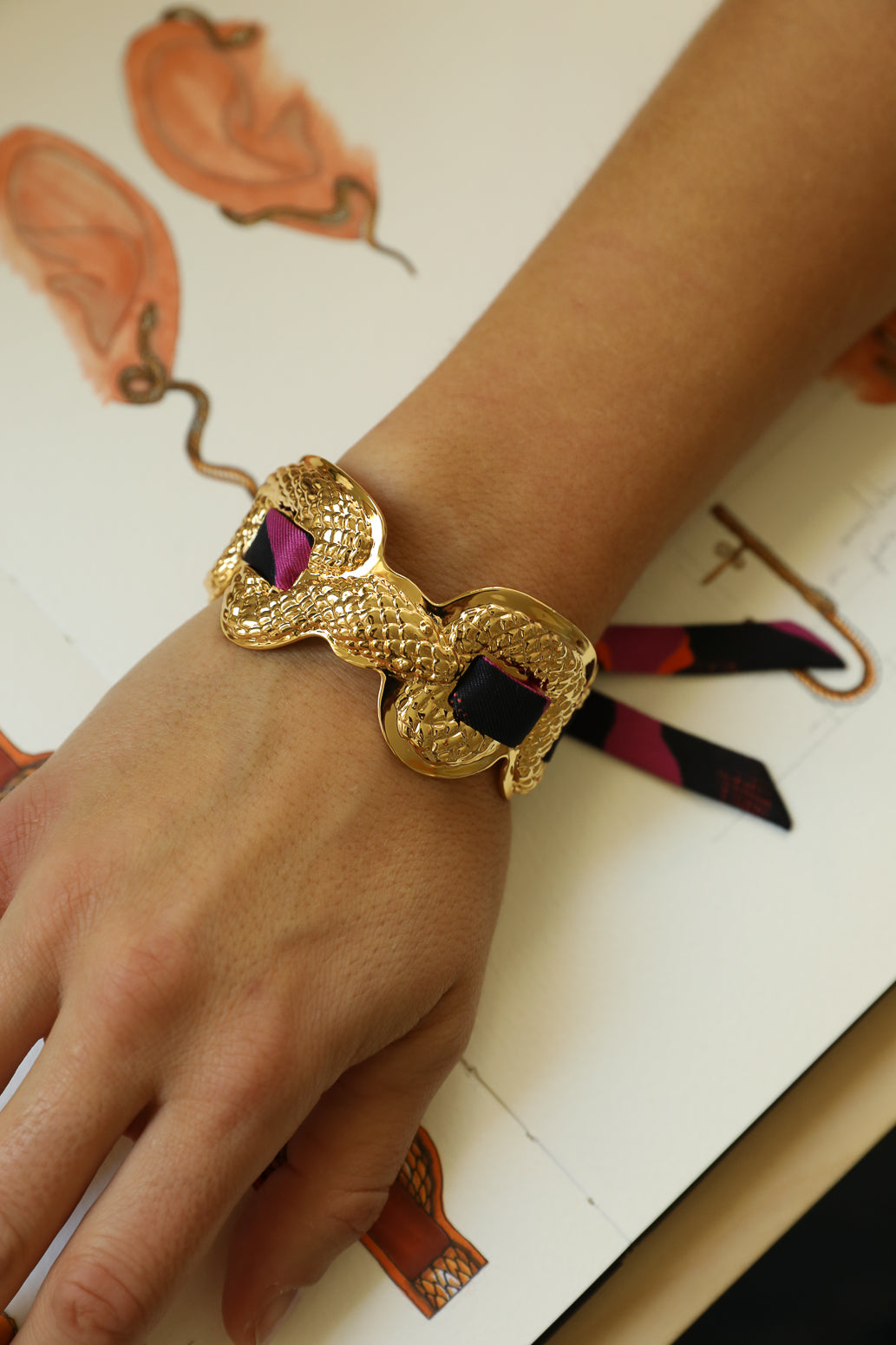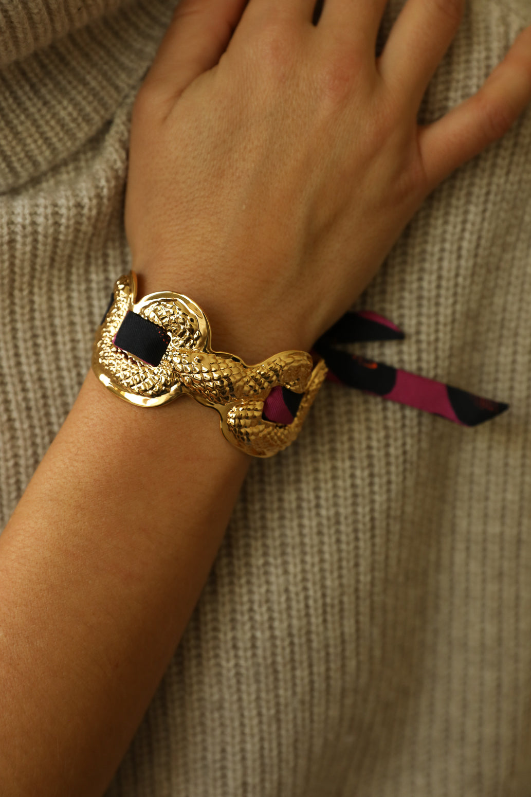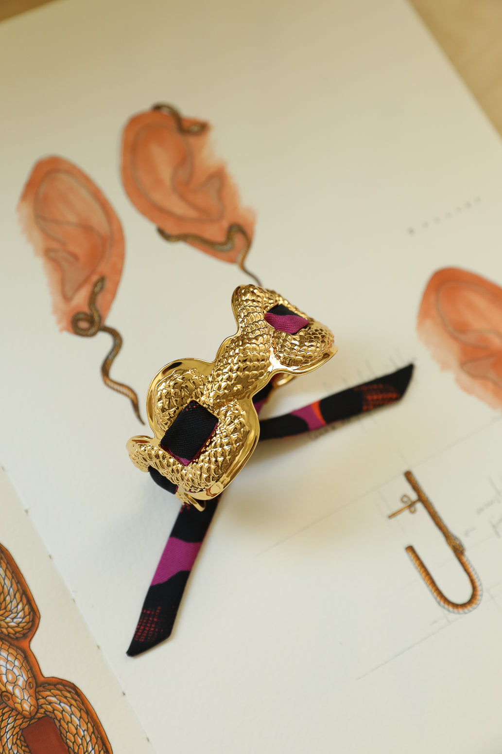 A toutes les amoureuses des symboles rock comme le Serpent, mais aussi les fans de bijoux sculpturaux qui ne passent pas inaperçus : notre manchette est faite pour vous. Oui, la soie est plus anecdotique une fois tissée dans cette manchette, mais elle lui apporte cette petite touche de couleur pour encore plus de caractère !