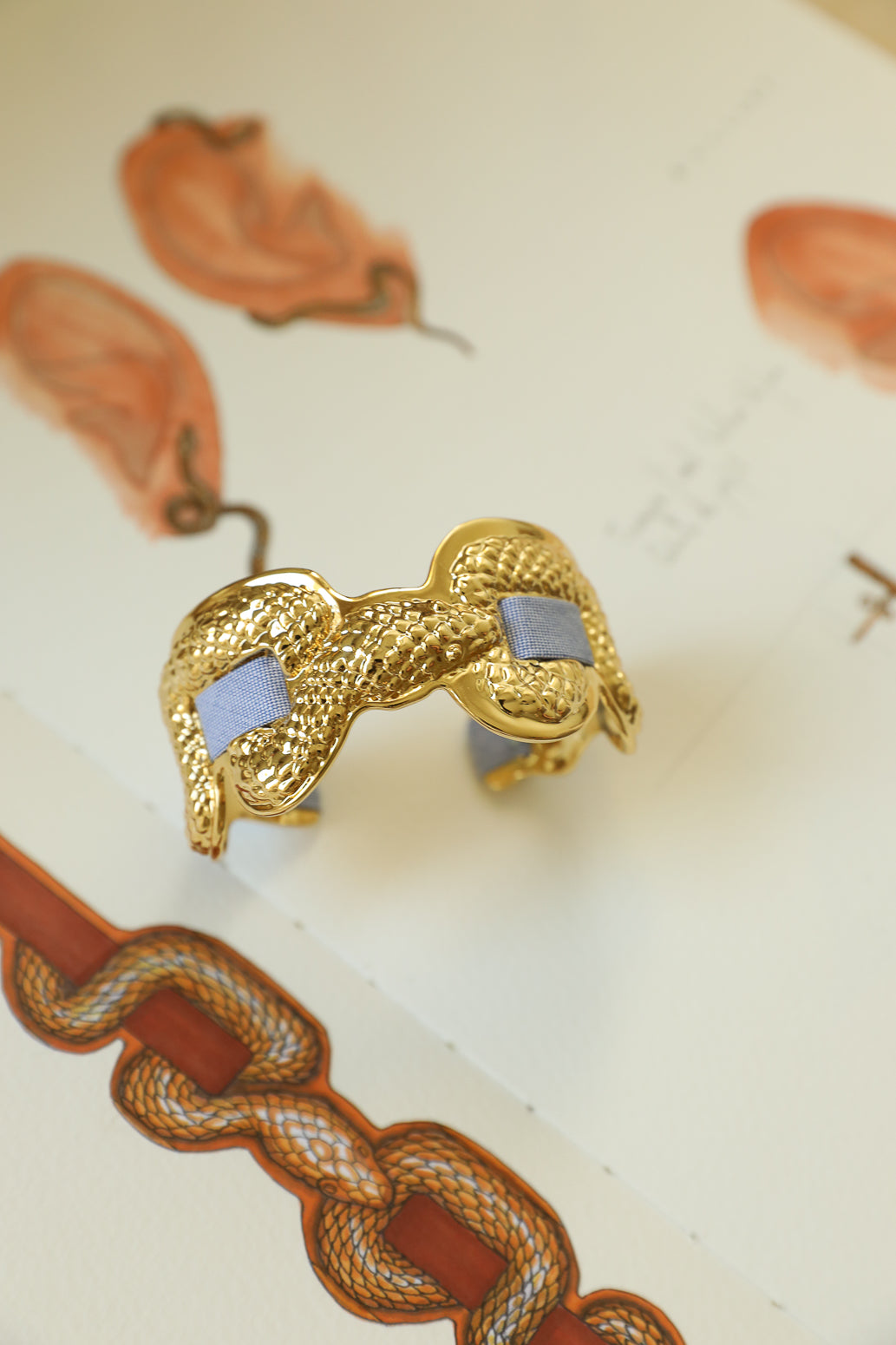 For all lovers of rock symbols like the Serpent, but also fans of sculptural jewelry that doesn't go unnoticed: our cuff is made for you. Upcycled here to offer it to you at a very reasonable price, the silk has been replaced by a sewn and non-removable bias of colored cotton or velvet depending on the model.
