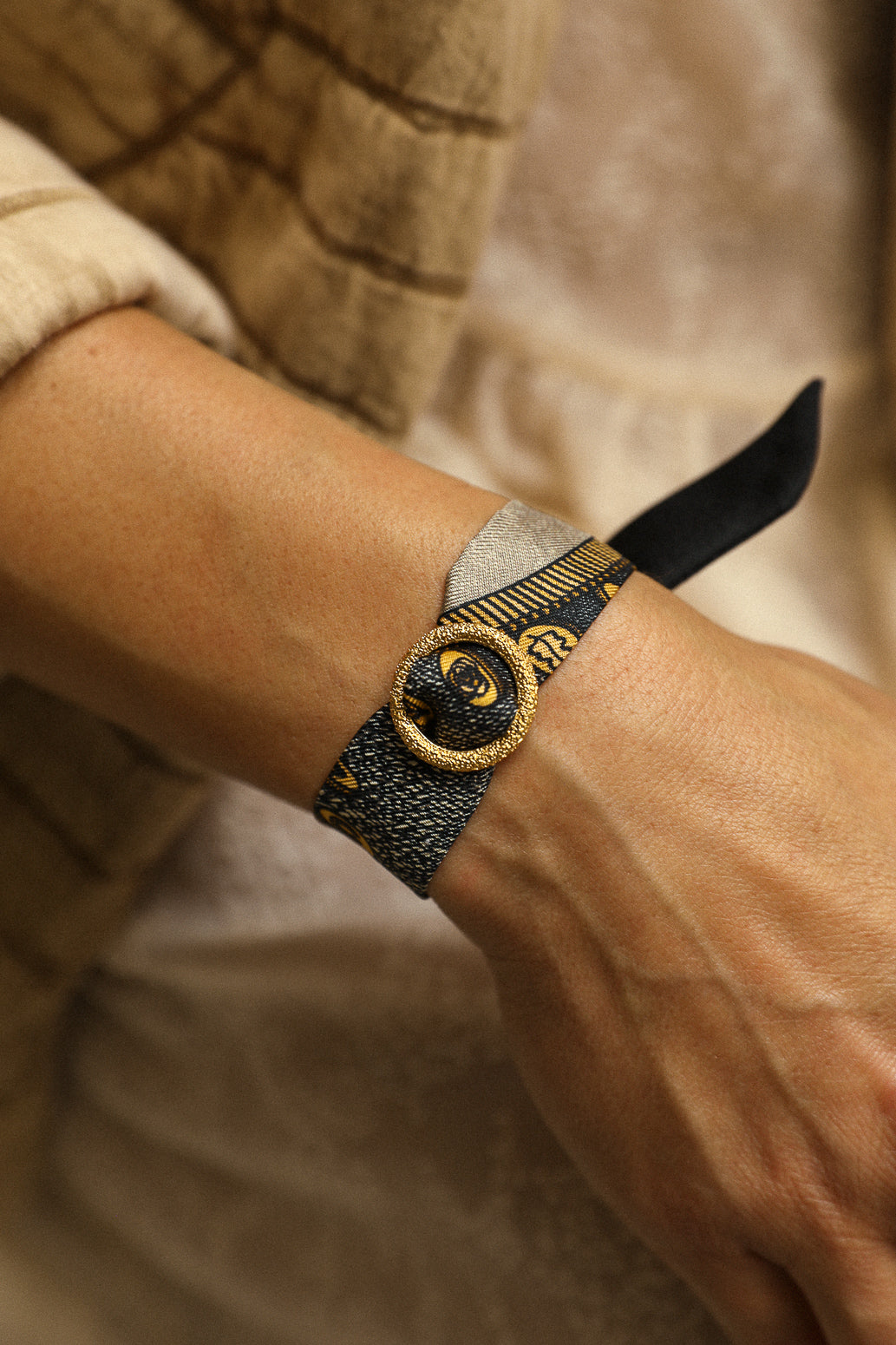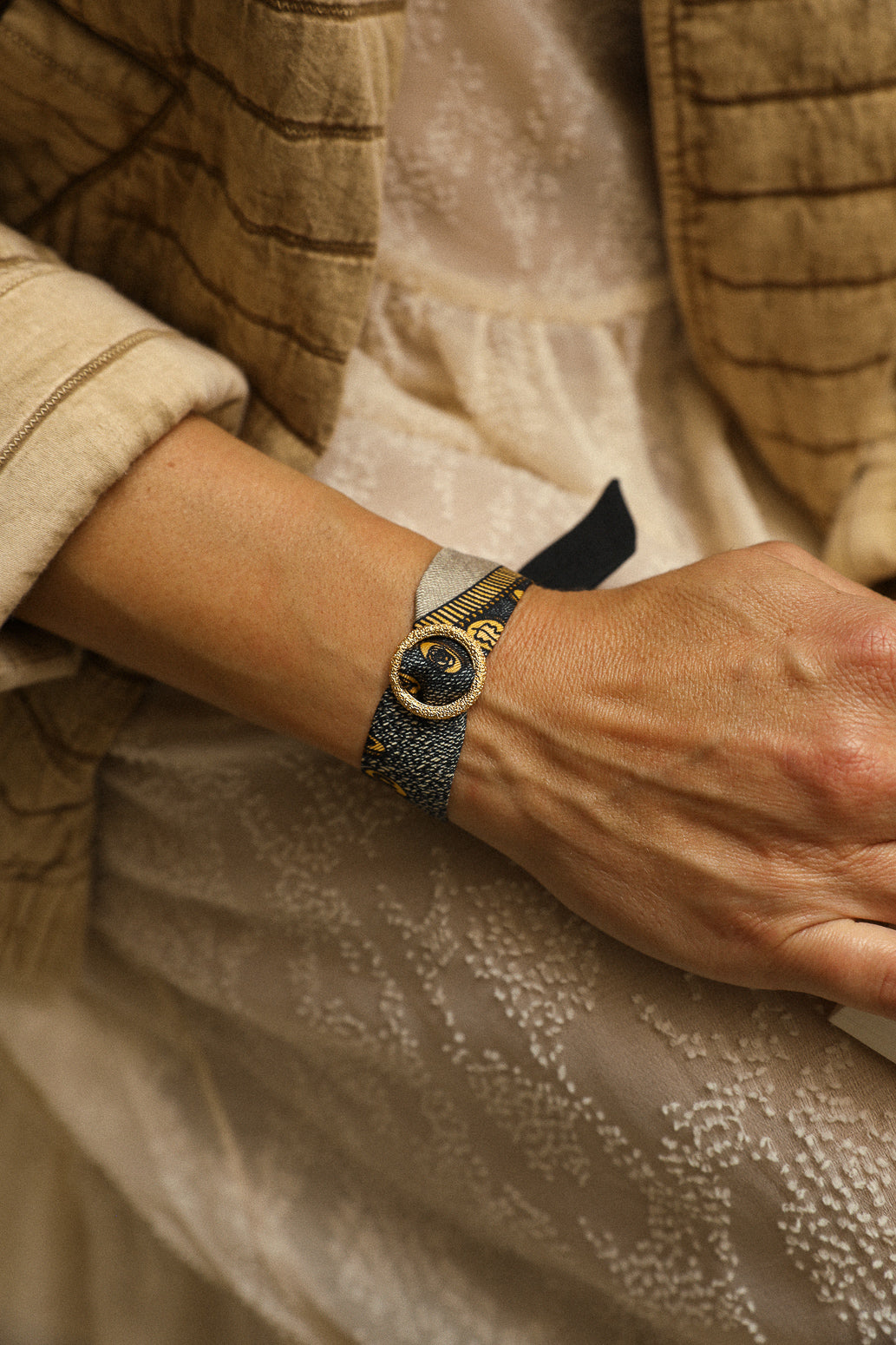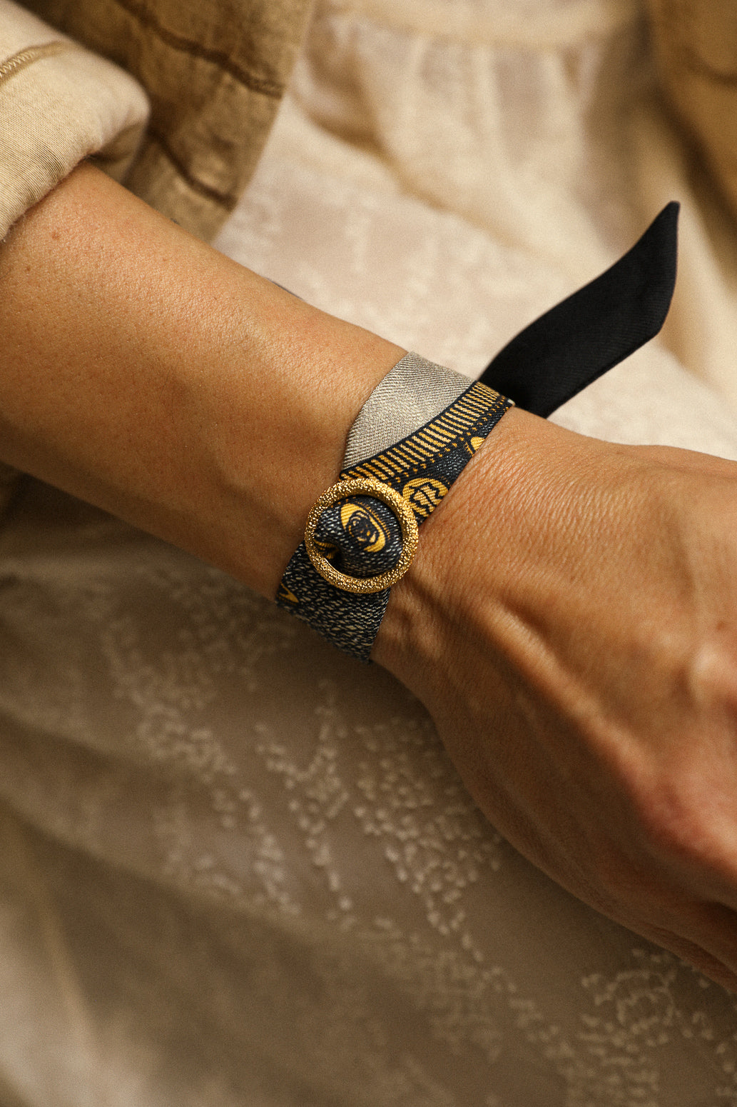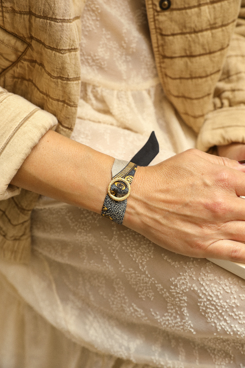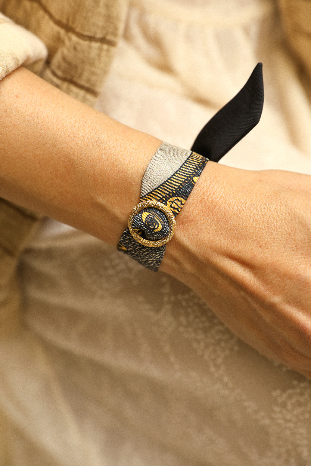 Pairing the black Bohemian Deer silk ribbon, 2cm woven with the Céleste ornament. The silk ribbon is tied with a double knot at the wrist, the Céleste ornament is removable which allows you to wear the silk ribbon alone if you wish. The set comes in a jewelry box and already paired. Our silk ribbon is labeled "Made in Paris 2025", a label awarded by the Paris City Hall for our manufacturing excellence in Paris itself.