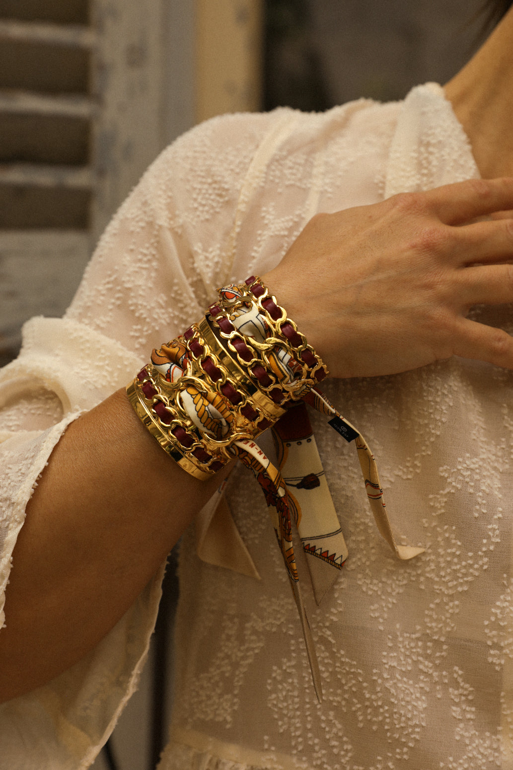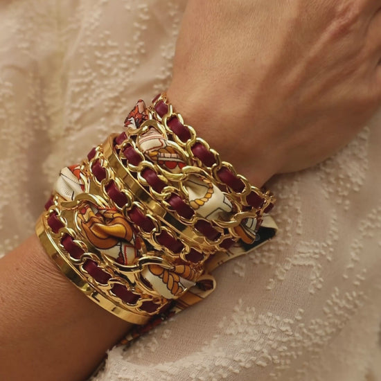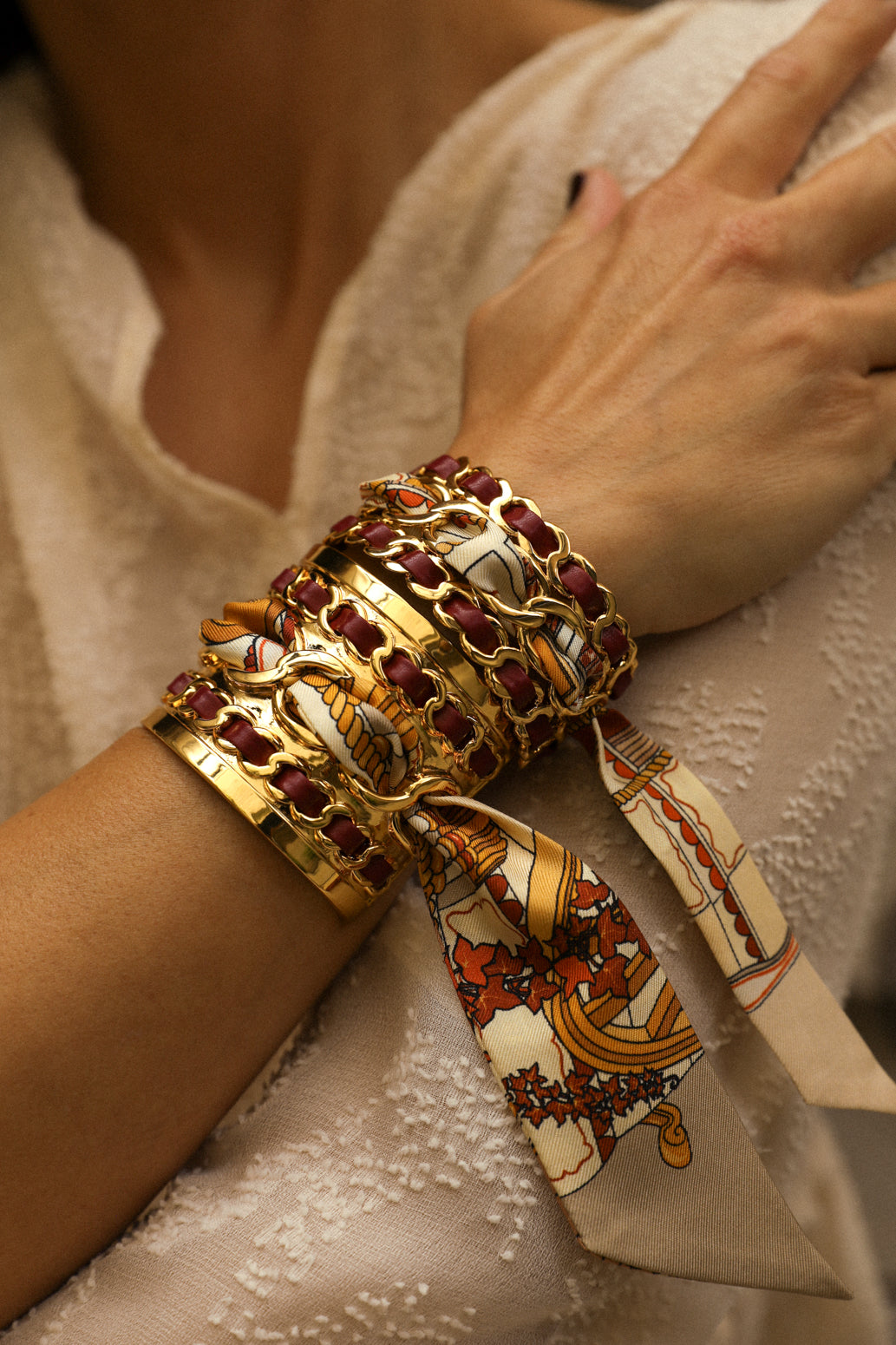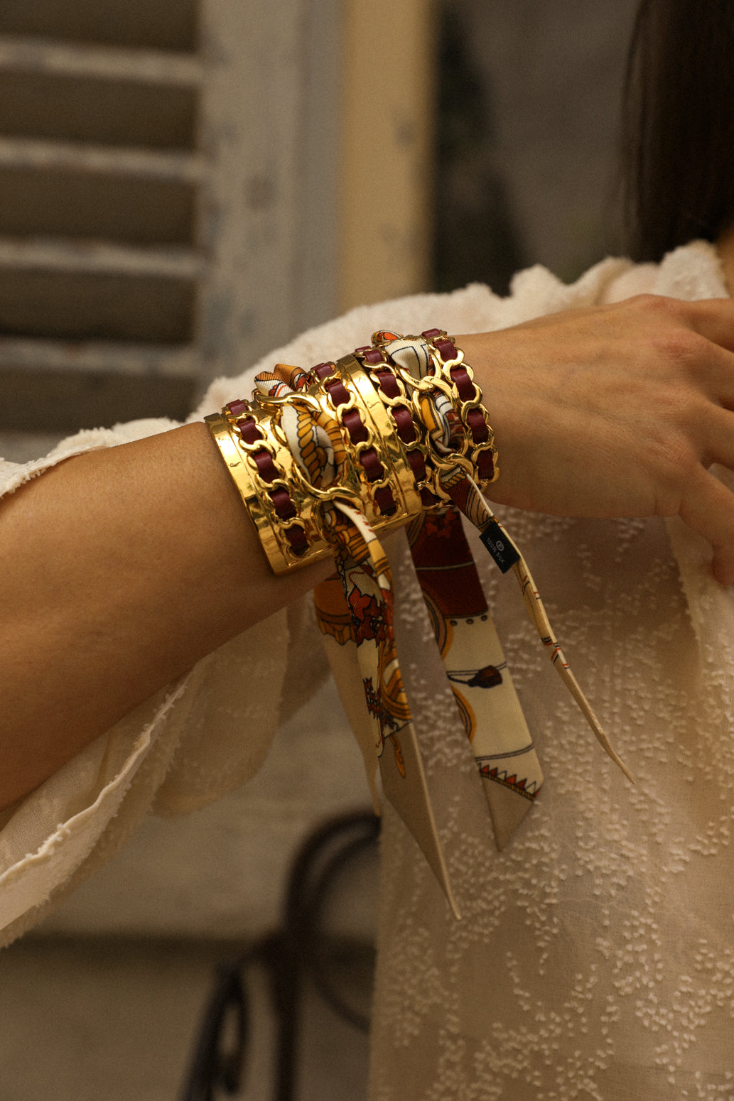 The small December cuff is our elegant new addition for the Fall-Winter 2025/26 season, made of chains and woven with faux leather and silk. It measures 3cm, is entirely openwork, and is very lightweight. Fully (and very easily) adjustable, it comes in three faux leather colors: black, burgundy, or denim blue. It is part of the DECEMBER family: composed of a large cuff, the small cuff (current sheet), a bracelet, and an ornament. Like all our creations, you can change the silk ribbon as you wish, by unweaving or reweaving your cuff. If you would like to order other silk ribbons to go with your December cuff: it is compatible with our 2 cm silk ribbons.