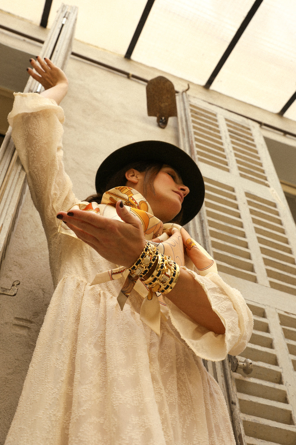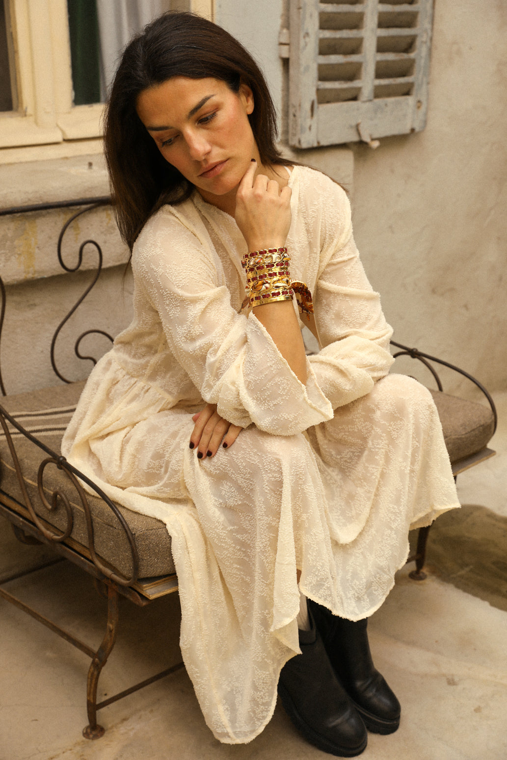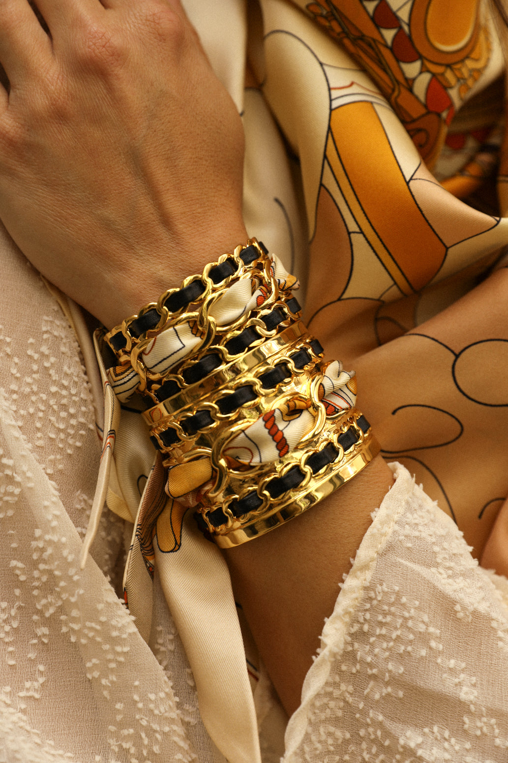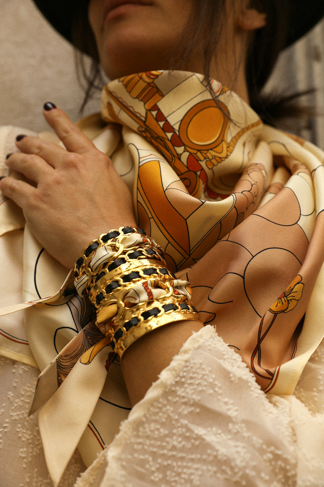 The small December cuff is our elegant new addition for the Fall-Winter 2025/26 season, made of chains and woven with faux leather and silk. It measures 3cm, is entirely openwork, and is very lightweight. Fully (and very easily) adjustable, it comes in three faux leather colors: black, burgundy, or denim blue. It is part of the DECEMBER family: composed of a large cuff, the small cuff (current sheet), a bracelet, and an ornament. Like all our creations, you can change the silk ribbon as you wish, by unweaving or reweaving your cuff. If you would like to order other silk ribbons to go with your December cuff: it is compatible with our 2 cm silk ribbons.