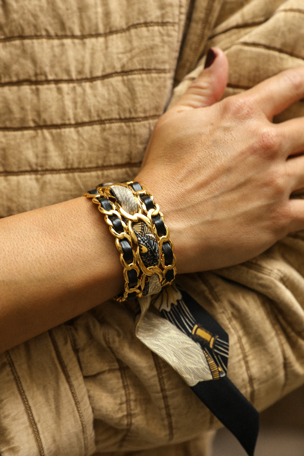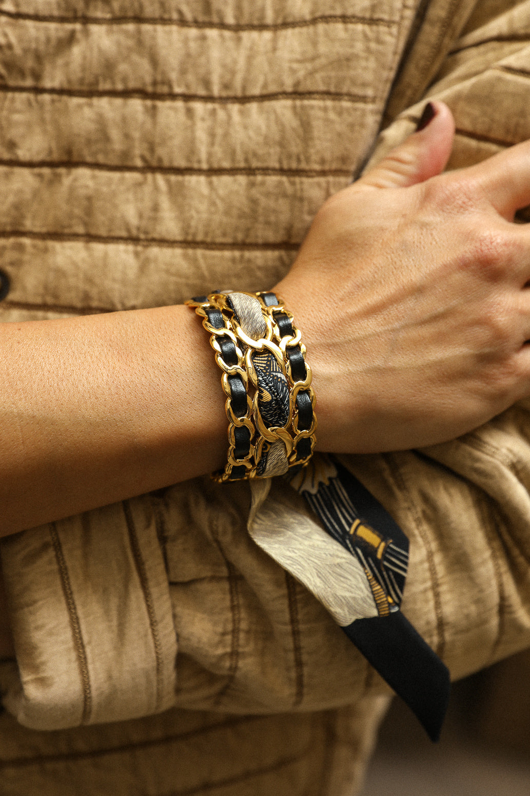 The December small cuff is our elegant new addition for the Fall-Winter 2025/26 season, made of chains and woven with faux leather and silk.