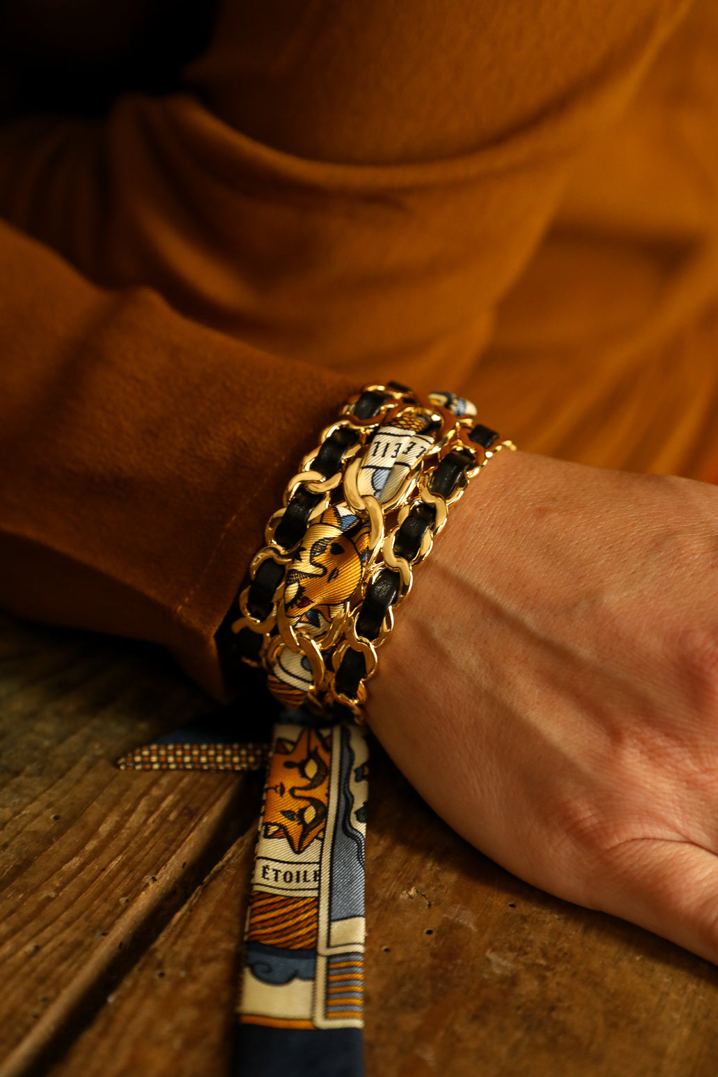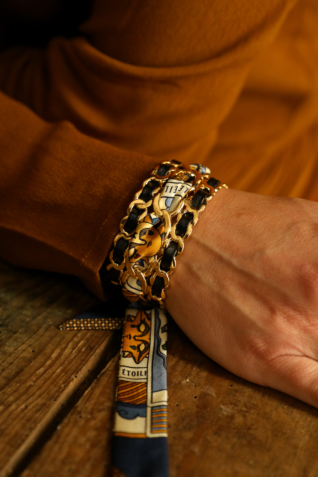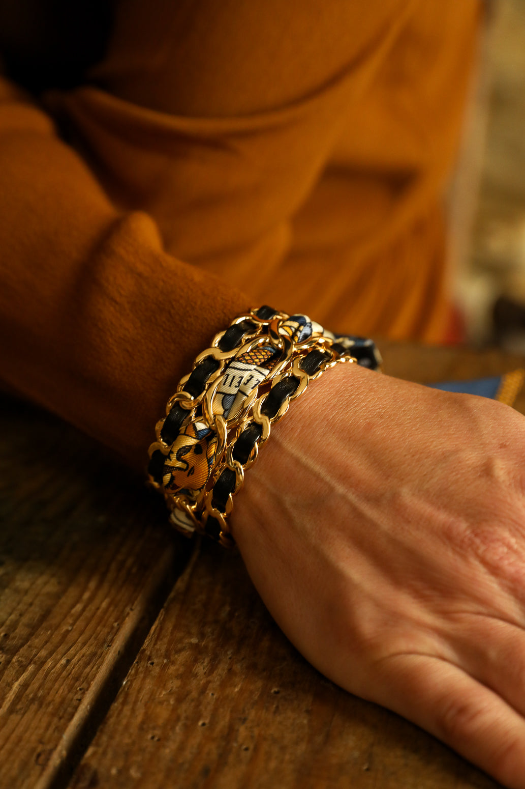 The small December cuff is our elegant new addition for the Fall-Winter 2025/26 season, made of chains and woven with faux leather and silk. It measures 3cm, is entirely openwork, and is very lightweight. Fully (and very easily) adjustable, it comes in three faux leather colors: black, burgundy, or denim blue. It is part of the DECEMBER family: composed of a large cuff, the small cuff (current sheet), a bracelet, and an ornament. Like all our creations, you can change the silk ribbon as you wish, by unweaving or reweaving your cuff. If you would like to order other silk ribbons to go with your December cuff: it is compatible with our 2 cm silk ribbons.