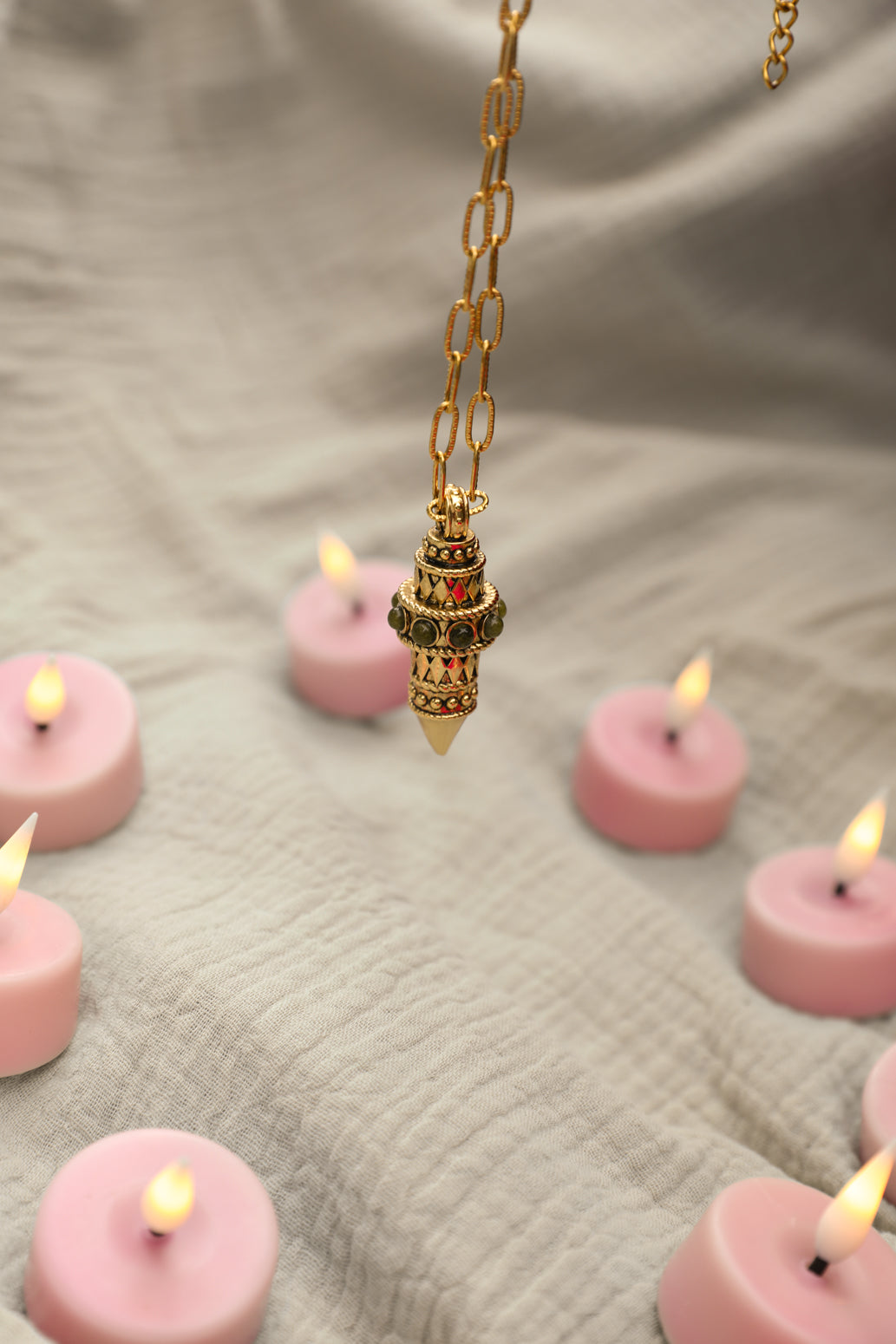 Comment évoquer la Divination dans notre Collection Gypsy Tales sans revisiter la symbolique du Pendule ? C'était impossible pour la créatrice d'AN-NEE, qui s'est donc appropriée cet objet ésotérique pour en faire un très joli sautoir de style qui ne passera pas inaperçu à votre cou.