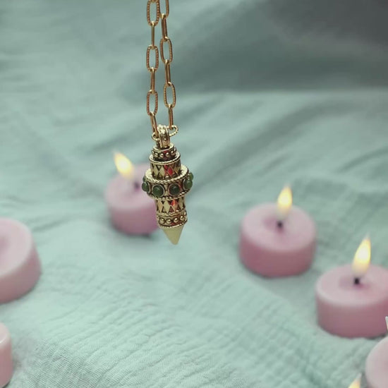 Massif, le pendule en laiton doré est incrusté de petits cabochons de quartzites vertes, sa chaîne quant à elle, se porte en sautoir long ou en double tour de cou, et est en acier inoxydable.
