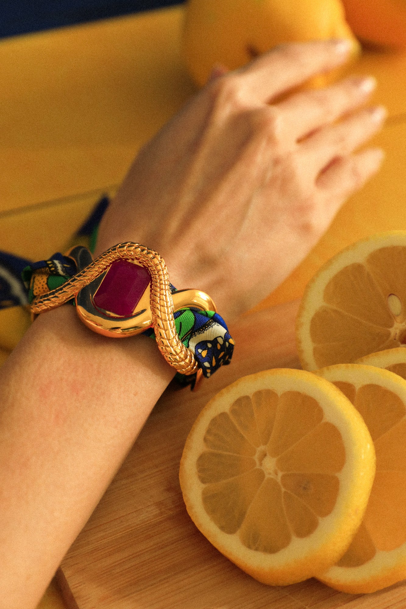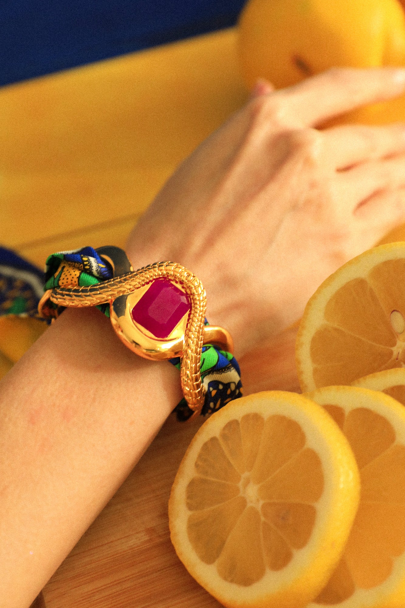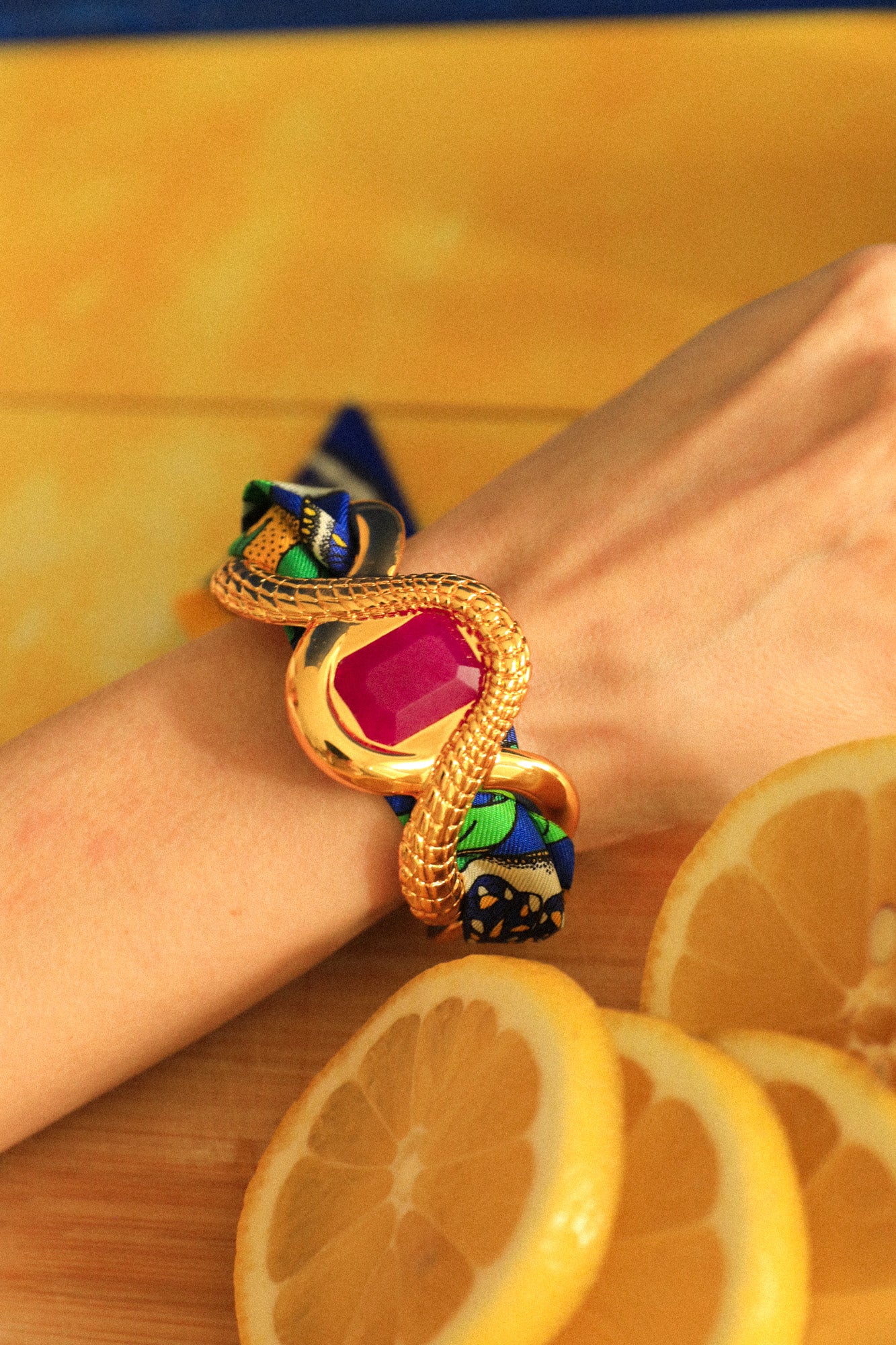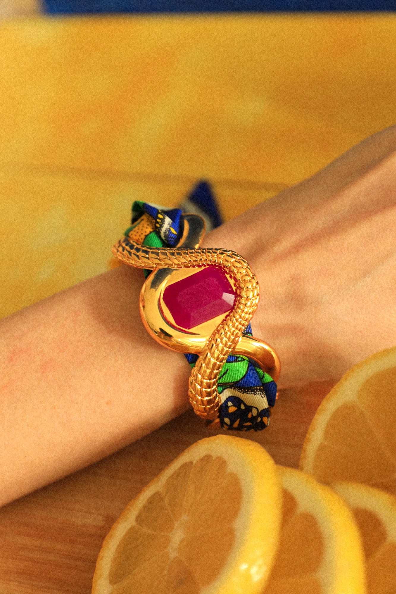 Manchette Caïman Agate fuchsia et ruban Cocktail bleu
