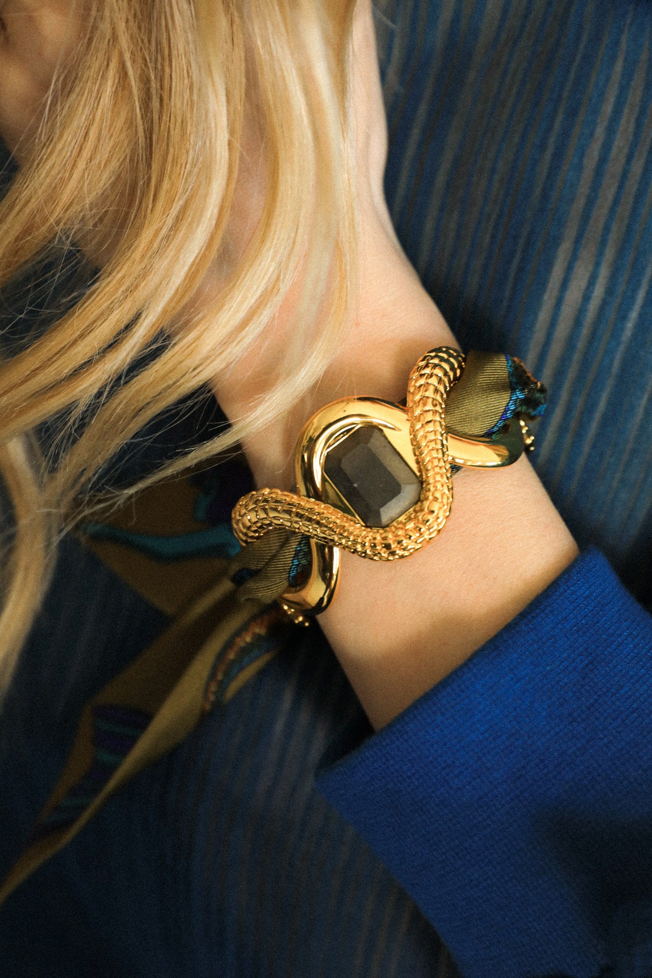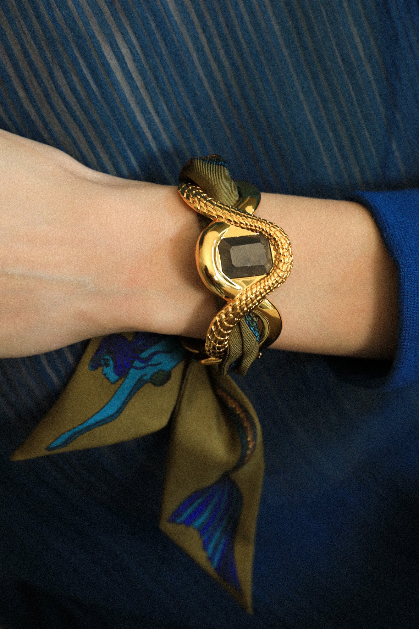 Nouveauté très "racée" de notre collection Paroles de Marin, la manchette Caïman est notre toute nouvelle pièce de style inspirée par le crocodile de Peter Pan (la petite anecdote régressive).Incrustée d'une pierre de pyrite facetée, elle est matiérée mi-lisse mi-peau-de-croco.