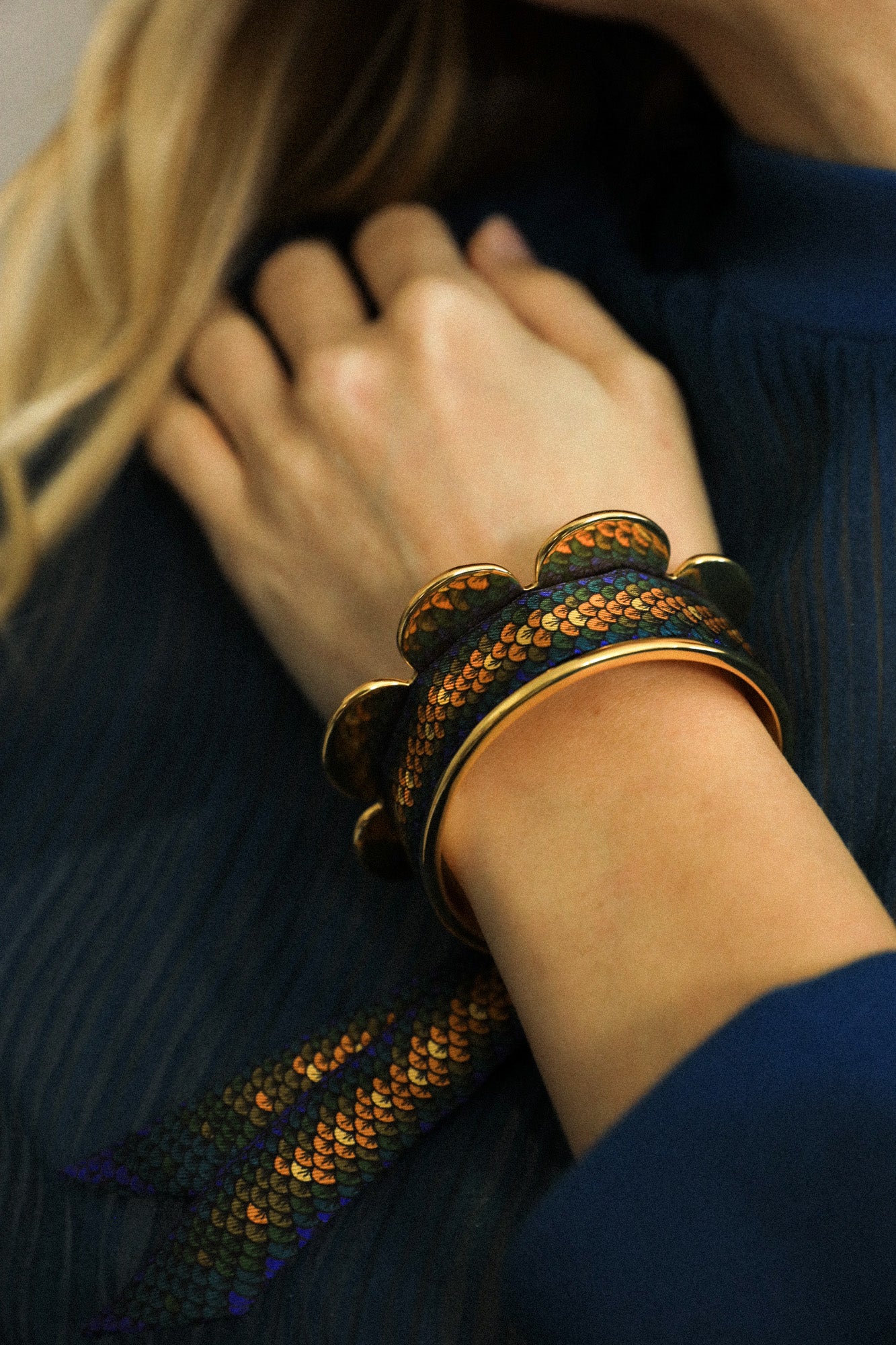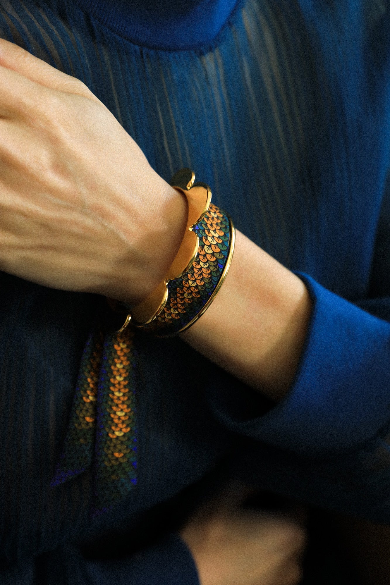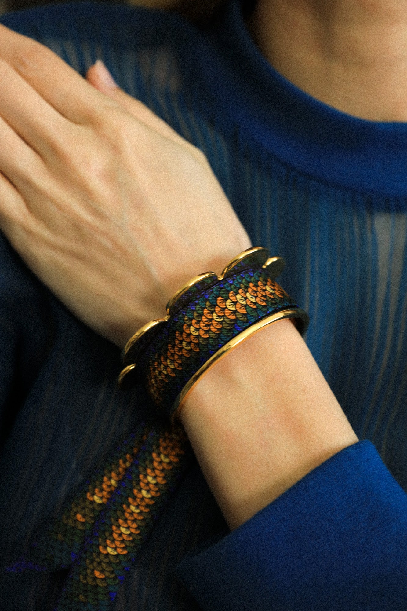 Puis, la manchette a été travaillée avec un effet miroitant assez extra : ce dernier permet de refléter intégralement le ruban en soie qui y est tissé ! Un effet trompe-l'oeil et visuel épatant.
