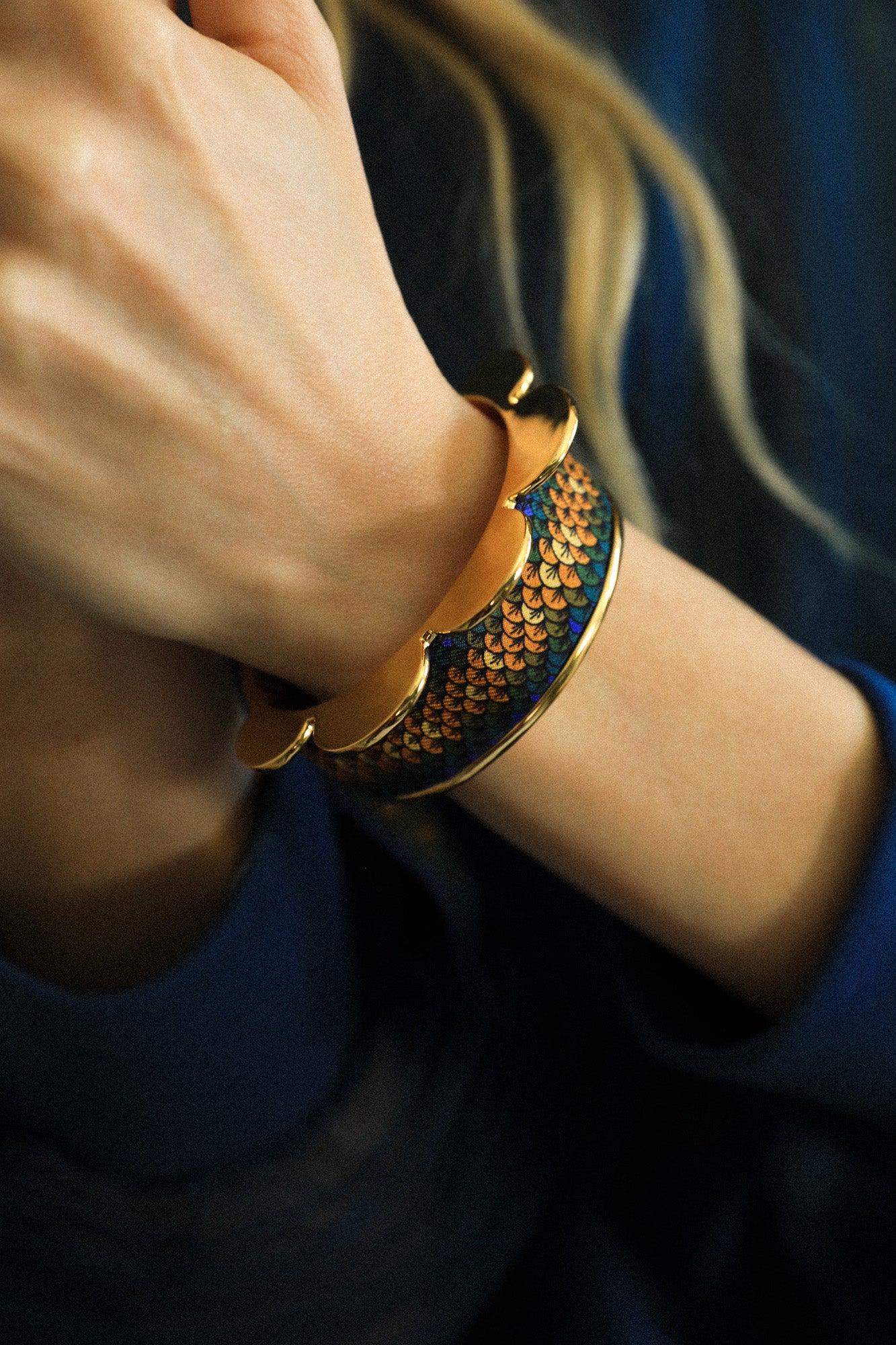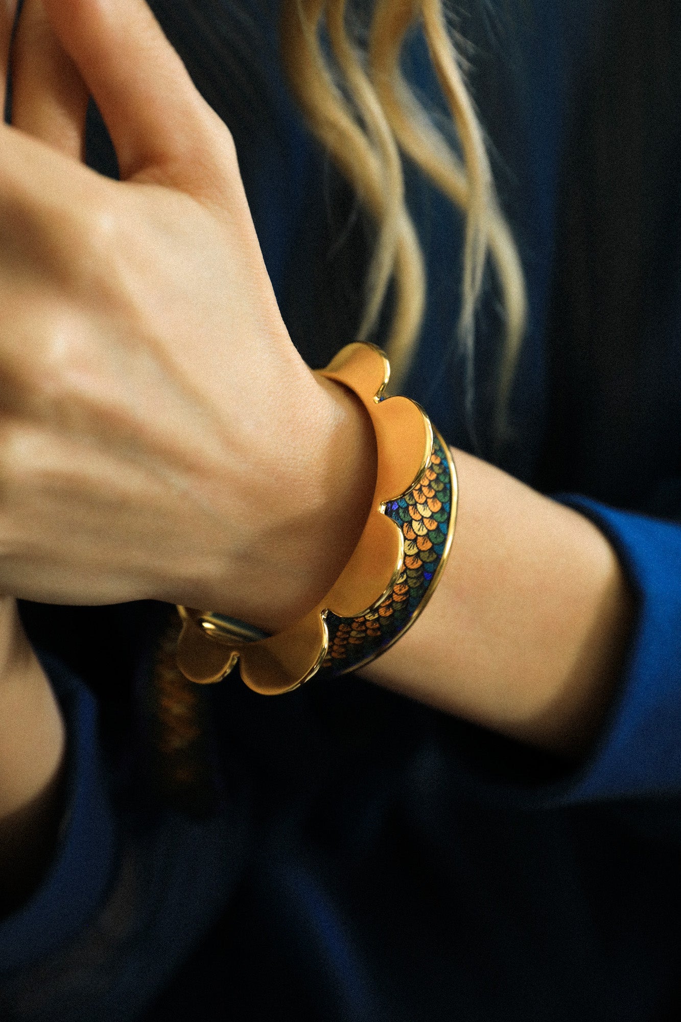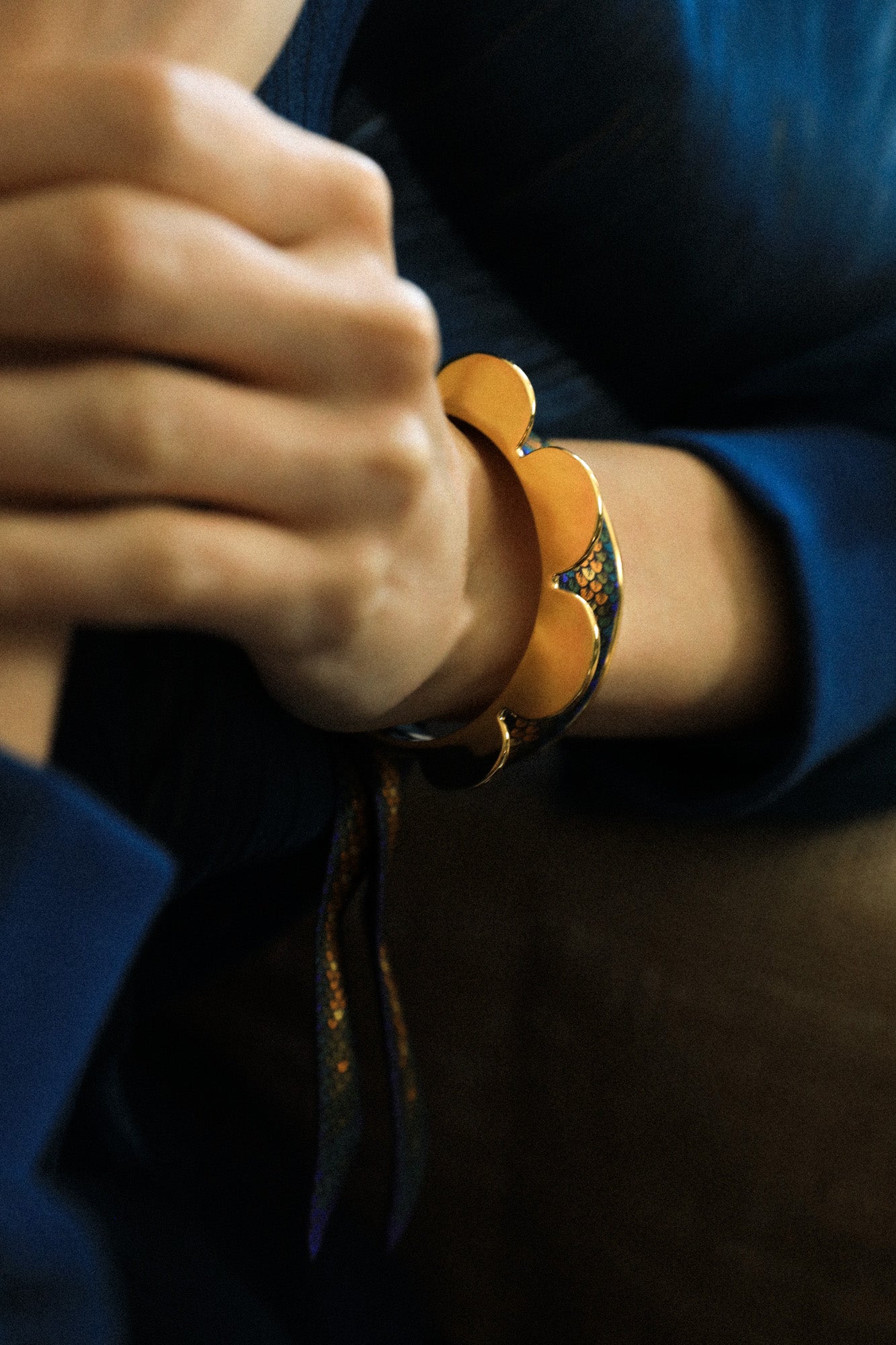 Ensuite, cette manchette a été pensée certes pour être habillée d'un ruban en soie, mais elle se porte aussi sans ! Les passants pour la soie n'étant situés qu'en intérieur de poignet, la manchette se suffie à elle-même avec effet WAHOU garanti. Elle est très miroitante.