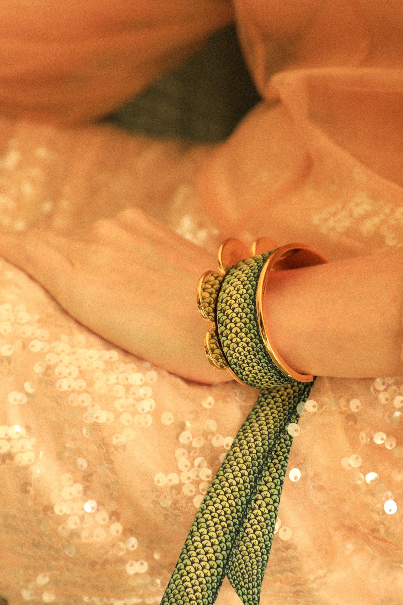 Puis, la manchette a été travaillée avec un effet miroitant assez extra : ce dernier permet de refléter intégralement le ruban en soie qui y est tissé ! Un effet trompe-l'oeil et visuel épatant.