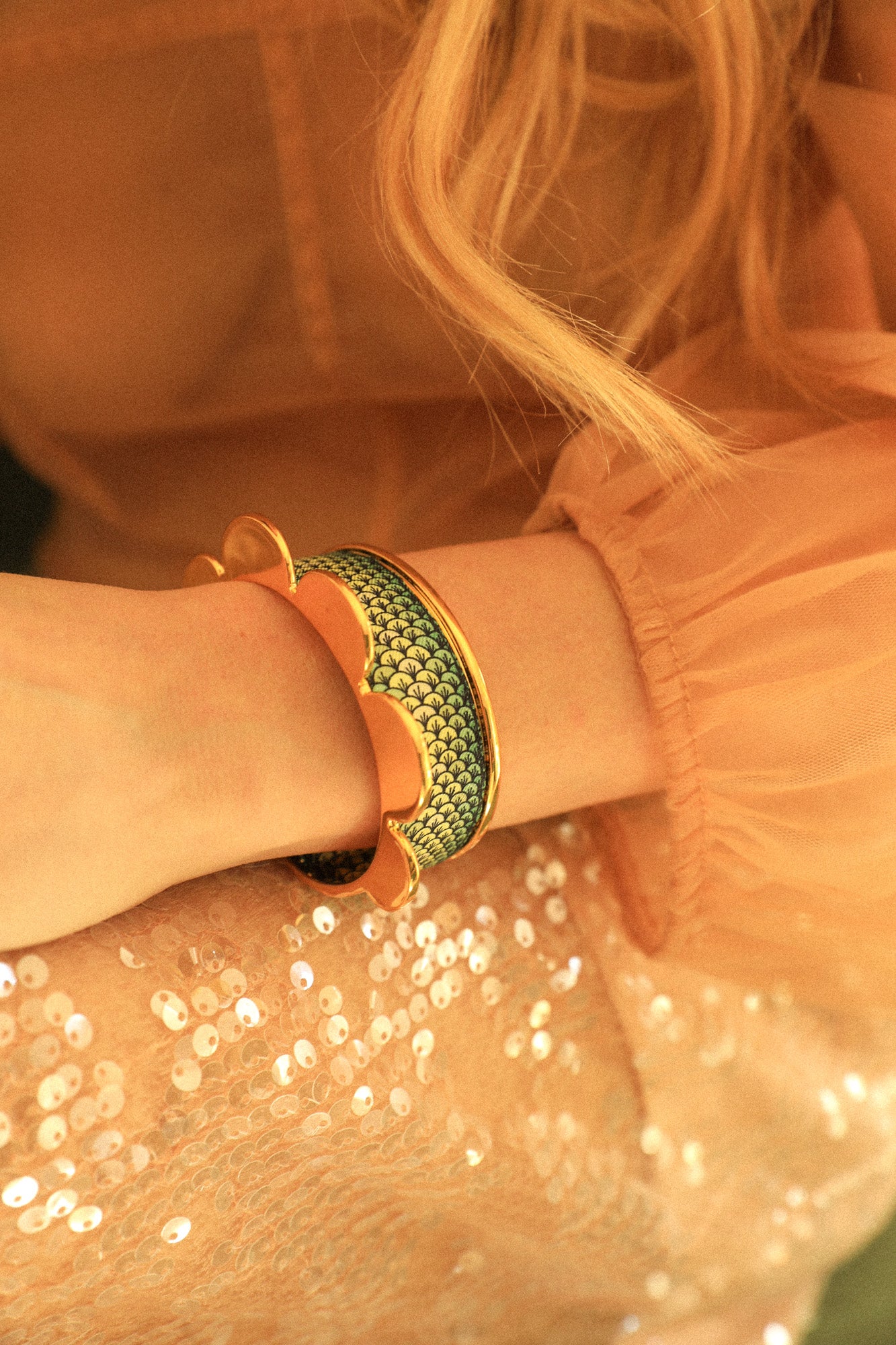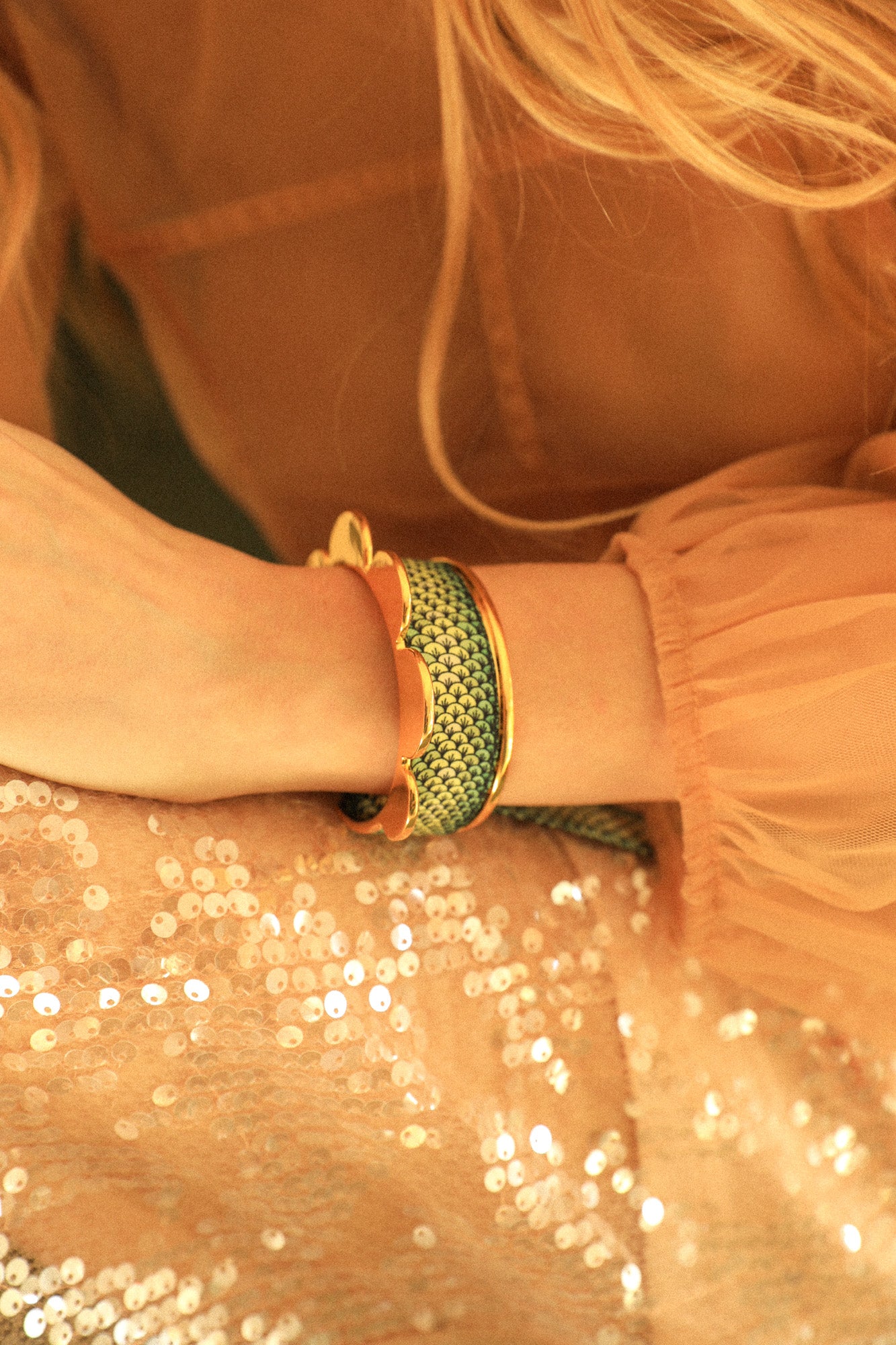 Ensuite, cette manchette a été pensée certes pour être habillée d'un ruban en soie, mais elle se porte aussi sans ! Les passants pour la soie n'étant situés qu'en intérieur de poignet, la manchette se suffie à elle-même avec effet WAHOU garanti. Elle est très miroitante.