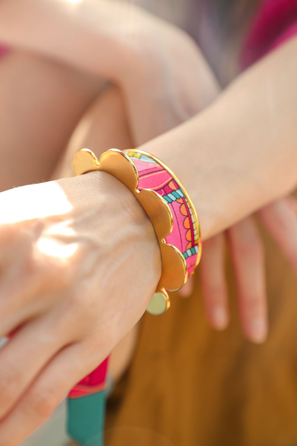 - D'abord, ses fanions ronds complètement perpendiculaires au tour de poignet, permettent de vous proposer un jeu de style en bout manche ! Imaginez, vous portez un pull en hiver, et les fanions dépassent de ce dernier comme personne ne s'y attendrait ! --> Nous vous précisons qu'il n'y a pas de fanions en poignet intérieur pour que jamais la manchette ne vous gène, et qu'elle est ajustable, comme toutes nos manchettes, bien que l’ajustement demande un peu de force.