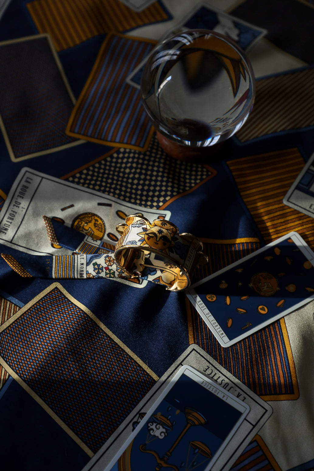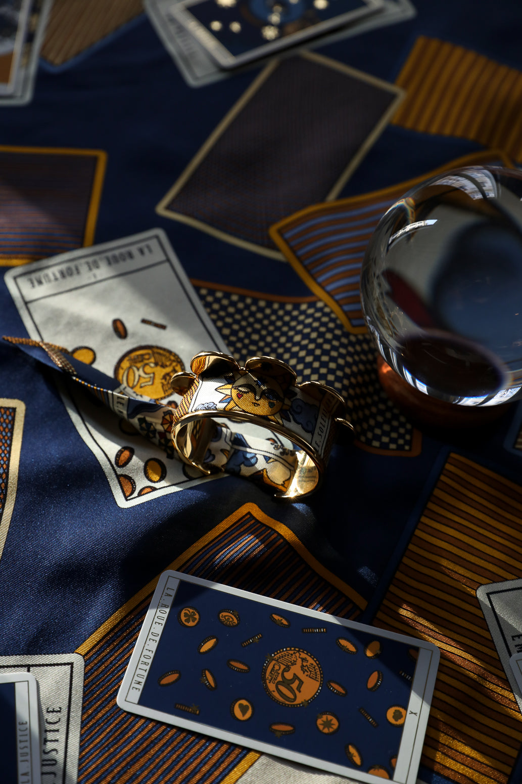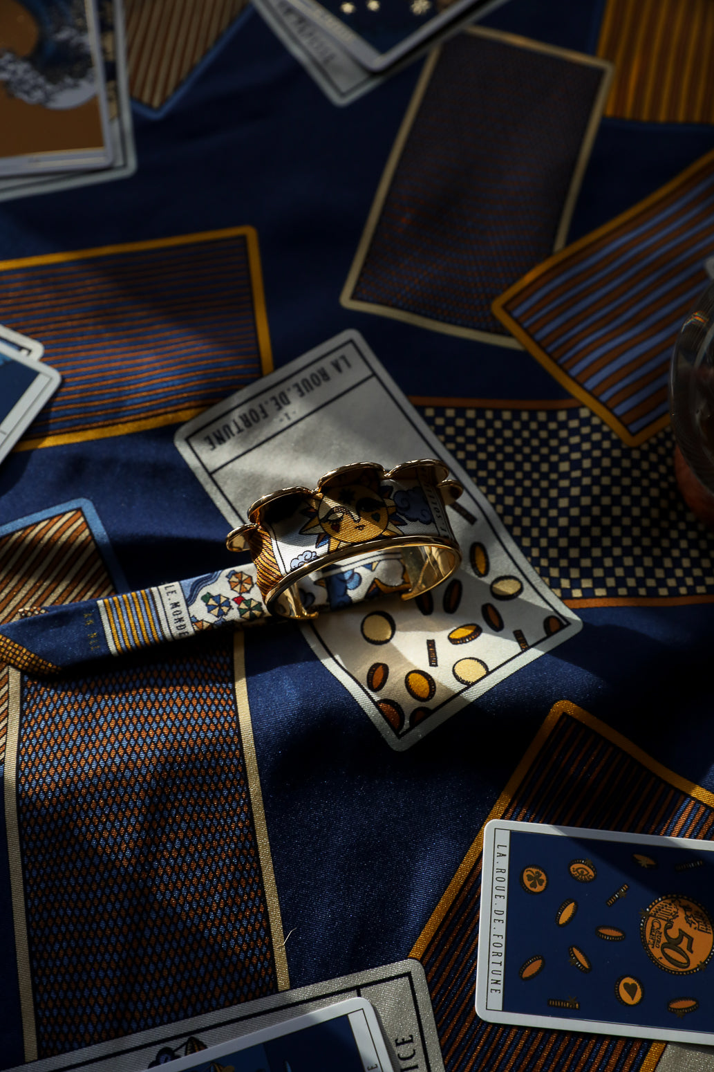 Probablement l'une de nos manchettes les plus créatives, la manchette Fanion, inspirée par l'univers du Cirque et les fanions des chapiteaux. Ce modèle d'exception à plusieurs caractéristiques stylistiques qui valent la peine d'être racontés : - D'abord, ses fanions ronds complètement perpendiculaires au tour de poignet, permettent de vous proposer un jeu de style en bout manche ! Imaginez, vous portez un pull en hiver, et les fanions dépassent de ce dernier comme personne ne s'y attendrait ! --> Nous vous précisons qu'il n'y a pas de fanions en poignet intérieur pour que jamais la manchette ne vous gène, et qu'elle est ajustable, comme toutes nos manchettes, bien que l’ajustement demande un peu de force. - Puis, la manchette a été travaillée avec un effet miroitant assez extra : ce dernier permet de refléter intégralement le ruban en soie qui y est tissé ! Un effet trompe-l'oeil et visuel épatant. - Ensuite, cette manchette a été pensée certes pour être habillée d'un ruban en soie, mais elle se porte aussi sans ! Les passants pour la soie n'étant situés qu'en intérieur de poignet, la manchette se suffie à elle-même avec effet WAHOU garanti. Si vous souhaitez commander d'autres rubans en soie pour aller avec votre manchette Fanion : elle est compatible avec nos rubans en soie de 2 cm