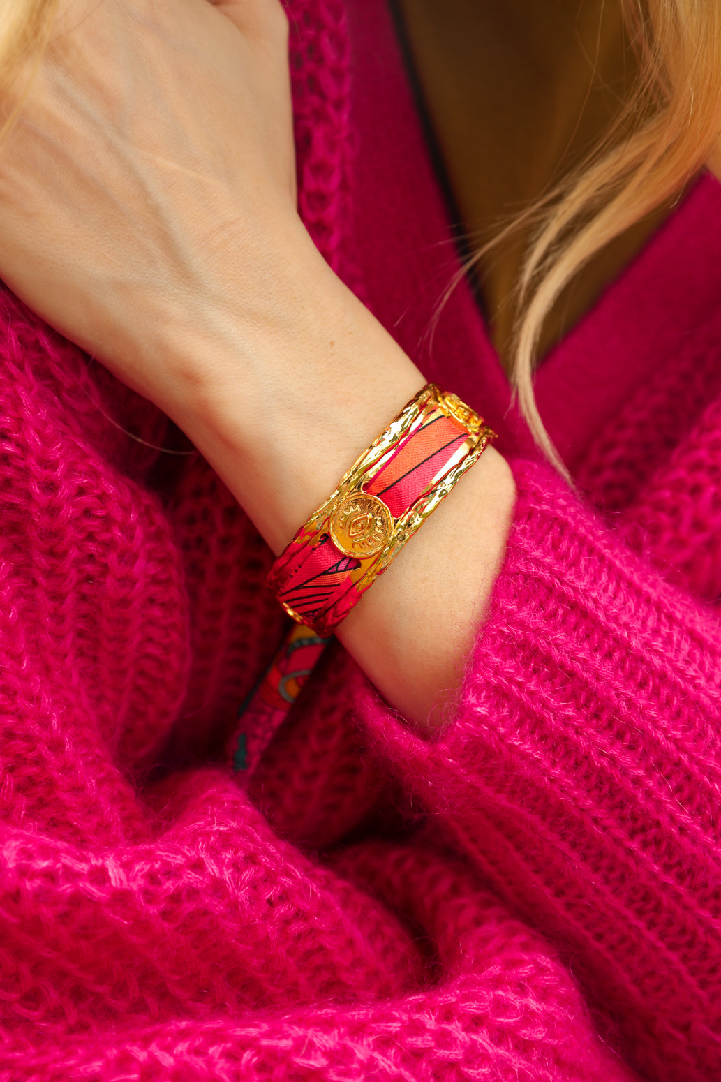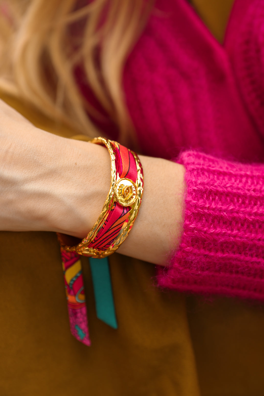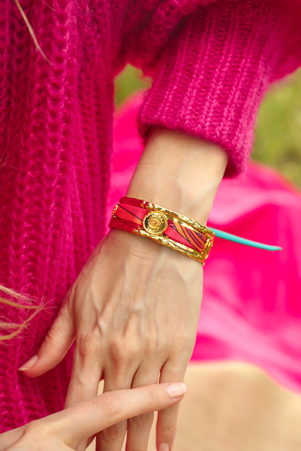 Comme un grigri protecteur, elle est composée de trois médaillons embossés d’un oeil, d’un coeur et d’un trèfle. Comme toutes nos créations, vous pouvez changer de ruban en soie au gré de vos envies, pour que votre manchette accompagne vos looks du quotidien comme ceux des grandes occasions ;) Si vous souhaitez commander d'autres rubans en soie pour aller avec la manchette Irma : elle est compatible avec nos rubans en soie de 1 cm