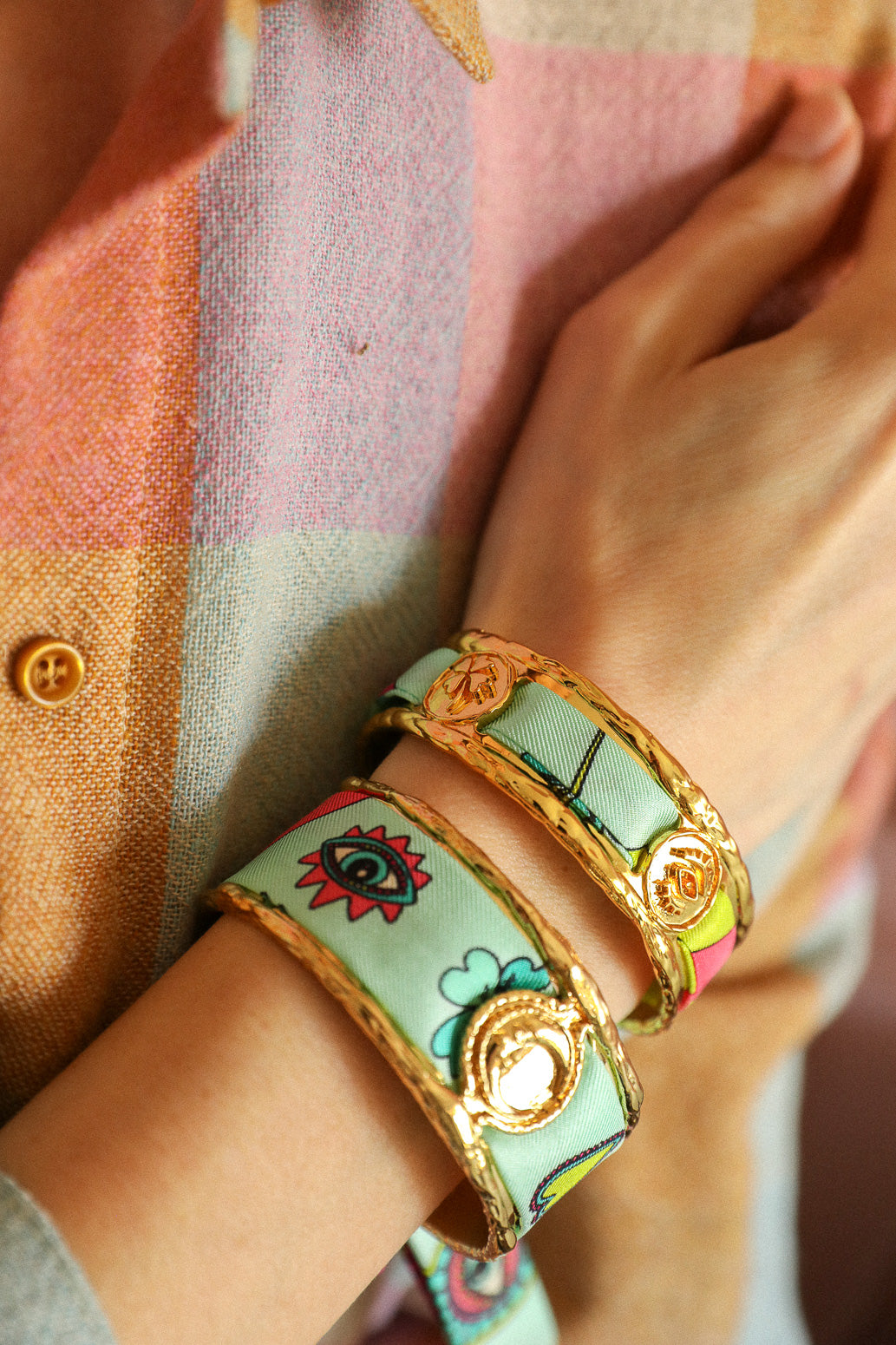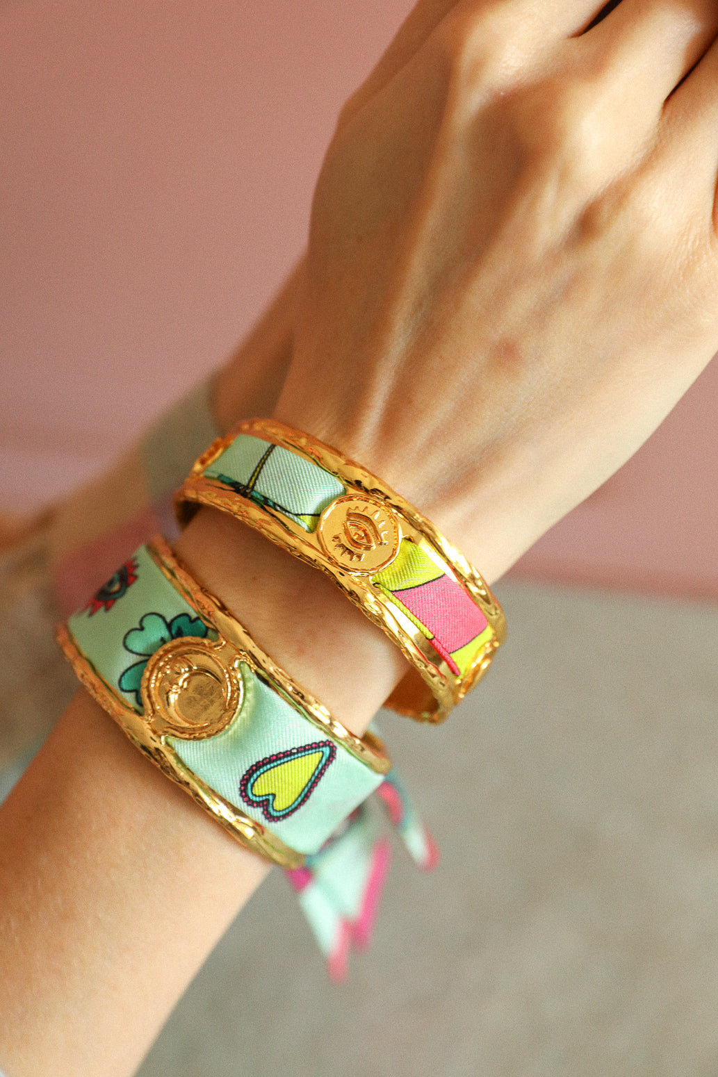 Comme un grigri protecteur, elle est composée de trois médaillons embossés d’un oeil, d’un coeur et d’un trèfle. Comme toutes nos créations, vous pouvez changer de ruban en soie au gré de vos envies, pour que votre manchette accompagne vos looks du quotidien comme ceux des grandes occasions ;) Si vous souhaitez commander d'autres rubans en soie pour aller avec la manchette Irma : elle est compatible avec nos rubans en soie de 1 cm