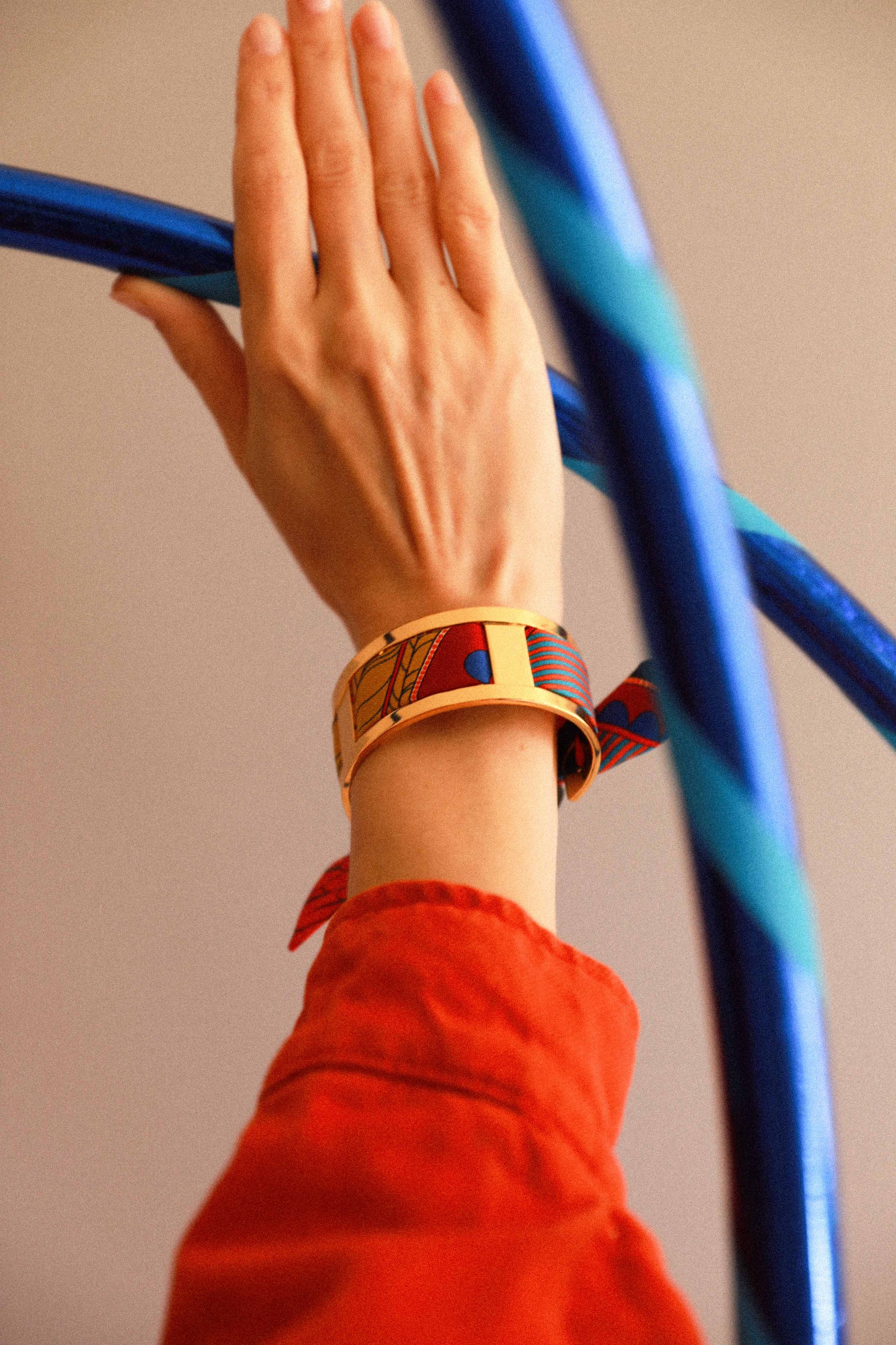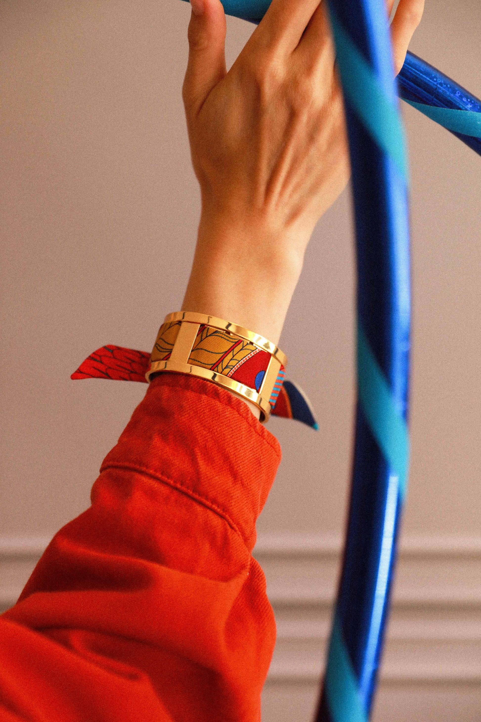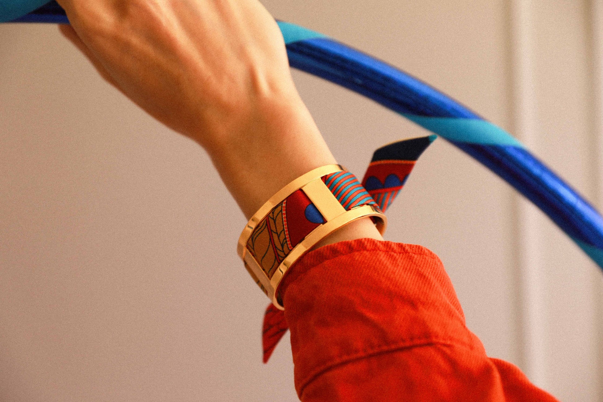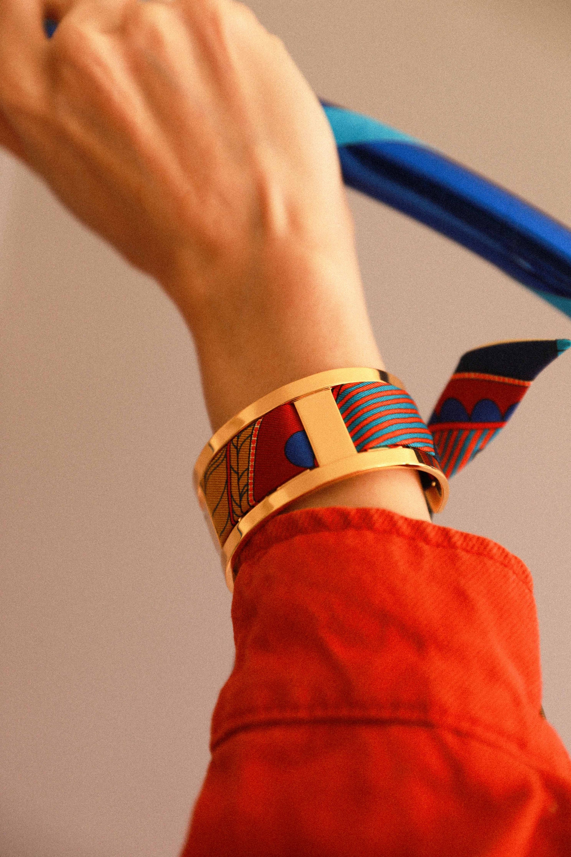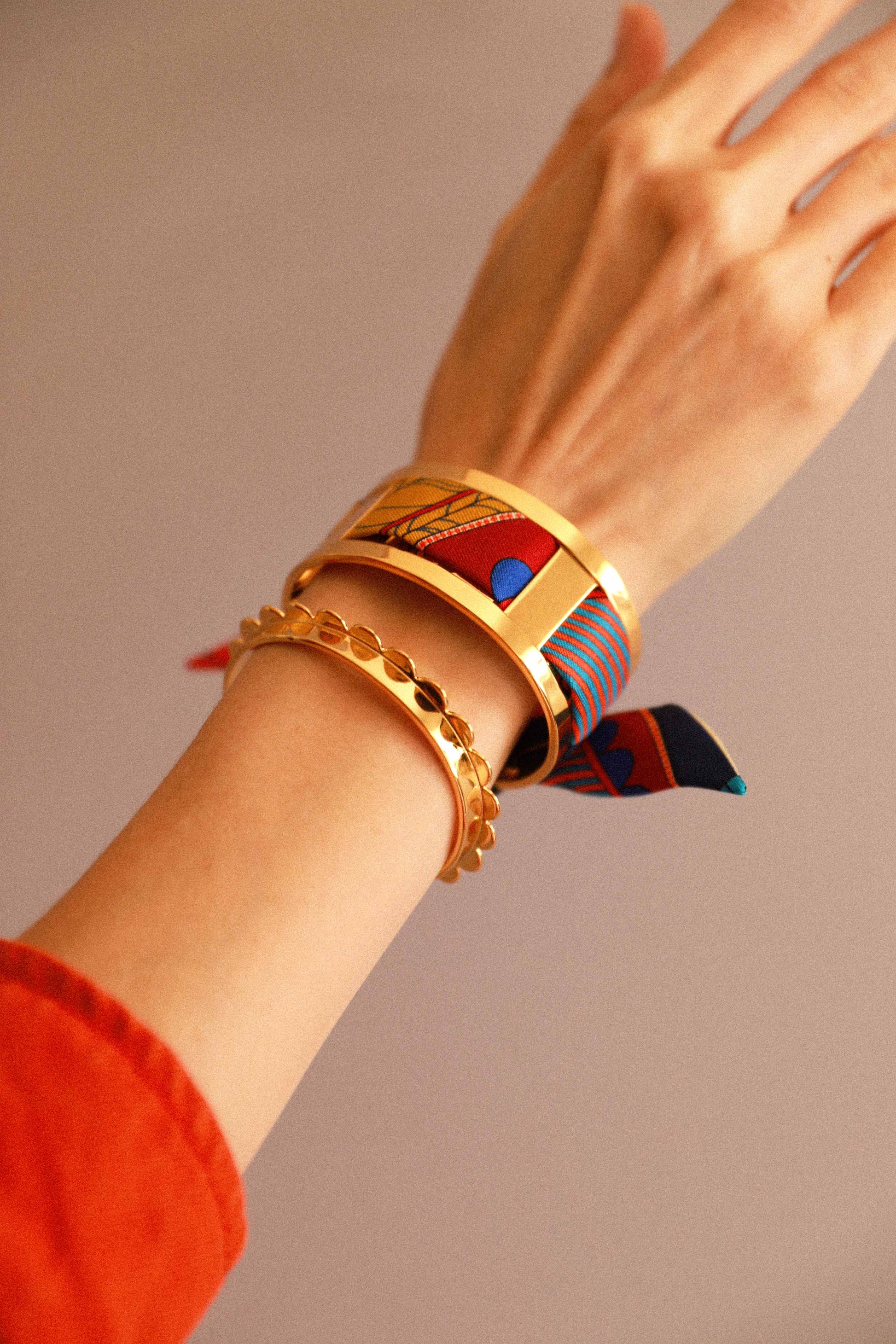 La manchette JMA est la manchette signature d'AN-NEE. La toute première à avoir été créée par la créatrice, et le départ de tout l'univers de la collection SÛRE-MESURE, une collection de bijoux hybrides revisitant la soie. Le Concept Nous avons appellé cette manchette la manchette JMA, car c'est une manchette que vous aurez envie de porter jour après jour (J), mois après mois (M), année après année (A). Pourquoi ? Parce que d'une part vous pouvez changer de bracelet en soie au sein d'une même collection mais aussi de toutes les suivantes, et donc d'imprimé, de couleurs, d'humeur... Mais aussi parce que vous pouvez la tisser différemment. Comment ? On vous le montre dans un petit dépliant fourni avec votre manchette, via 7 tissages différents, pour les 7 jours de la semaine.