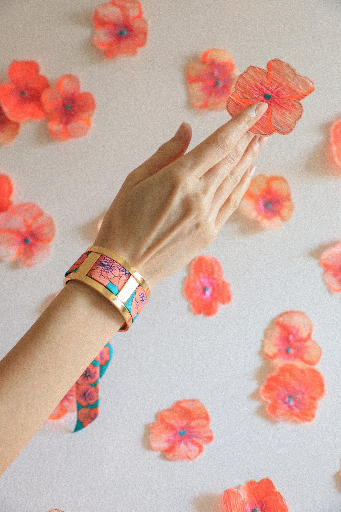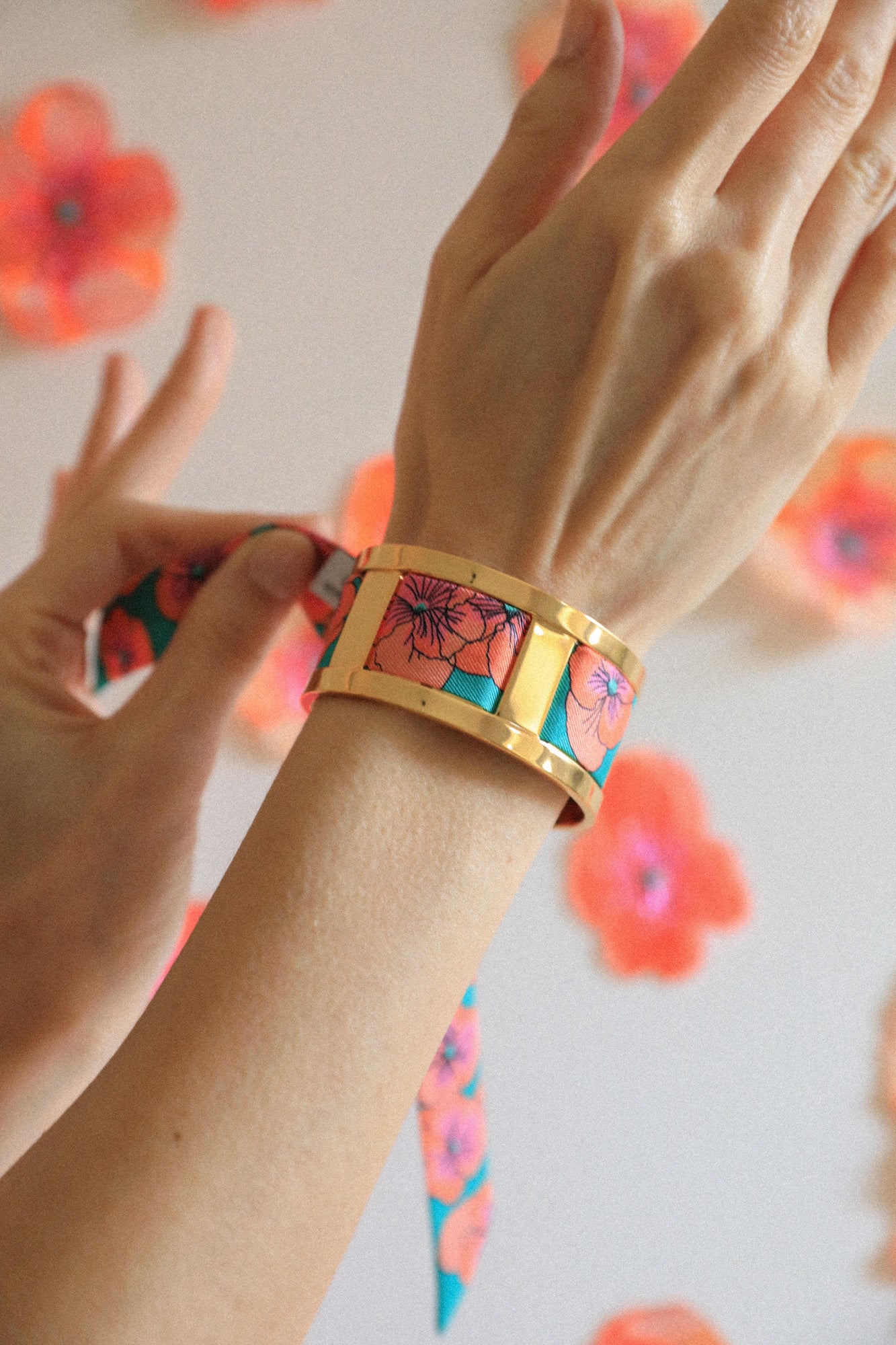 La manchette JMA est la manchette signature d'AN-NEE. La toute première à avoir été créée par la créatrice, et le départ de tout l'univers de la collection SÛRE-MESURE, une collection de bijoux hybrides revisitant la soie. Le Concept Nous avons appellé cette manchette la manchette JMA, car c'est une manchette que vous aurez envie de porter jour après jour (J), mois après mois (M), année après année (A). Pourquoi ? Parce que d'une part vous pouvez changer de bracelet en soie au sein d'une même collection mais aussi de toutes les suivantes, et donc d'imprimé, de couleurs, d'humeur... Mais aussi parce que vous pouvez la tisser différemment. Comment ? On vous le montre dans un petit dépliant fourni avec votre manchette, via 7 tissages différents, pour les 7 jours de la semaine.