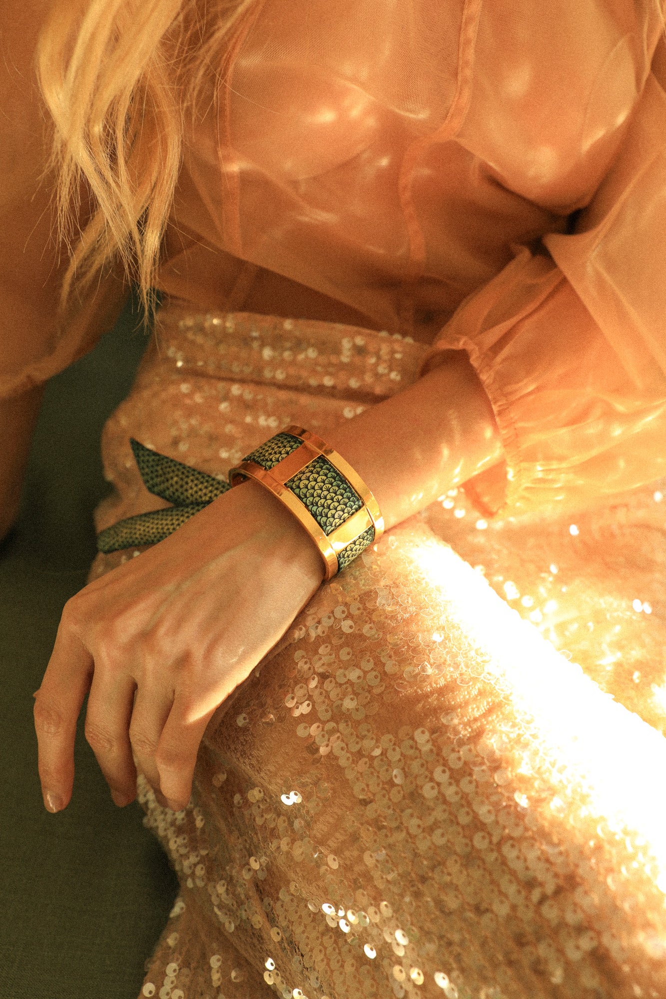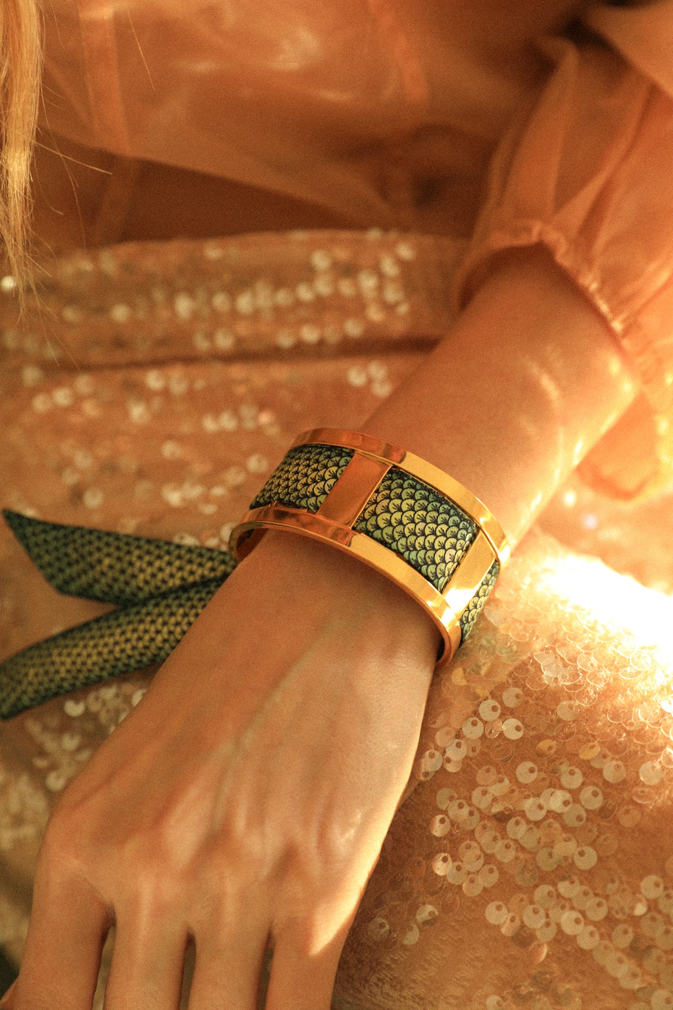 La manchette JMA est la manchette signature d'AN-NEE. La toute première à avoir été créée par la créatrice, et le départ de tout l'univers de la collection SÛRE-MESURE, une collection de bijoux hybrides revisitant la soie. Le Concept Nous avons appellé cette manchette la manchette JMA, car c'est une manchette que vous aurez envie de porter jour après jour (J), mois après mois (M), année après année (A). Pourquoi ? Parce que d'une part vous pouvez changer de bracelet en soie au sein d'une même collection mais aussi de toutes les suivantes, et donc d'imprimé, de couleurs, d'humeur... Mais aussi parce que vous pouvez la tisser différemment. Comment ? On vous le montre dans un petit dépliant fourni avec votre manchette, via 7 tissages différents, pour les 7 jours de la semaine.