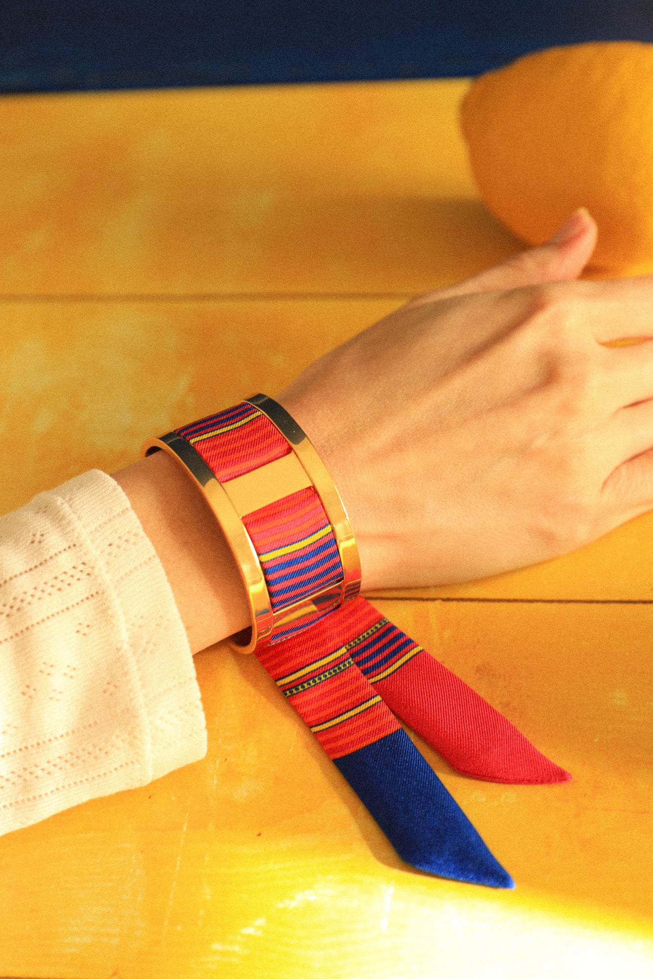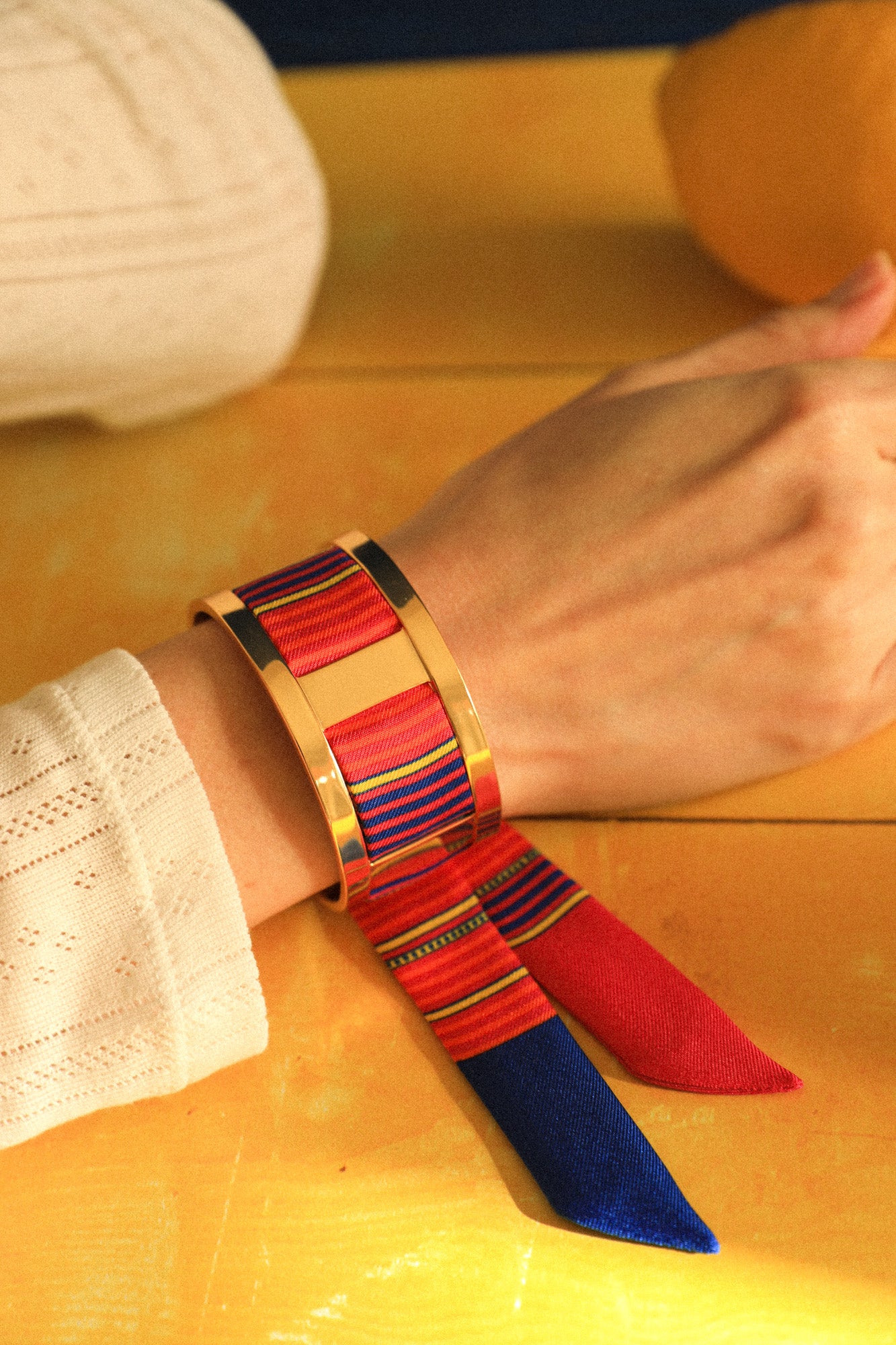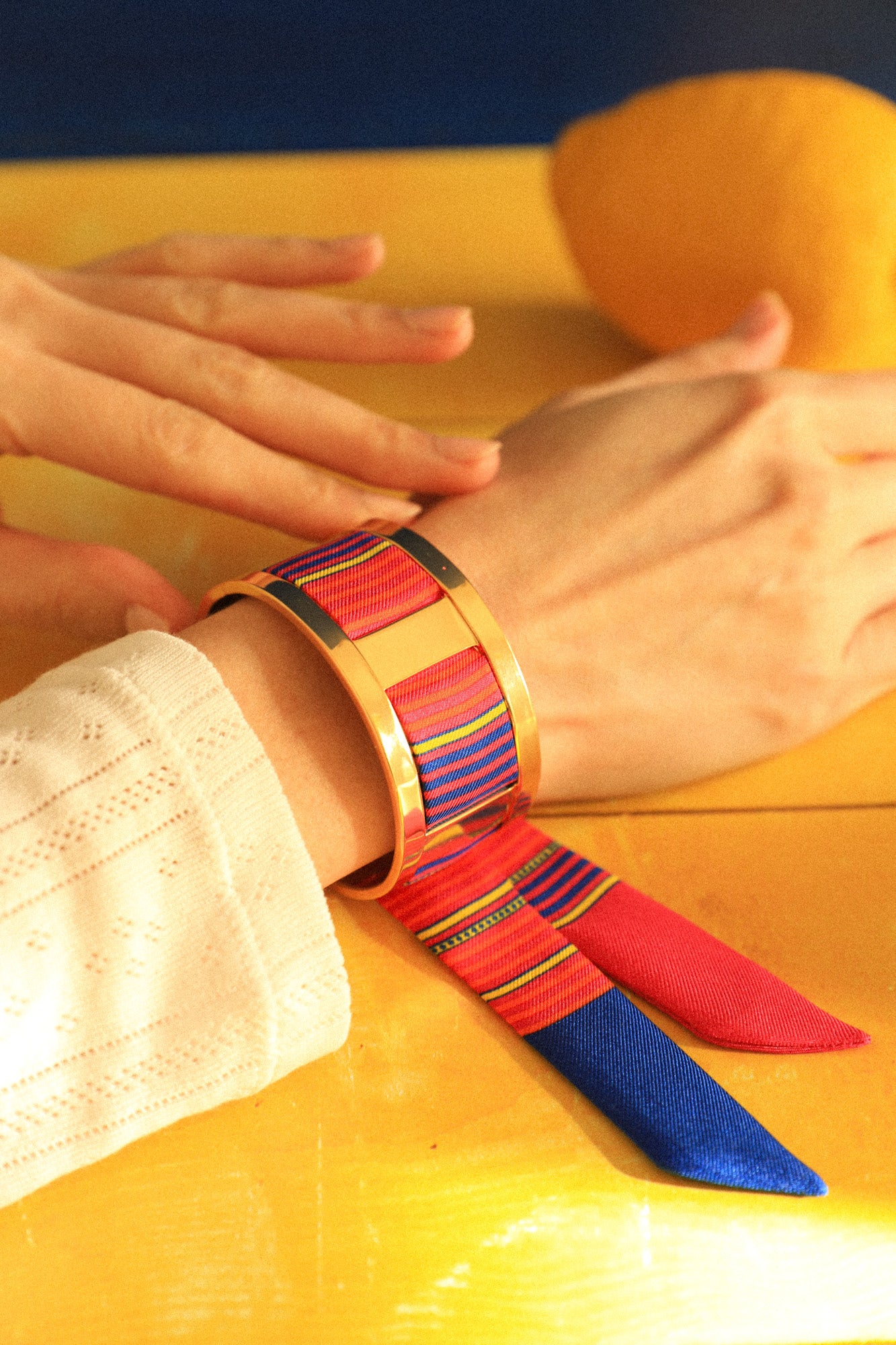La manchette JMA est la manchette signature d'AN-NEE. La toute première à avoir été créée par la créatrice, et le départ de tout l'univers de la collection SÛRE-MESURE, une collection de bijoux hybrides revisitant la soie. Le Concept Nous avons appellé cette manchette la manchette JMA, car c'est une manchette que vous aurez envie de porter jour après jour (J), mois après mois (M), année après année (A). Pourquoi ? Parce que d'une part vous pouvez changer de bracelet en soie au sein d'une même collection mais aussi de toutes les suivantes, et donc d'imprimé, de couleurs, d'humeur... Mais aussi parce que vous pouvez la tisser différemment. Comment ? On vous le montre dans un petit dépliant fourni avec votre manchette, via 7 tissages différents, pour les 7 jours de la semaine.