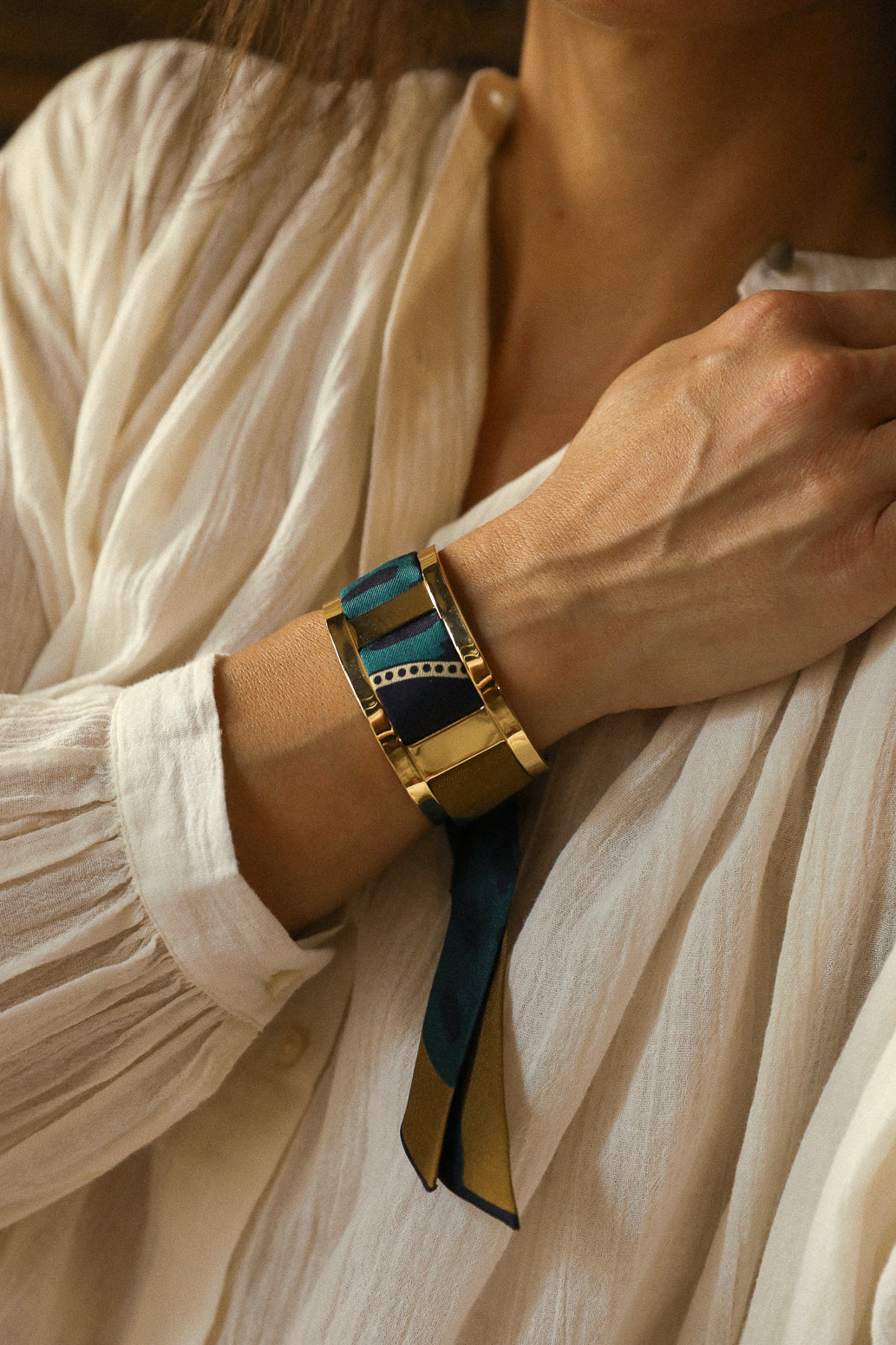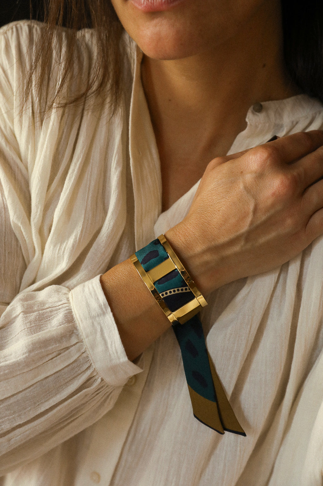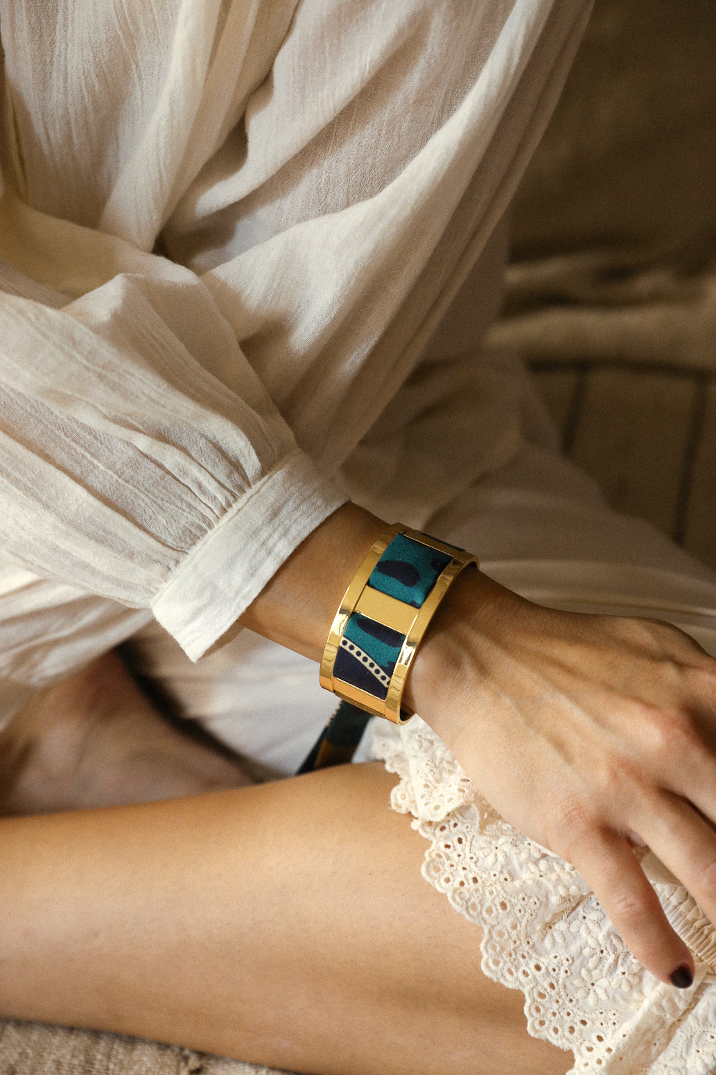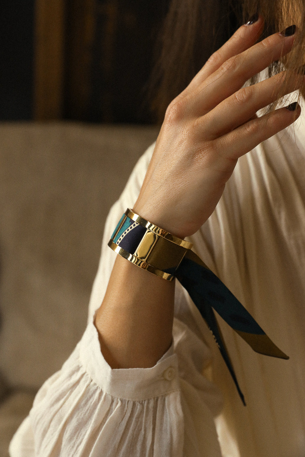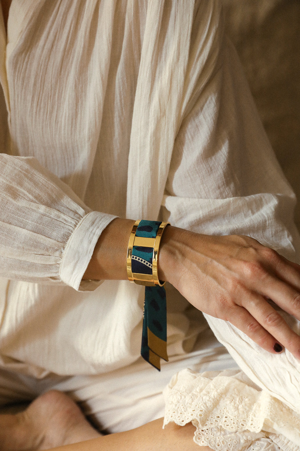 La manchette JMA est la manchette signature d'AN-NEE. La toute première à avoir été créée par la créatrice en 2017, et le départ de tout l'univers des bijoux tissés de soie de la marque, une collection de bijoux personnalisables revisitant la soie. Nous avons appelée cette manchette la manchette JMA, car c'est une manchette que vous aurez envie de porter jour après jour (J), mois après mois (M), année après année (A). Pourquoi ? Parce que d'une part, vous pouvez changer de ruban en soie au sein d'une même collection mais aussi de toutes les suivantes, et donc d'imprimé, de couleurs, d'humeur... Et d’autre part, parce que vous pouvez - aussi - la tisser différemment. Les trous ajourés de la manchette vous permettent en effet, de la couvrir totalement de soie, ou de jouer avec plein d’idées de tissages différents. Comme toutes nos créations, vous pouvez changer de ruban en soie au gré de vos envies, pour que votre manchette vous accompagne dans tous vos looks ;) Si vous souhaitez commander d'autres rubans en soie pour aller avec votre manchette JMA : elle est compatible avec nos rubans en soie de 2 cm