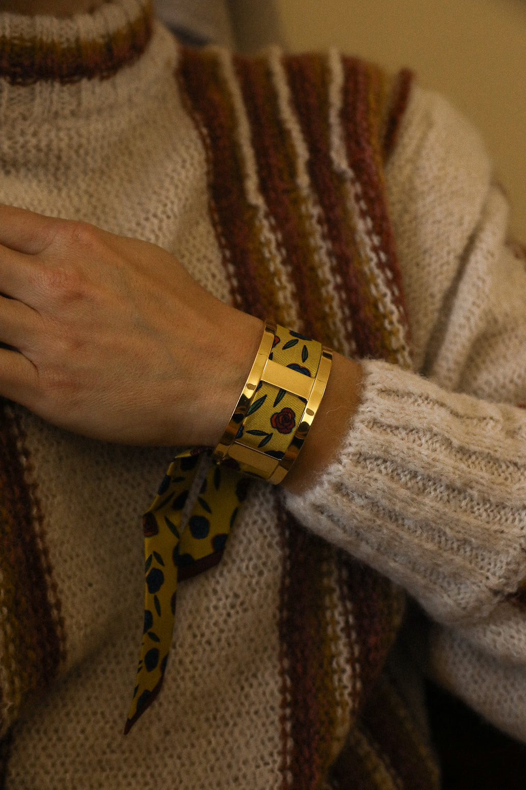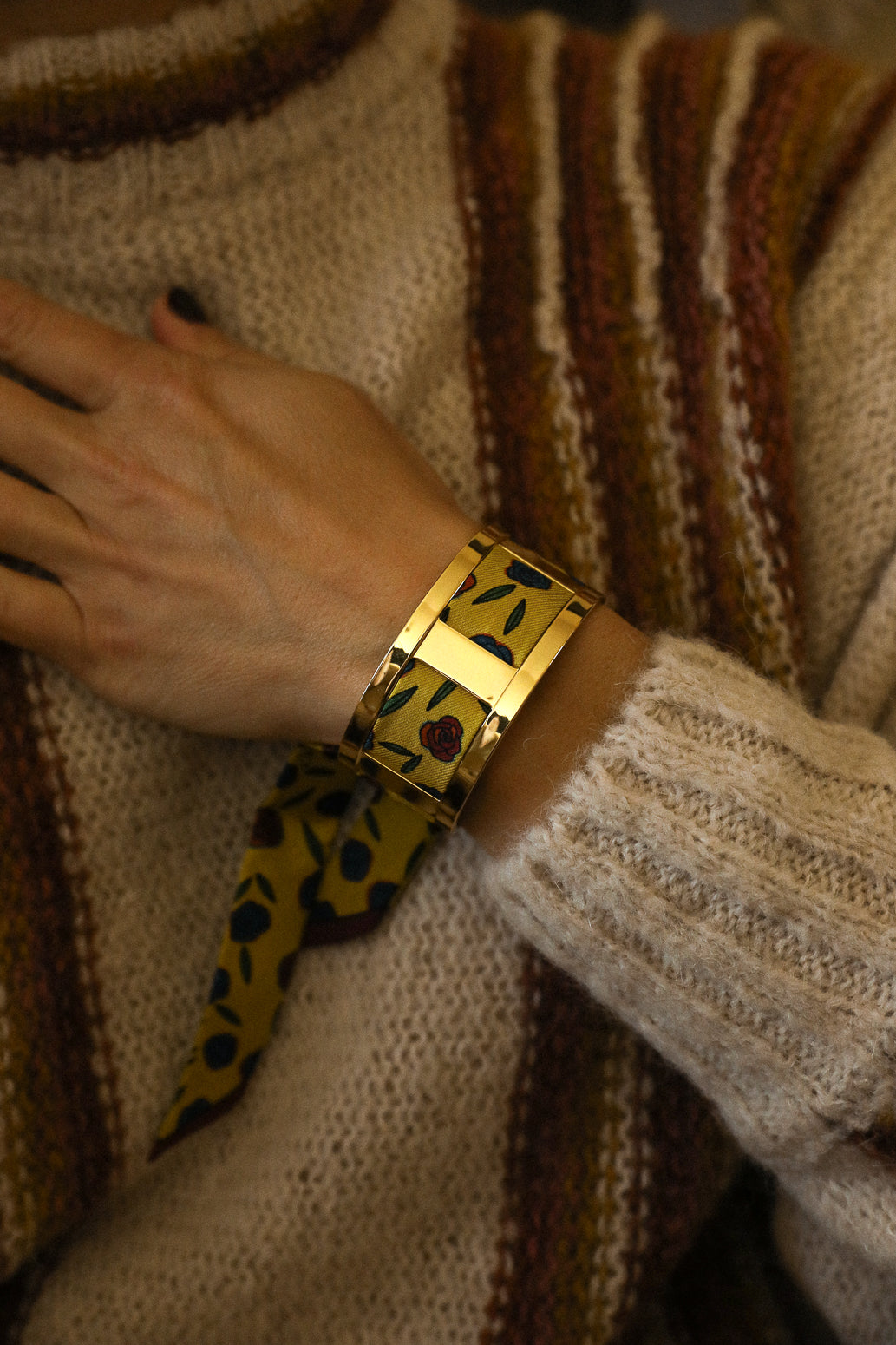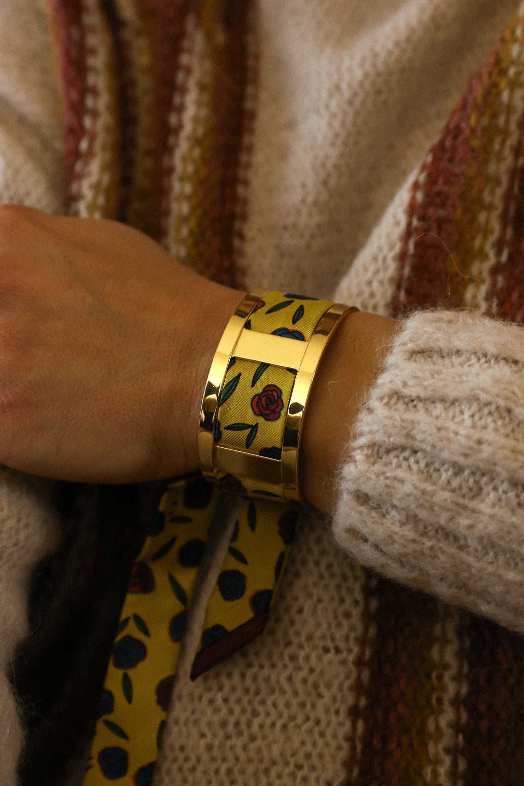 La manchette JMA est la manchette signature d'AN-NEE. La toute première à avoir été créée par la créatrice en 2017, et le départ de tout l'univers des bijoux tissés de soie de la marque, une collection de bijoux personnalisables revisitant la soie. Nous avons appelée cette manchette la manchette JMA, car c'est une manchette que vous aurez envie de porter jour après jour (J), mois après mois (M), année après année (A). Pourquoi ? Parce que d'une part, vous pouvez changer de ruban en soie au sein d'une même collection mais aussi de toutes les suivantes, et donc d'imprimé, de couleurs, d'humeur... Et d’autre part, parce que vous pouvez - aussi - la tisser différemment. Les trous ajourés de la manchette vous permettent en effet, de la couvrir totalement de soie, ou de jouer avec plein d’idées de tissages différents. Comme toutes nos créations, vous pouvez changer de ruban en soie au gré de vos envies, pour que votre manchette vous accompagne dans tous vos looks ;) Si vous souhaitez commander d'autres rubans en soie pour aller avec votre manchette JMA : elle est compatible avec nos rubans en soie de 2 cm