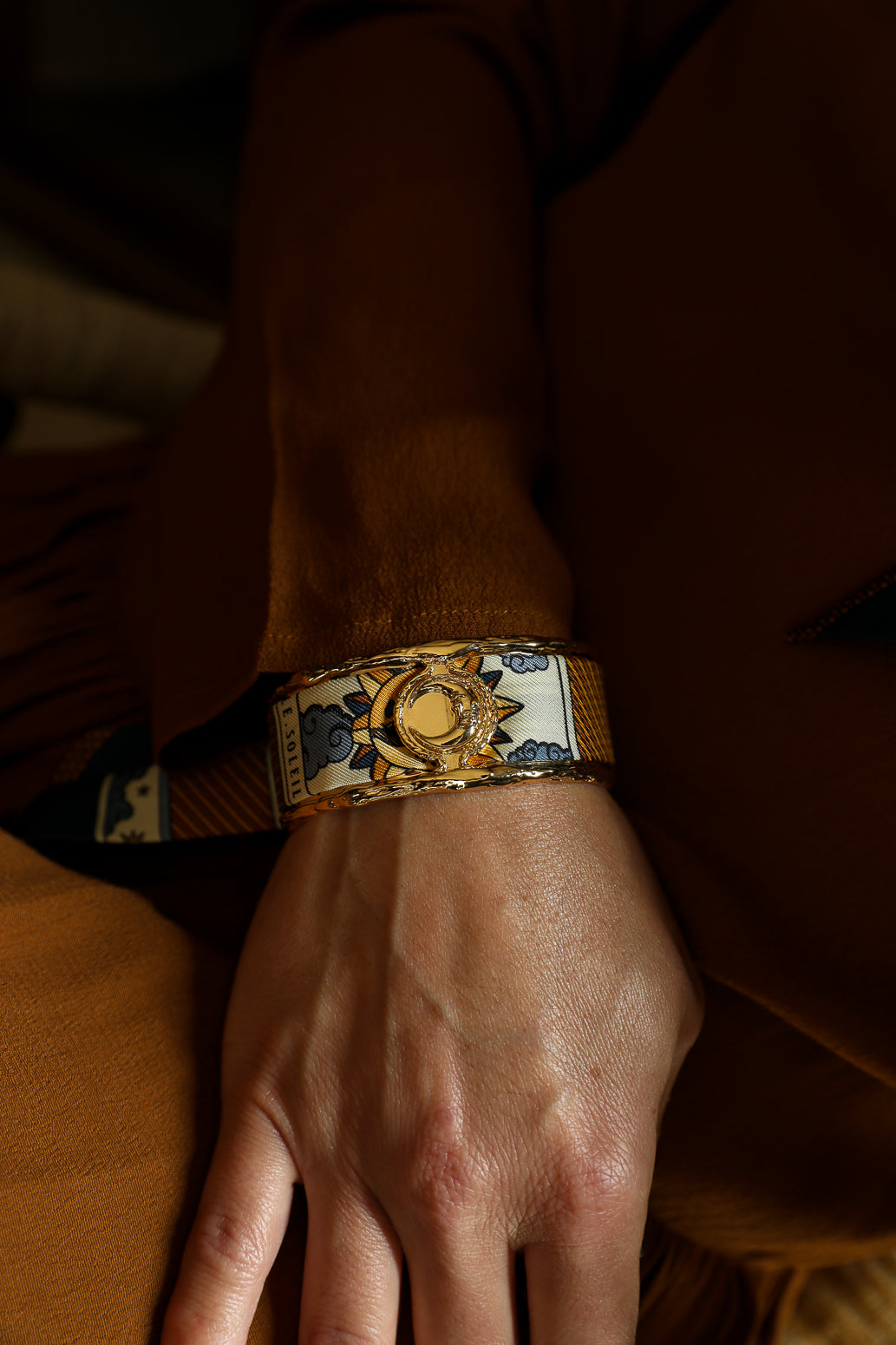 Une manchette très figurative best-seller chez AN-NEE, avec un médaillon central représentant une petite lune et aux gouttières matiérées et assymétriques.