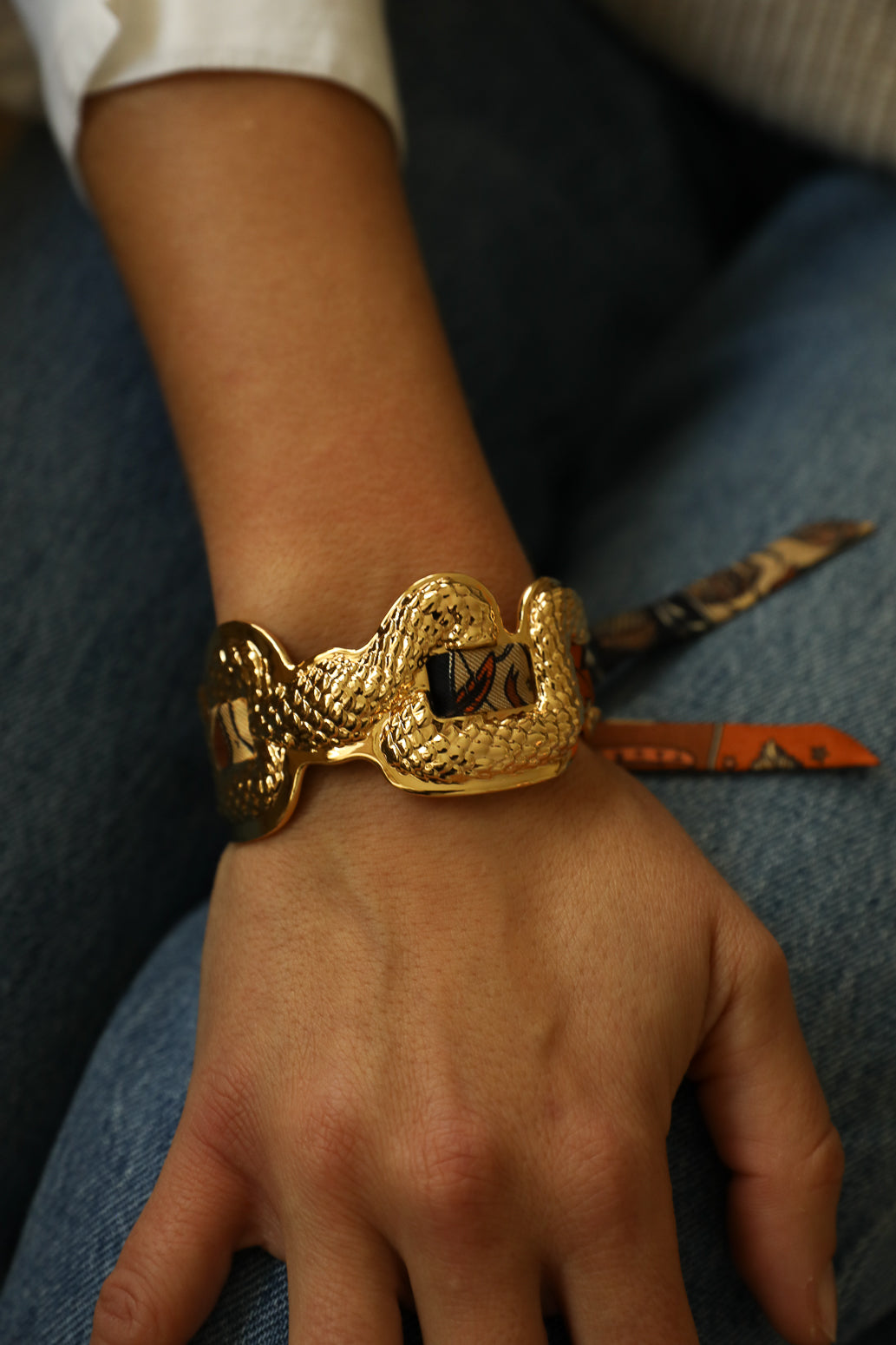 A toutes les amoureuses des symboles rock comme le Serpent, mais aussi les fans de bijoux sculpturaux qui ne passent pas inaperçus : notre manchette est faite pour vous. Oui, la soie est plus anecdotique une fois tissée dans cette manchette, mais elle lui apporte cette petite touche de couleur pour encore plus de caractère !