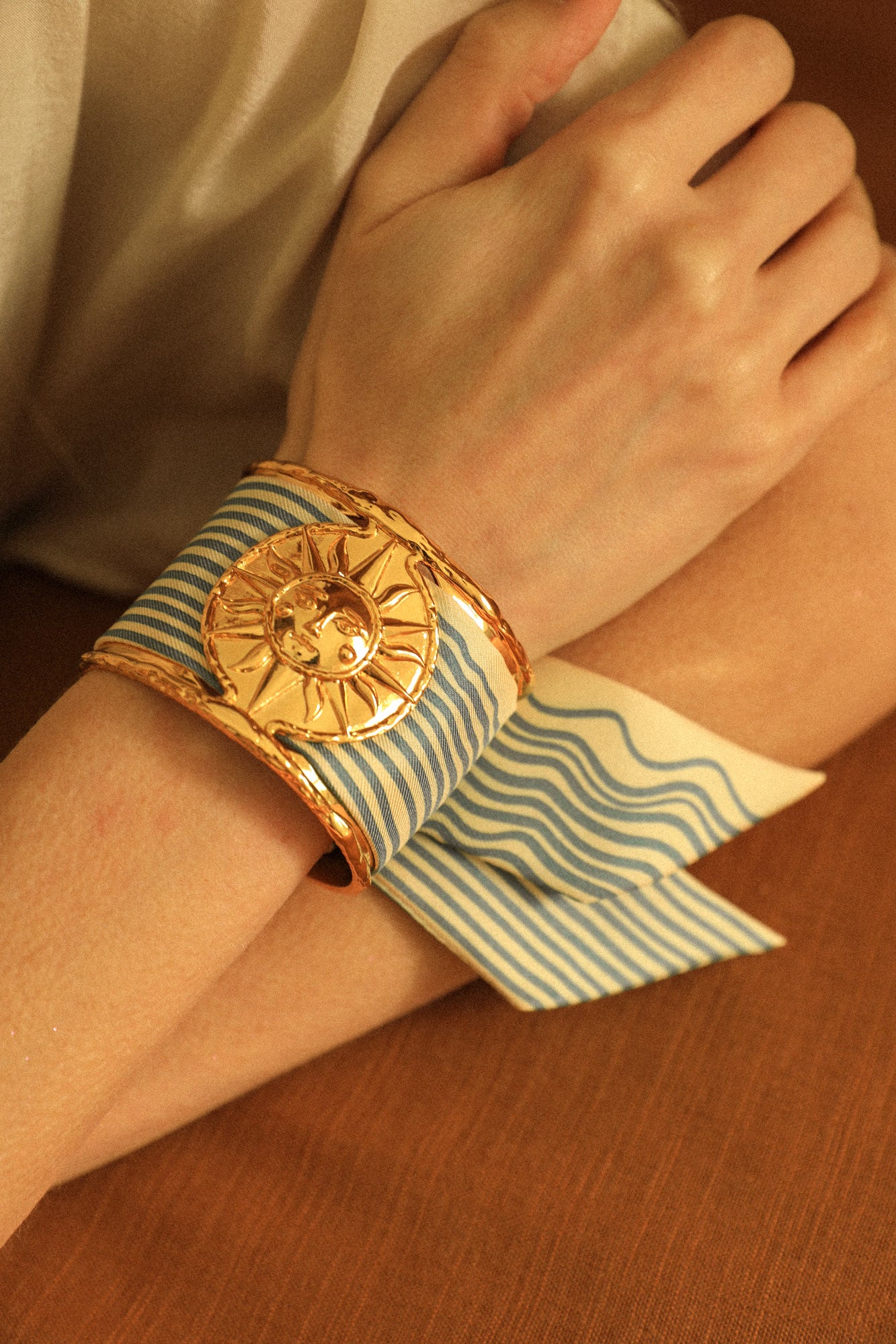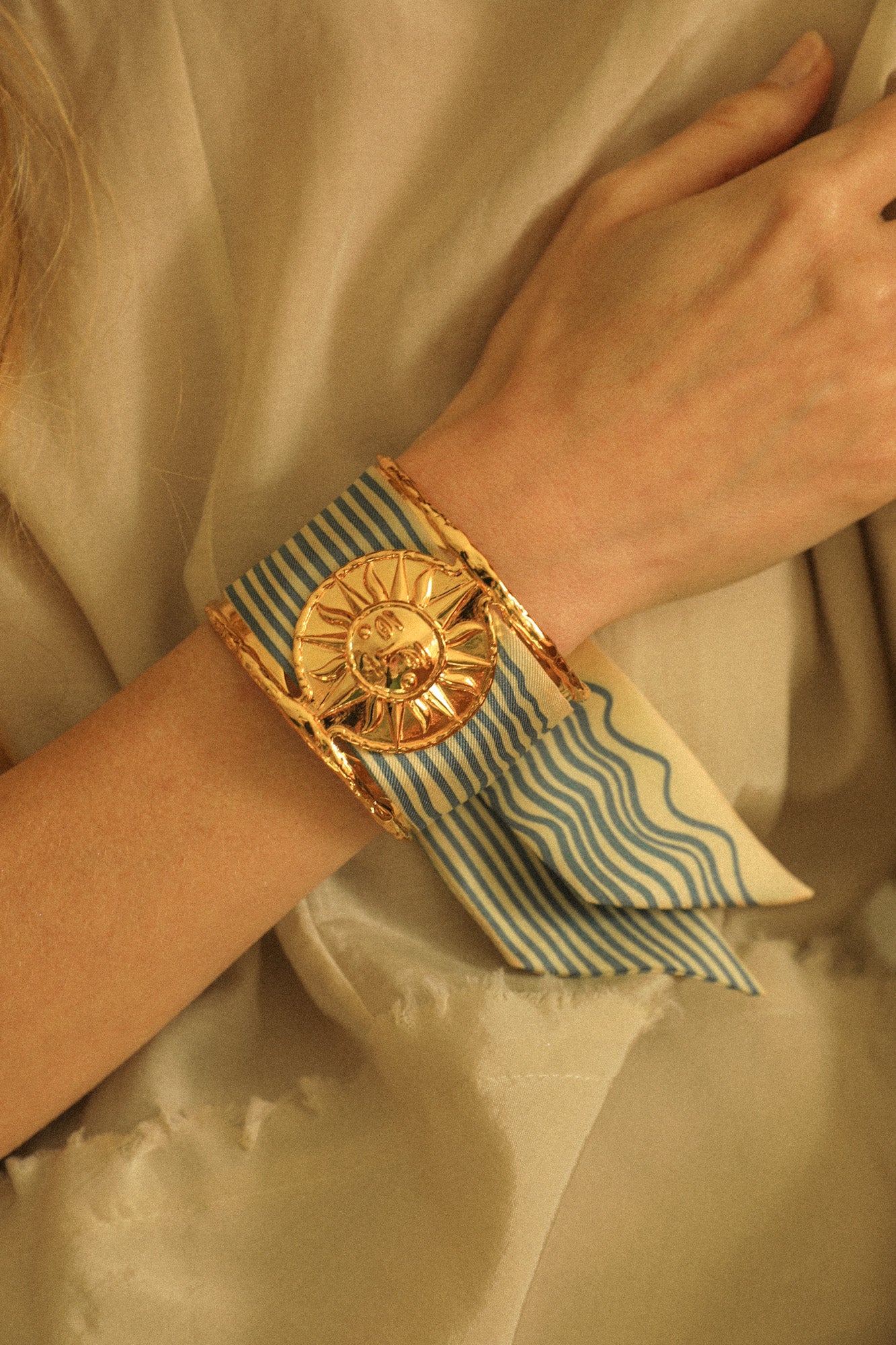 La manchette SOLEIL est l'une de mes manchettes les plus figuratives. Beaucoup d'entre vous savent que le Soleil est une source d'inspiration très récurrente pour moi. Sa symbolique a un effet très apaisant, je vis au soleil à Marseille, il y a sûrement un peu de ça aussi. Je l'ai voulue grande, du haut de ses 5 cm, est très sculpturale pour un style très fort.