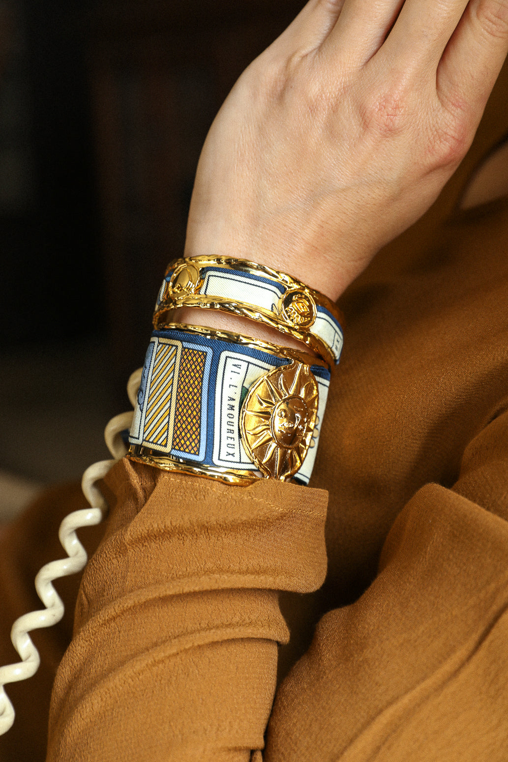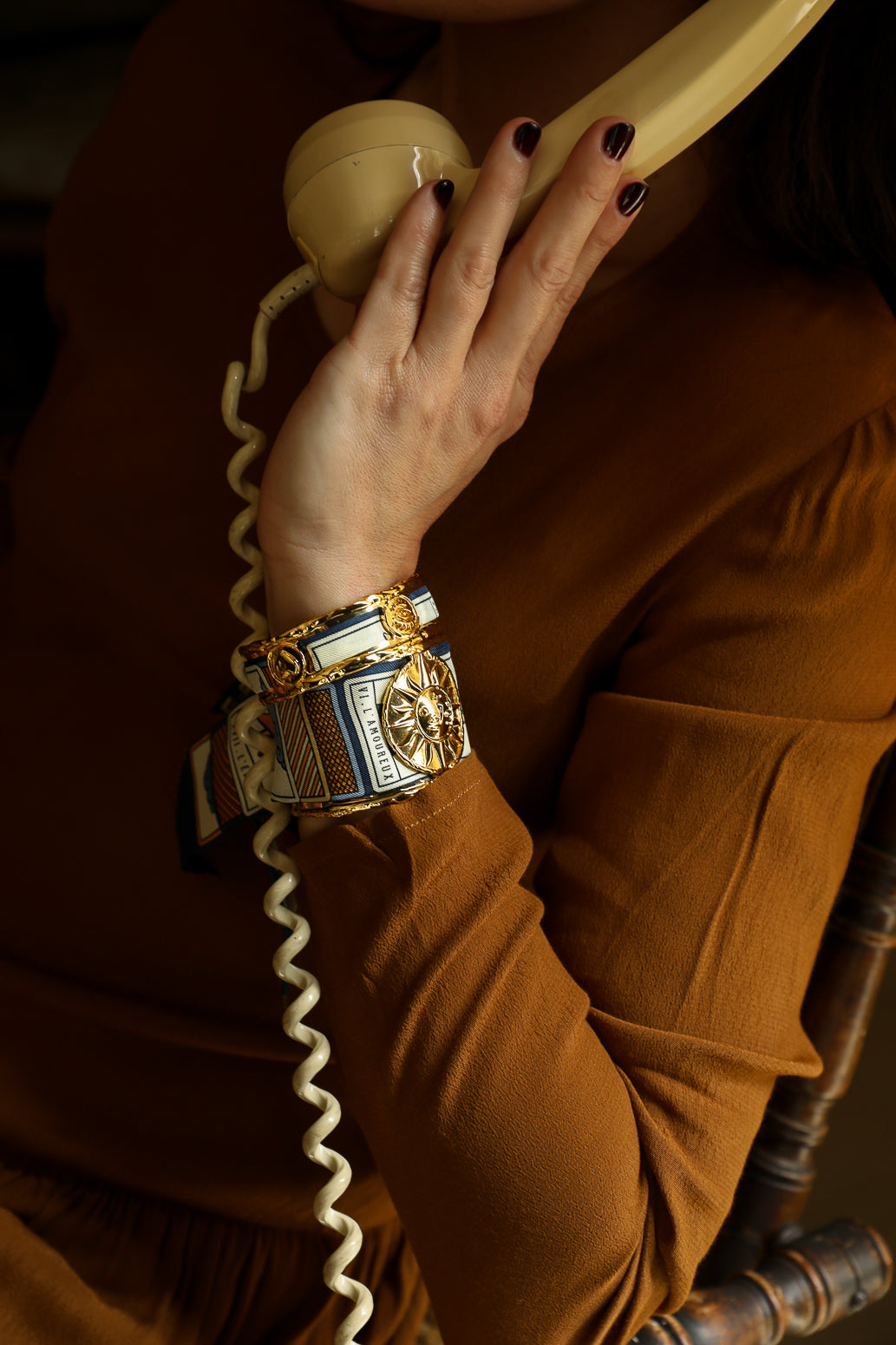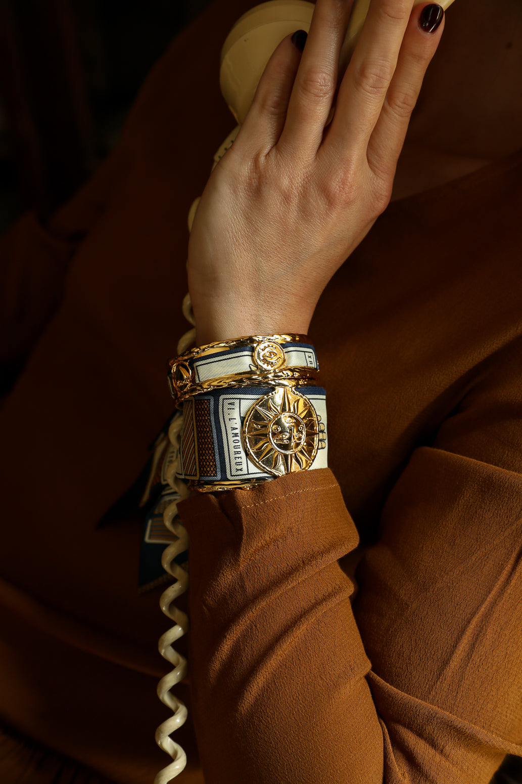 La manchette SOLEIL est l'une de nos manchettes les plus figuratives, devenue intemporelle. Le Soleil étant une source d'inspiration très récurrente pour la créatrice, elle l’a voulue grande, du haut de ses 5 cm, est très sculpturale pour un style très fort.