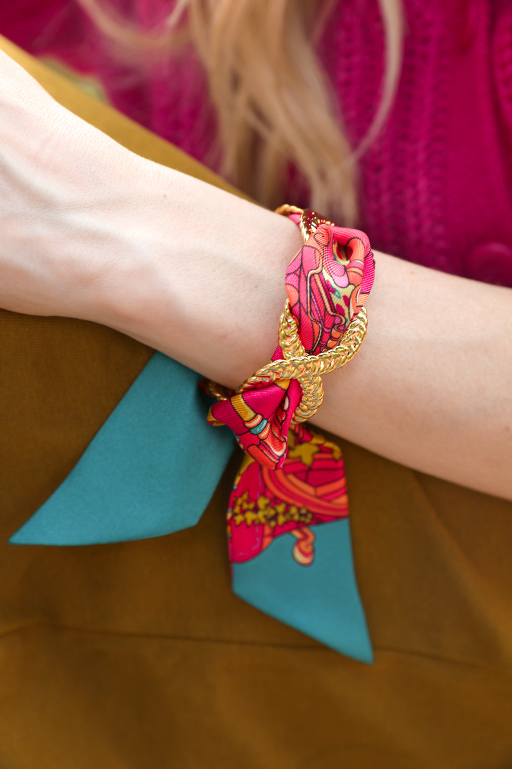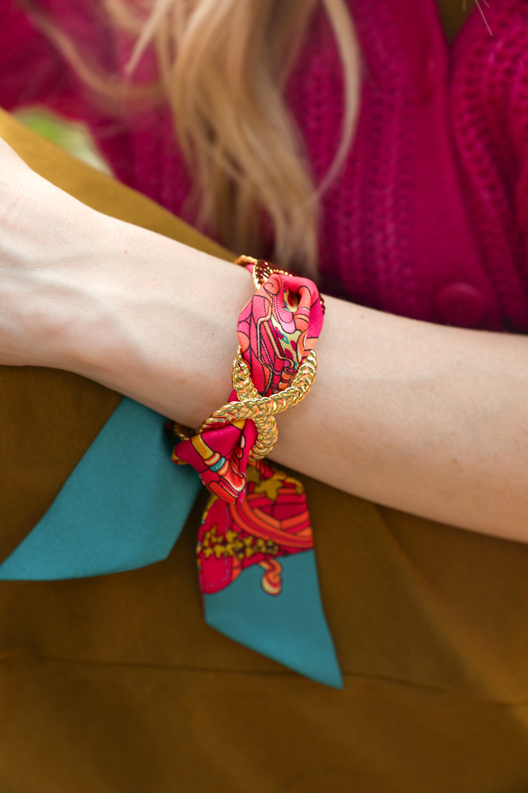 Comme toutes nos créations, vous pouvez changer de ruban en soie au gré de vos envies, en détissant ou retissant votre manchette.