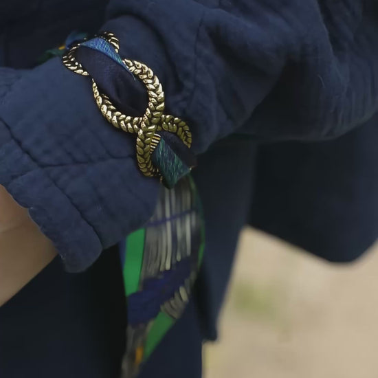 Comme toutes nos créations, vous pouvez changer de ruban en soie au gré de vos envies, en détissant ou retissant votre manchette.