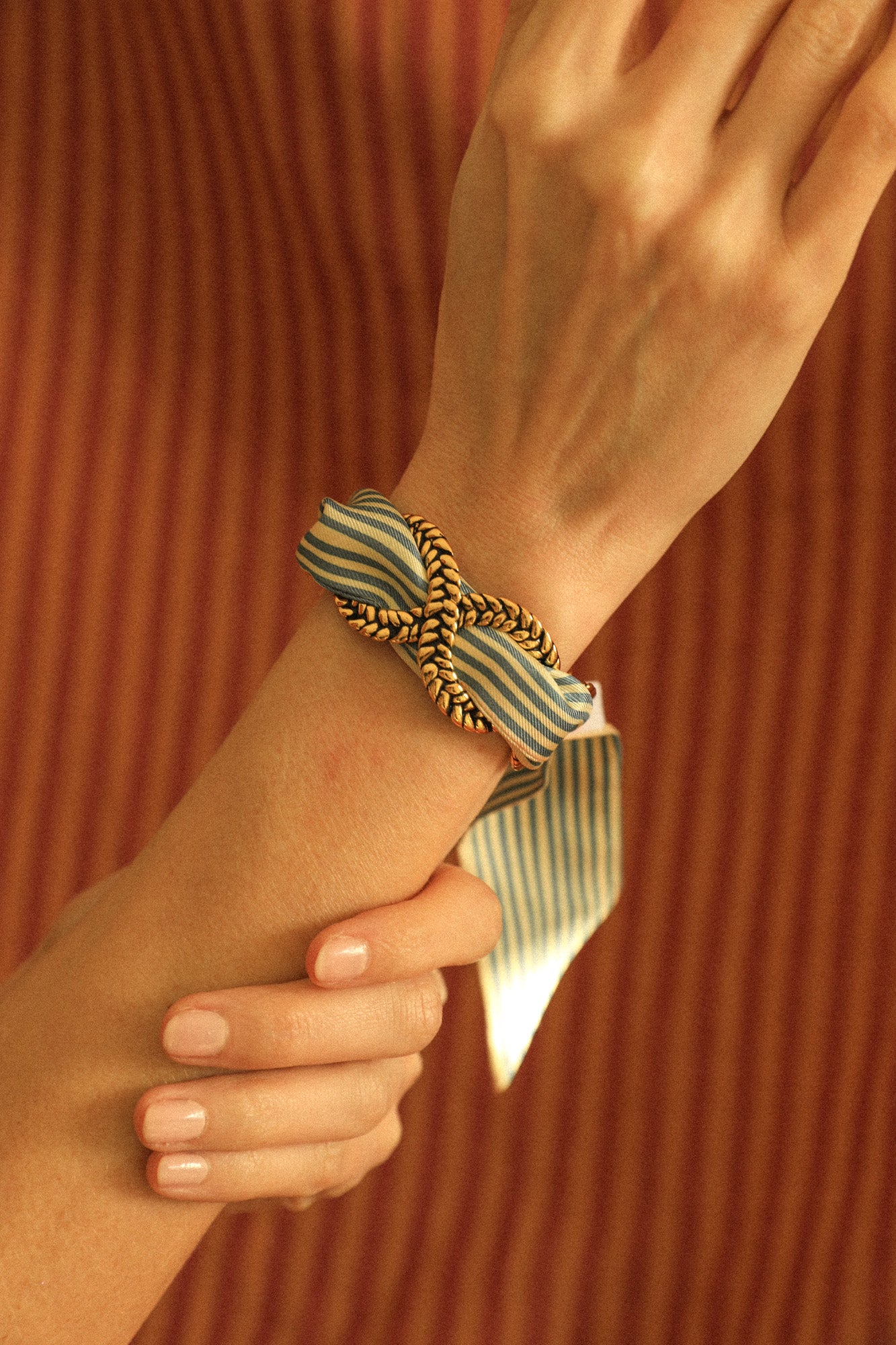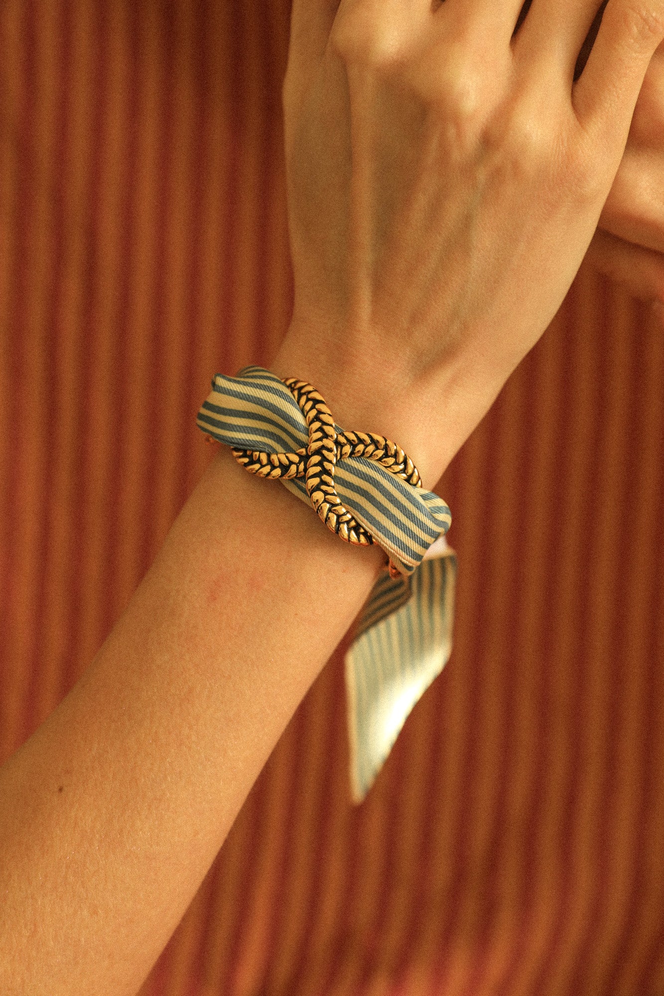 Comme toutes nos créations, vous pouvez changer de ruban en soie au gré de vos envies, en détissant ou retissant votre manchette.