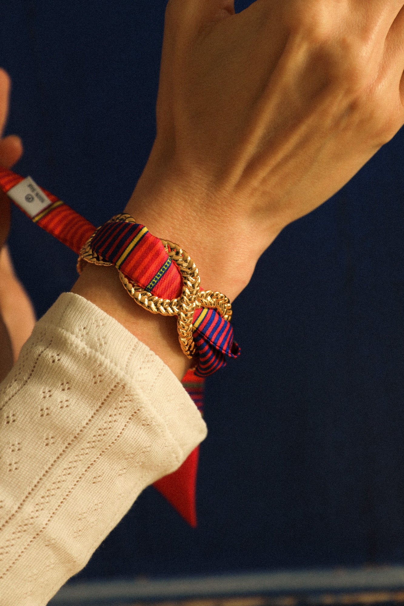 Comme toutes nos créations, vous pouvez changer de ruban en soie au gré de vos envies, en détissant ou retissant votre manchette.