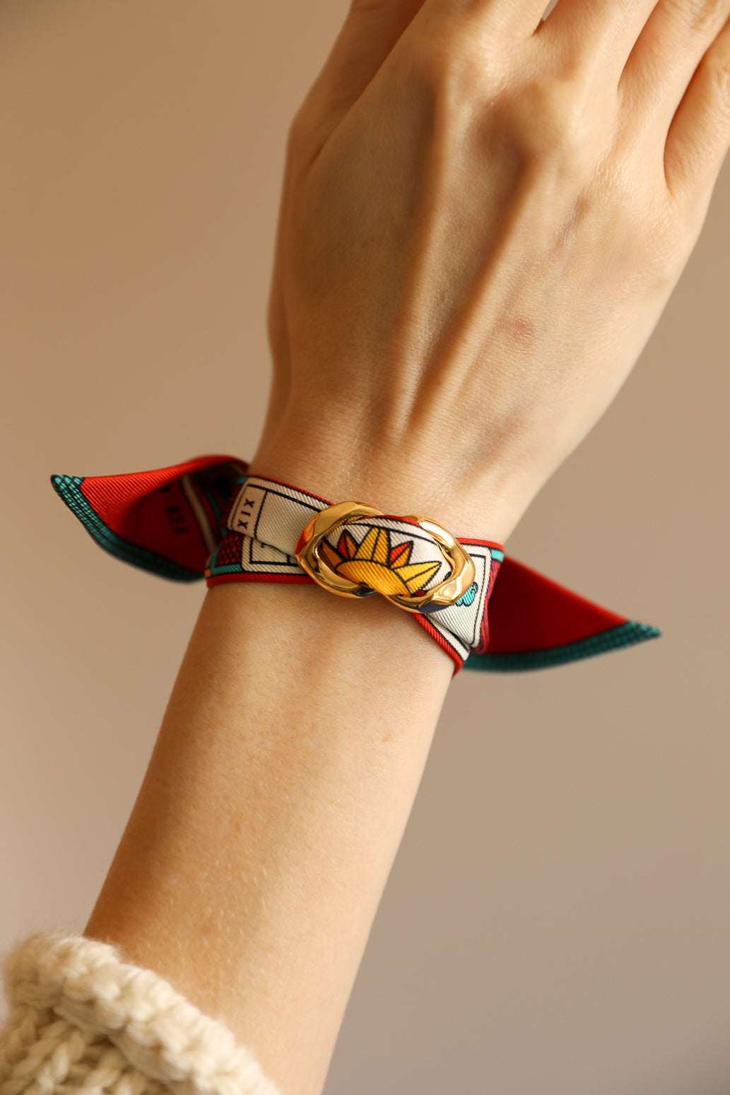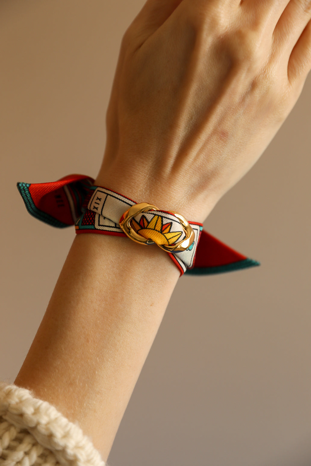 Association du bracelet en soie de 4cm Tarot multicolore, tissé avec l’ornement Décembre. Le bracelet en soie se noue avec un double noeud au poignet, l’ornement Décembre est amovible ce qui permet de porter le ruban en soie seul si vous le souhaitez. L’ensemble est livré dans un coffret bijou et déjà associé. Notre bracelet en soie est Labellisé « Fabriqué à Paris 2025 », label décerné par la Mairie de Paris pour notre fabrication d’excellence à Paris même. Si vous souhaitez commander des rubans en soie supplémentaires pour aller avec votre ornement Décembre : il est compatible avec nos rubans en soie de 4 cm et de 2cm. La différence entre les deux tailles de rubans : du volume et des fronces tissé sur le ruban en soie de 4cm, un effet complètement plat sur un ruban de 2cm.