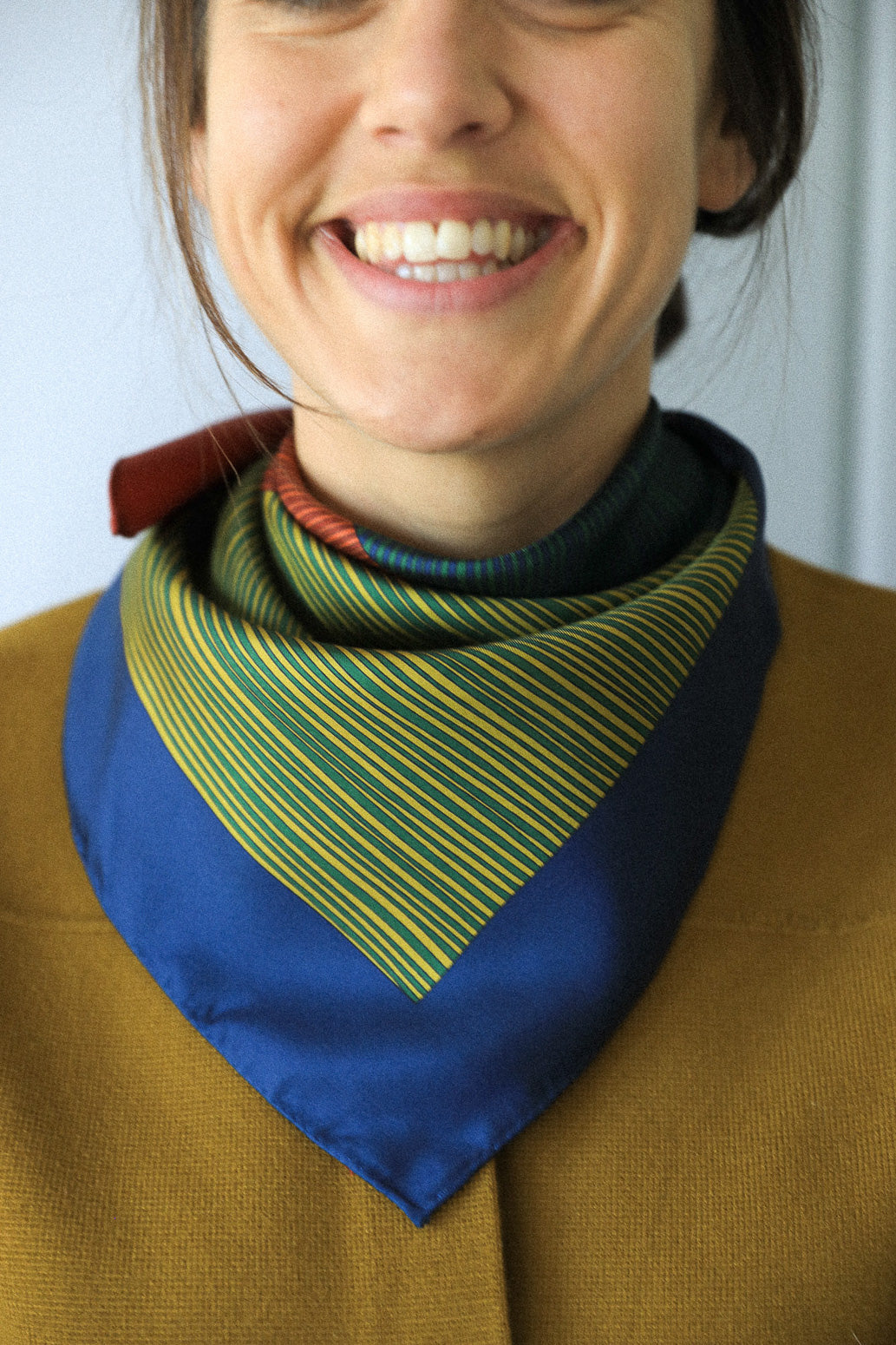 La bonne taille, avec ses 66cm par 66cm, la gamme de couleurs choisie par la créatrice est pensée pour aller aussi bien avec un costume que sur tenue plus casual.