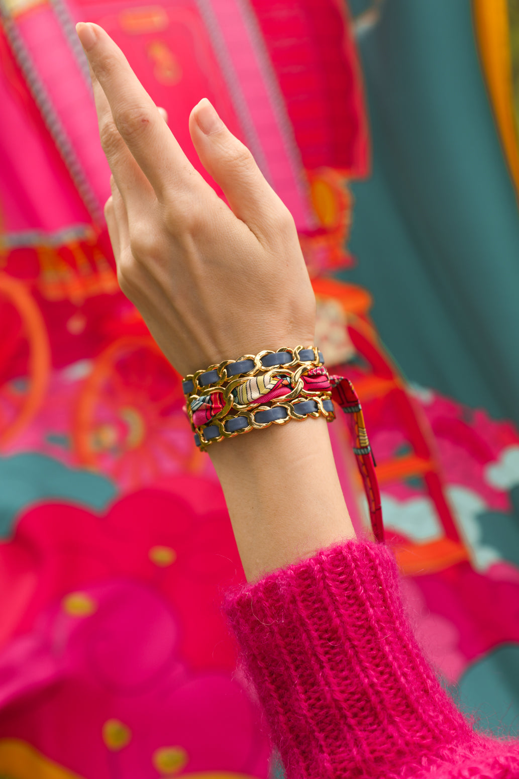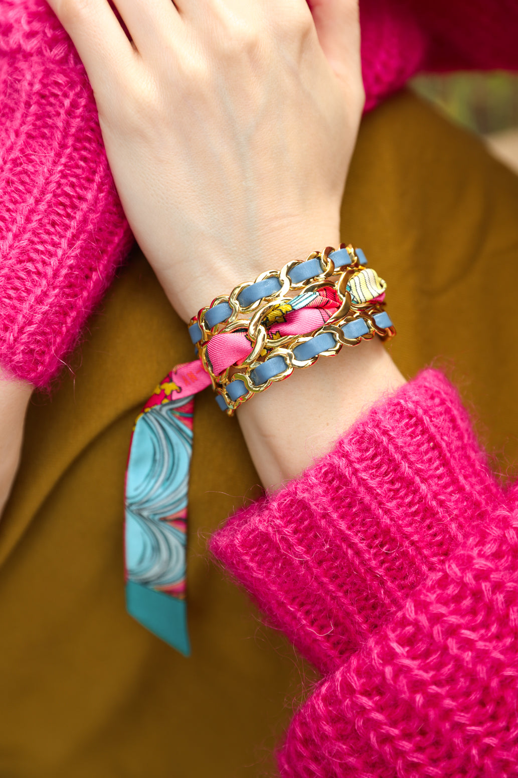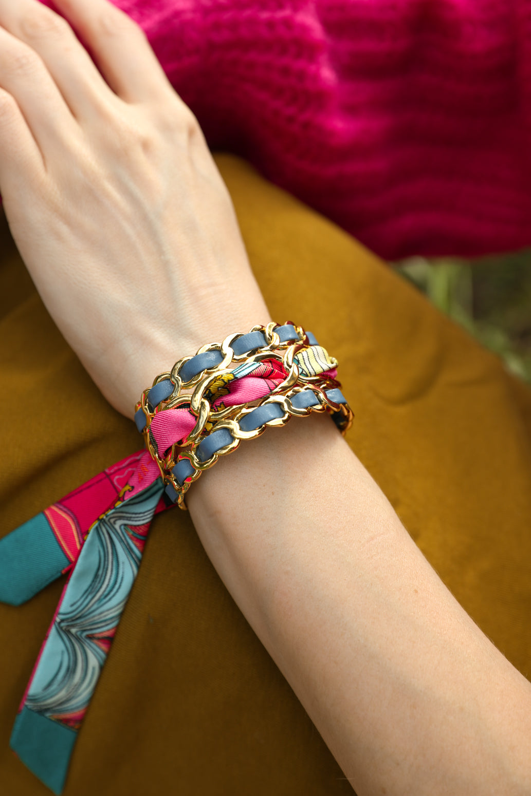 Comme toutes nos créations, vous pouvez changer de ruban en soie au gré de vos envies, en détissant ou retissant votre manchette.