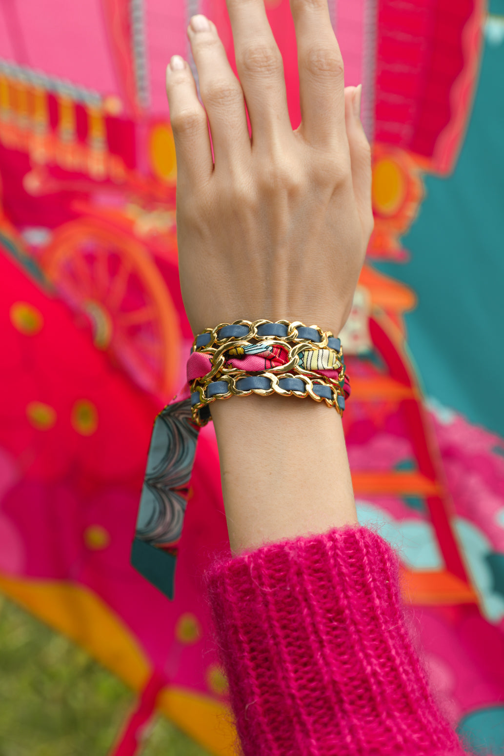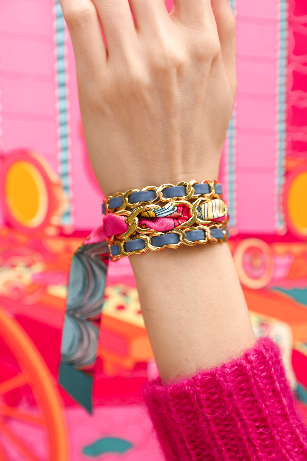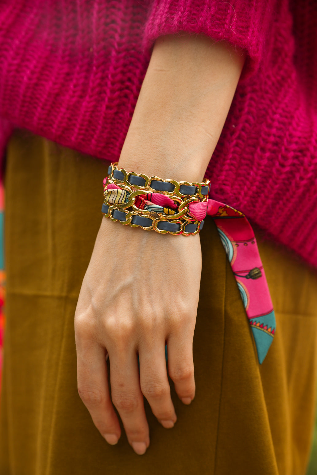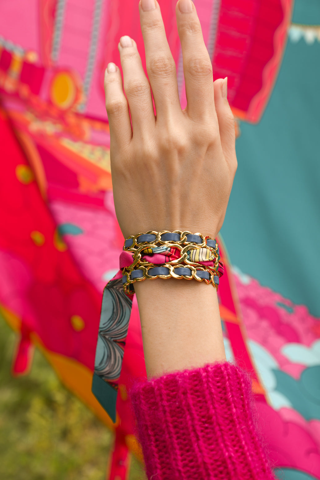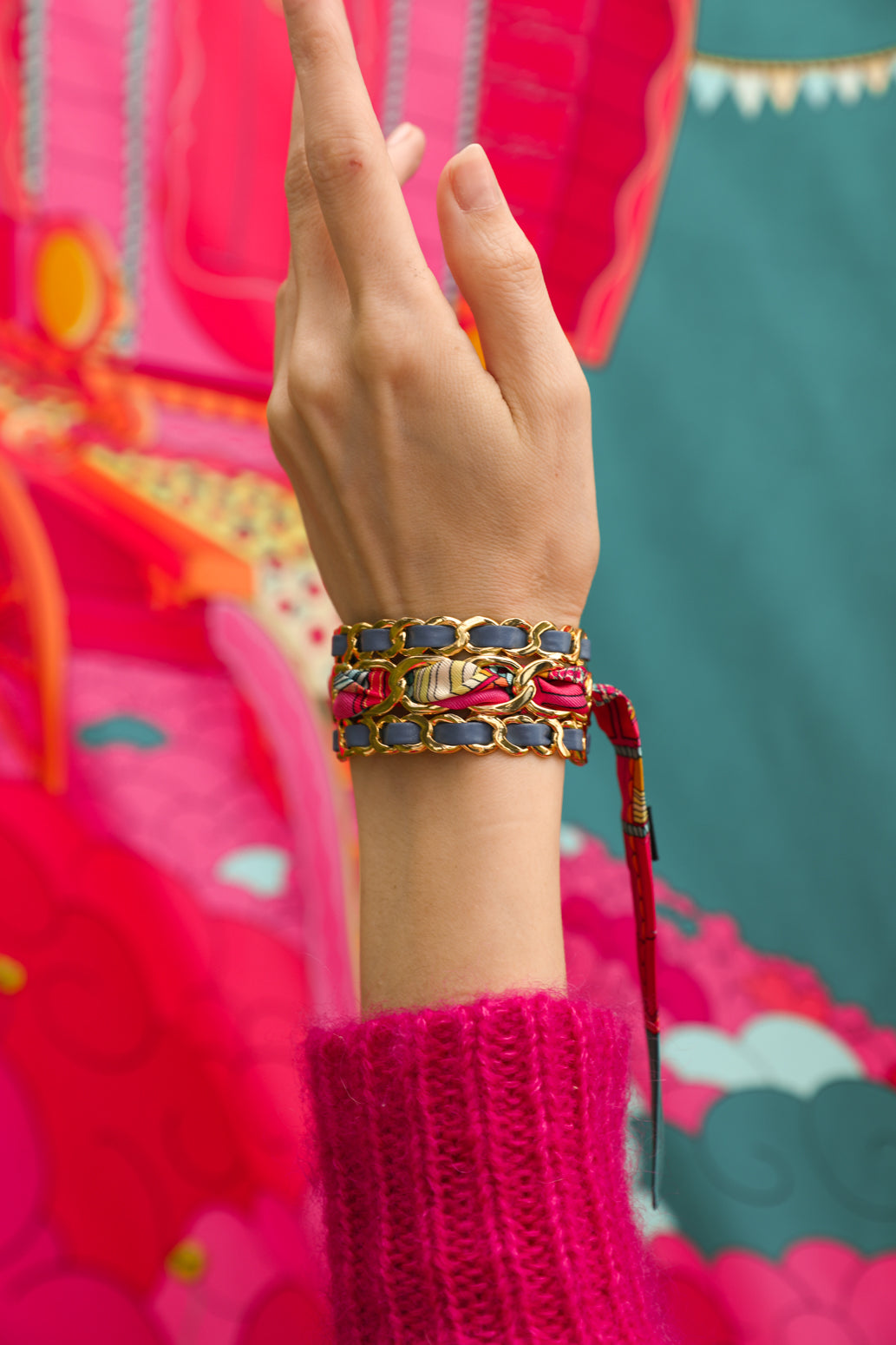 La petite manchette Décembre est notre nouveauté d’élégance de la saison Automne-Hiver 2025/26, faite de chaînes et tissée de simili-cuir et soie.