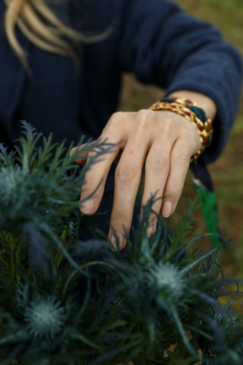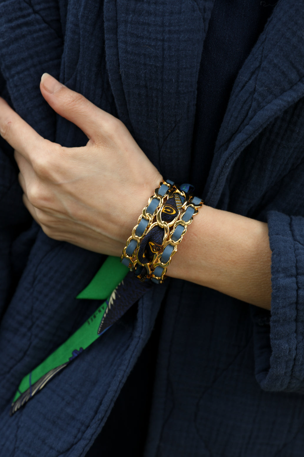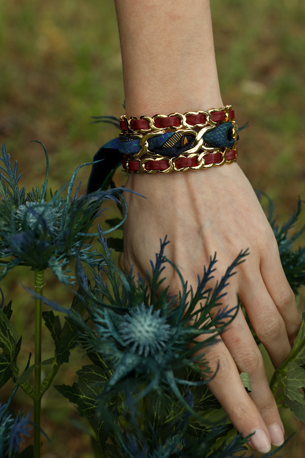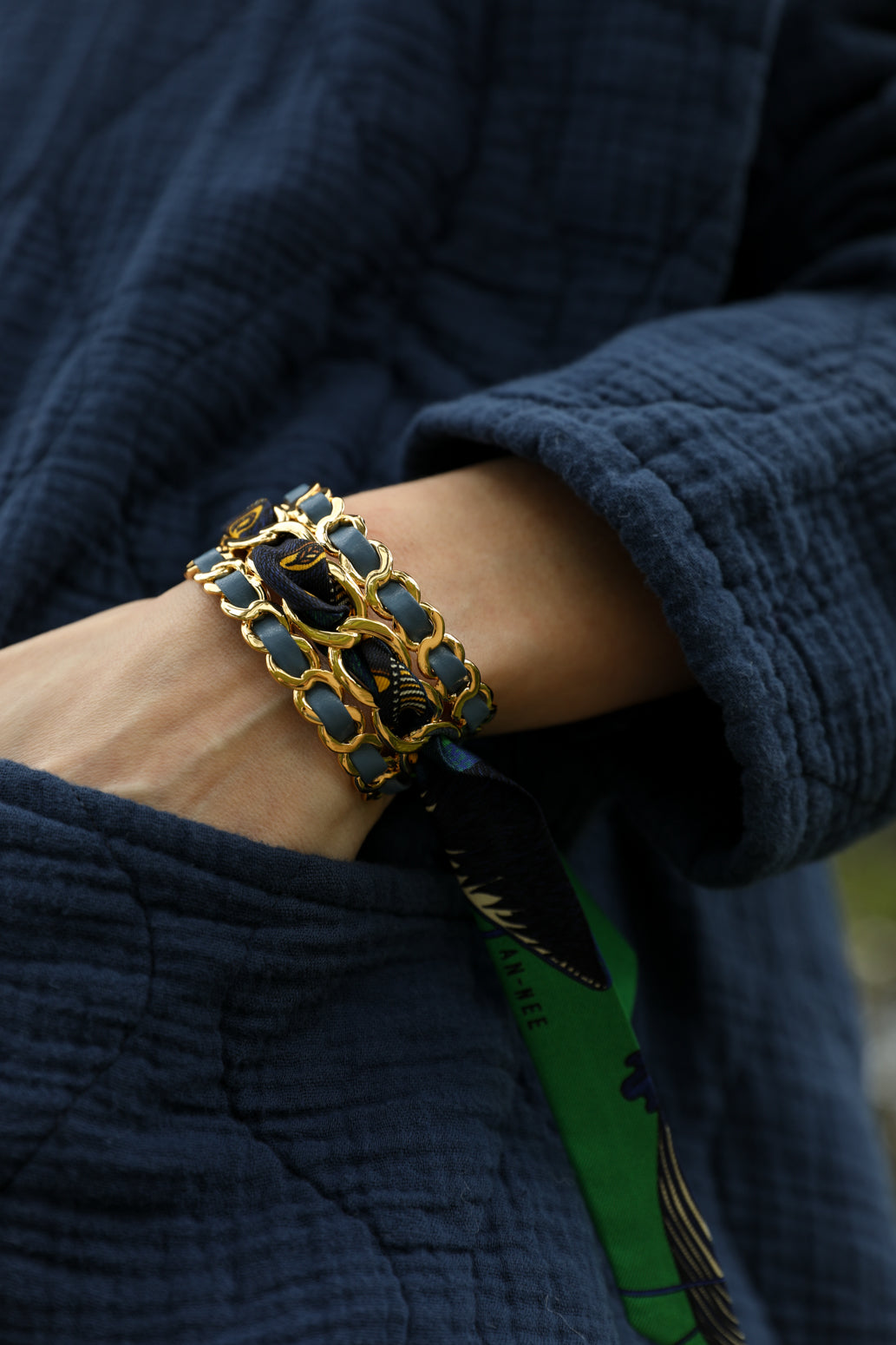 Comme toutes nos créations, vous pouvez changer de ruban en soie au gré de vos envies, en détissant ou retissant votre manchette.