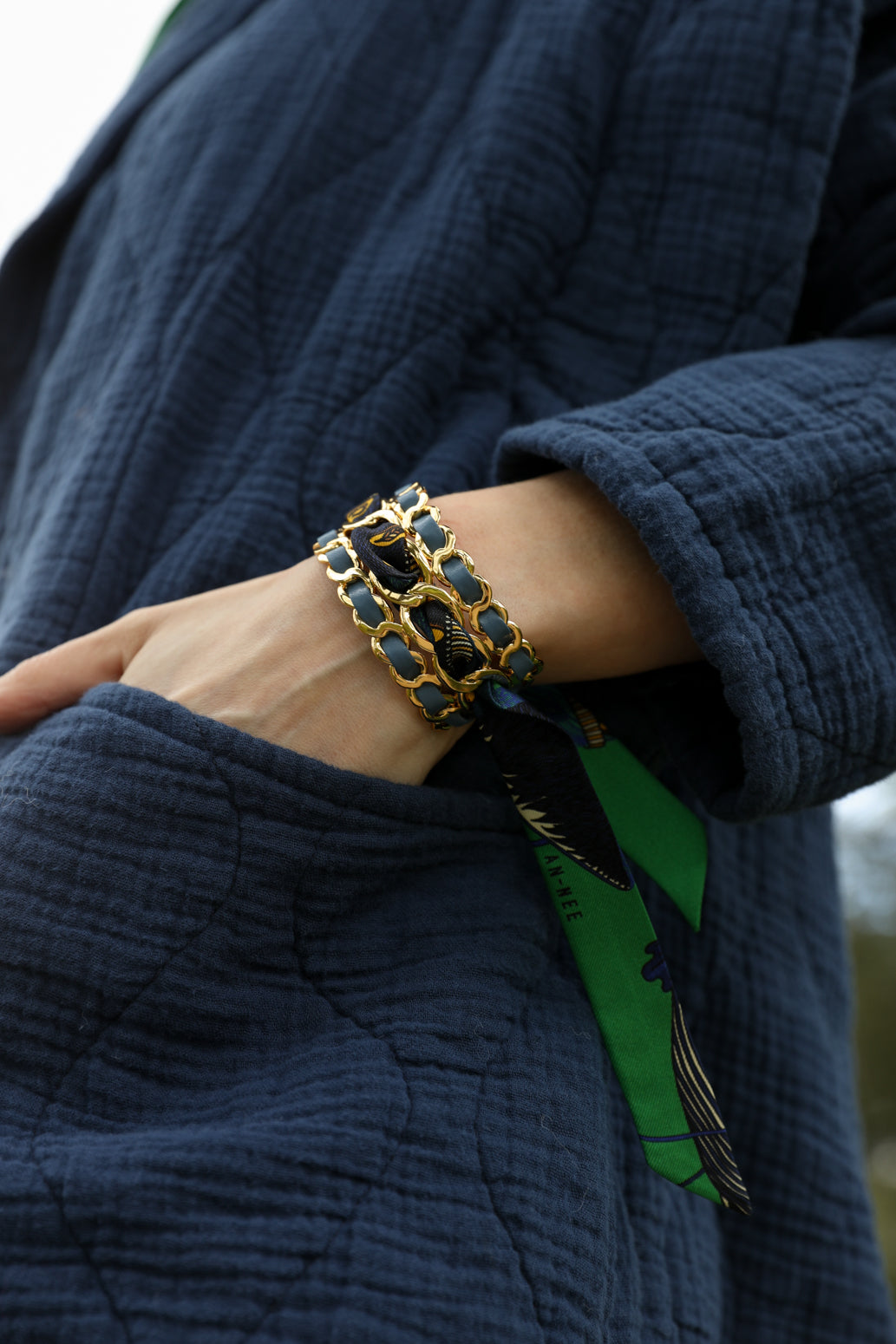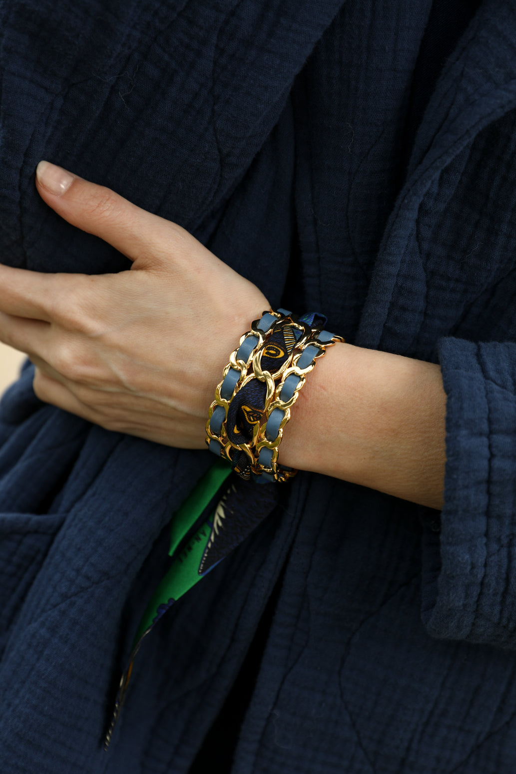 La petite manchette Décembre est notre nouveauté d’élégance de la saison Automne-Hiver 2025/26, faite de chaînes et tissée de simili-cuir et soie.