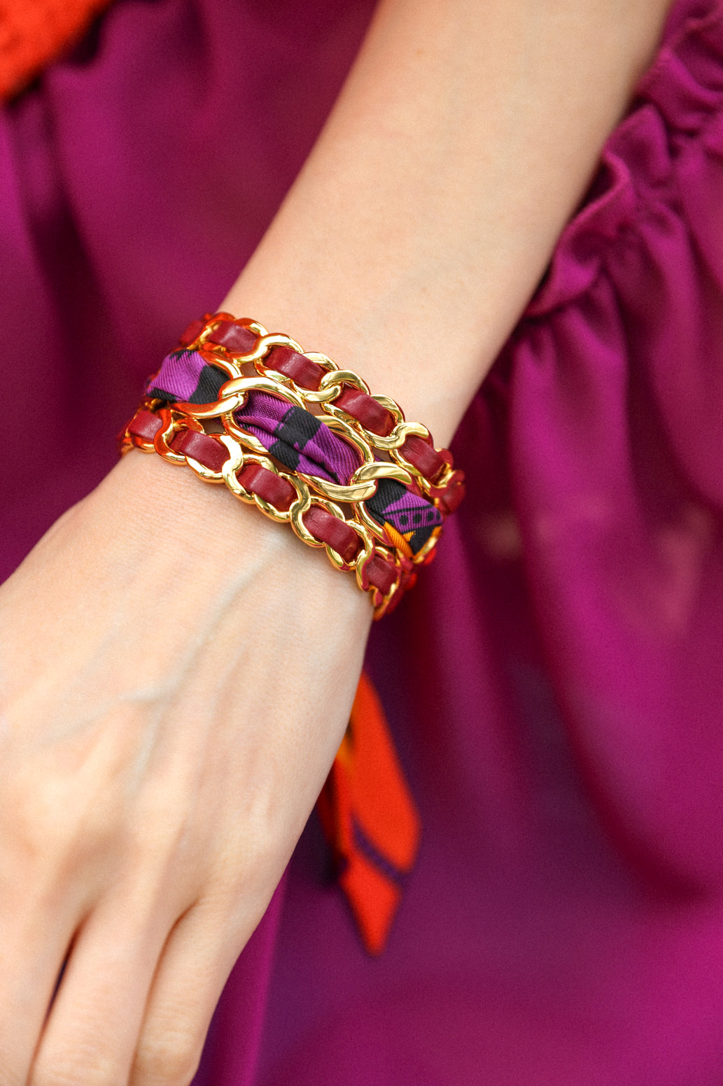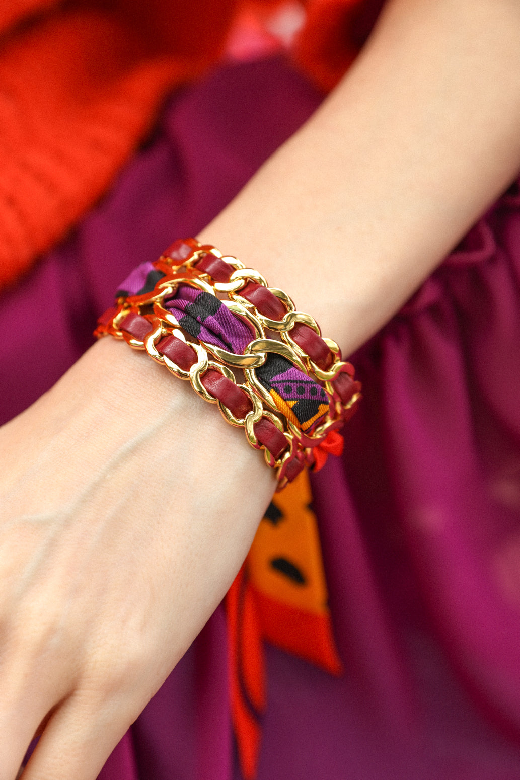 La petite manchette Décembre est notre nouveauté d’élégance de la saison Automne-Hiver 2025/26, faite de chaînes et tissée de simili-cuir et soie.