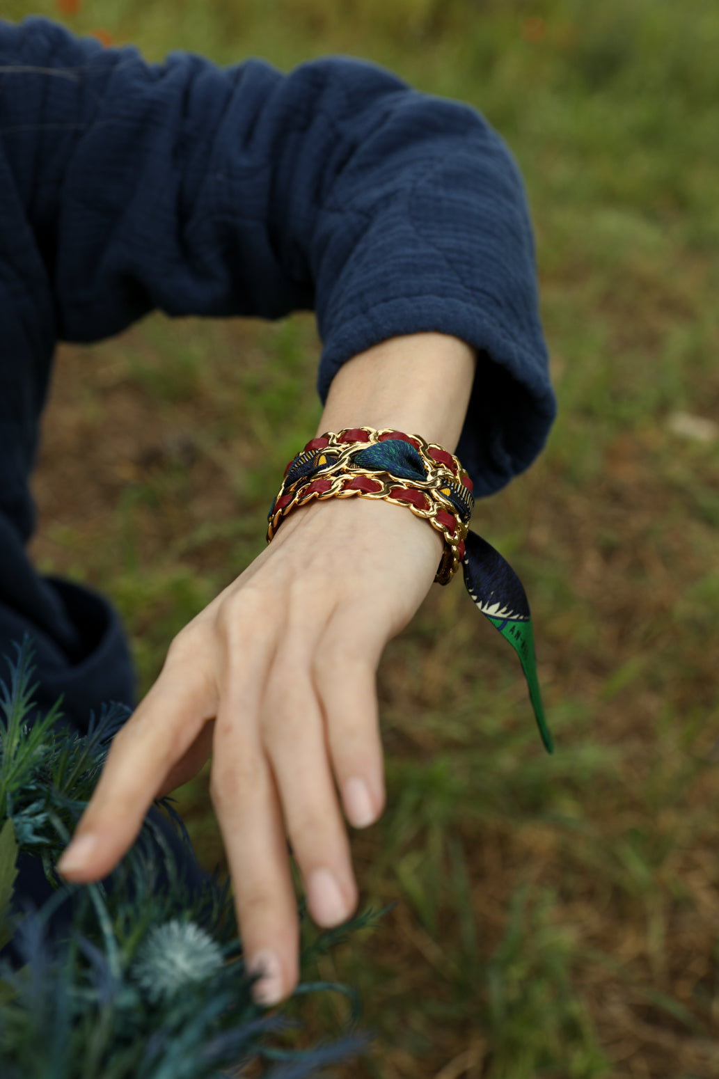 Comme toutes nos créations, vous pouvez changer de ruban en soie au gré de vos envies, en détissant ou retissant votre manchette. Si vous souhaitez commander d'autres rubans en soie pour aller avec votre petite manchette Décembre : elle est compatible avec nos rubans en soie de 2 cm.