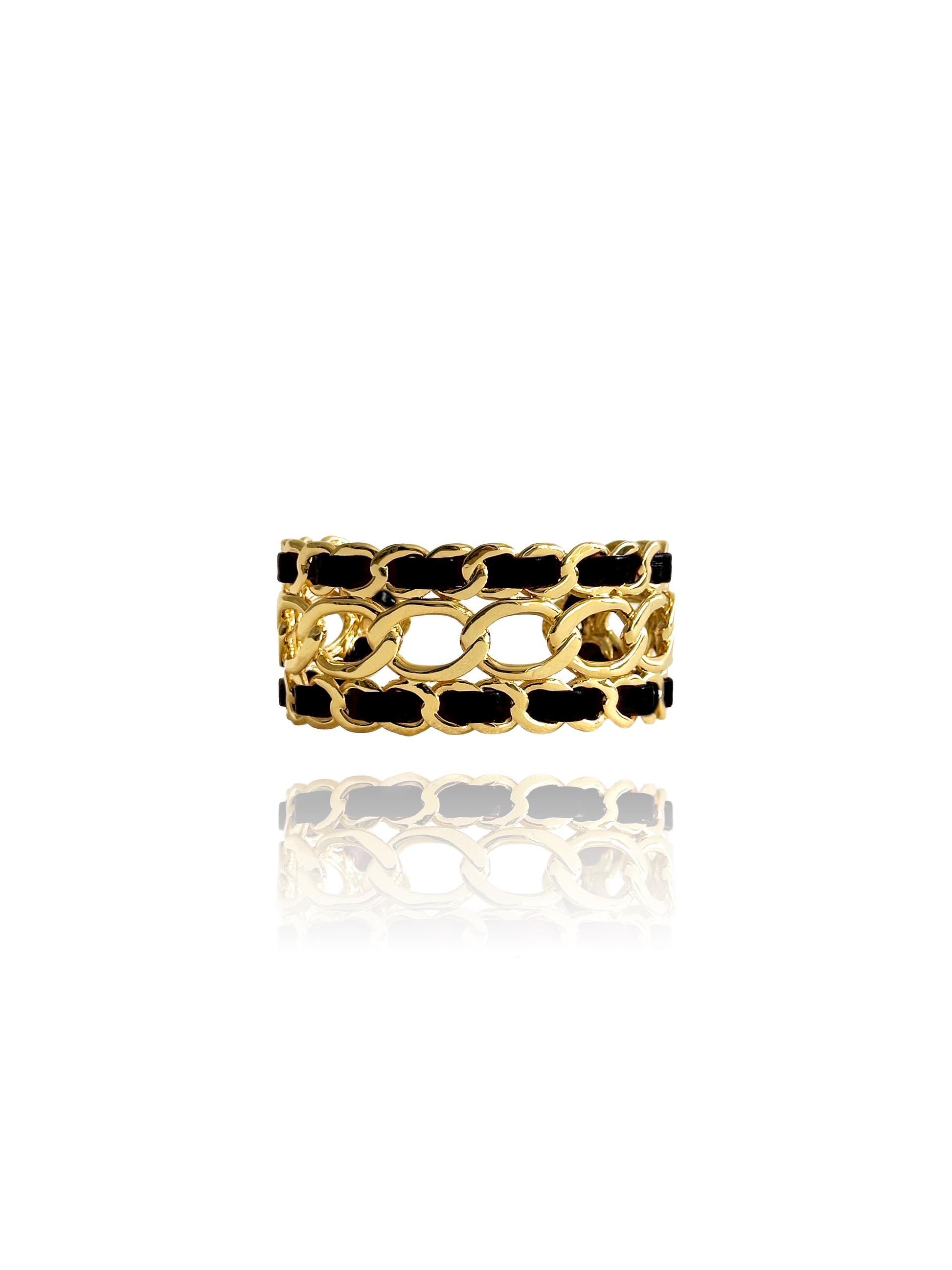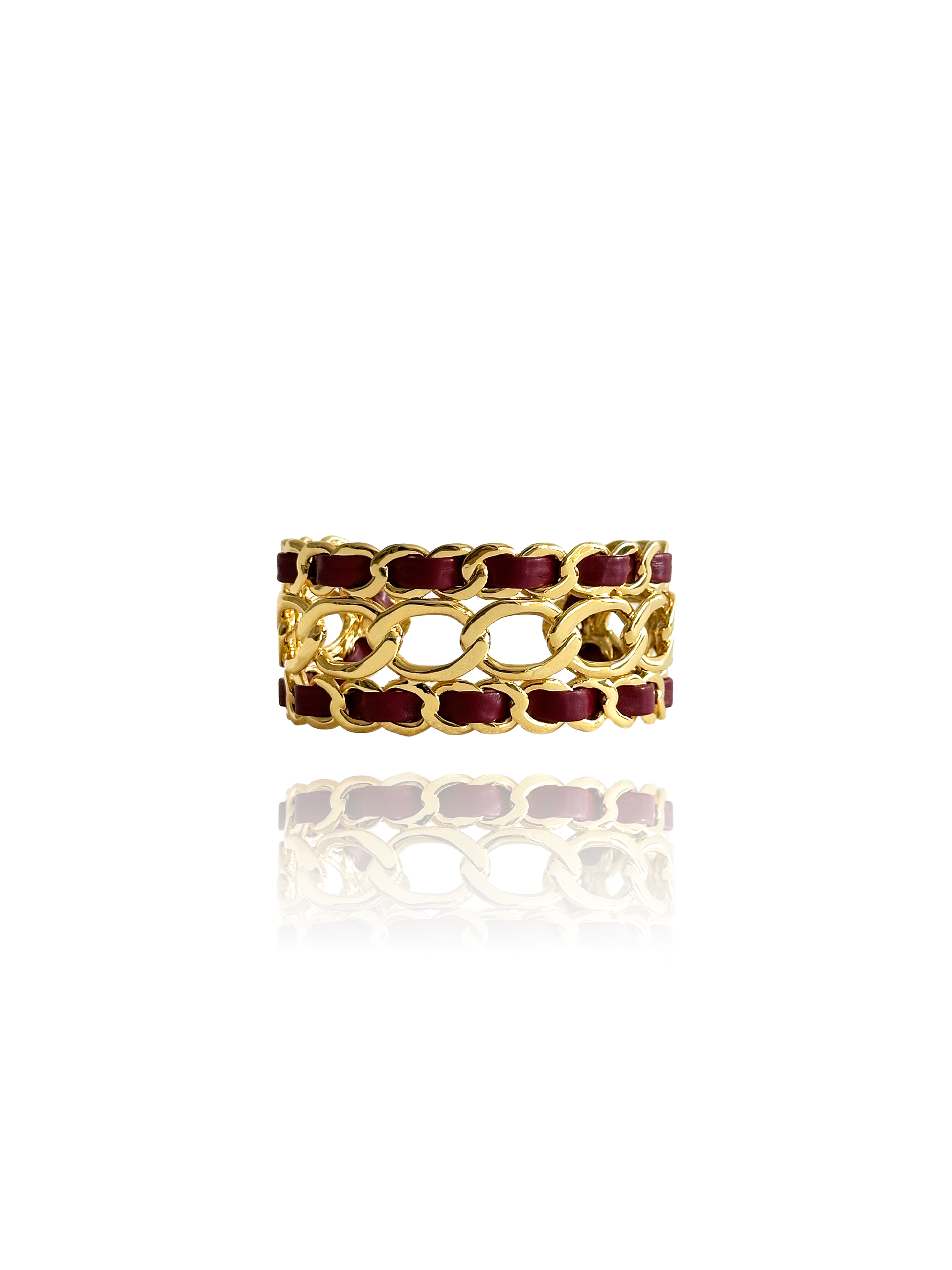 La petite manchette Décembre est notre nouveauté d’élégance de la saison Automne-Hiver 2025/26, faite de chaînes et tissée de simili-cuir et soie. Elle fait 3cm, est entièrement ajourée et est très légère.